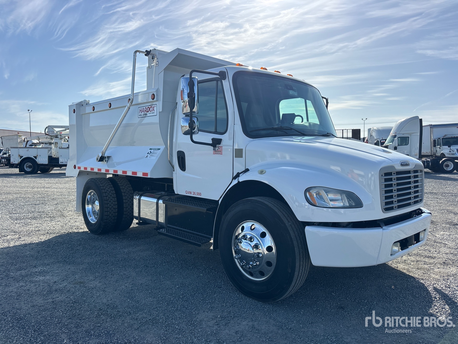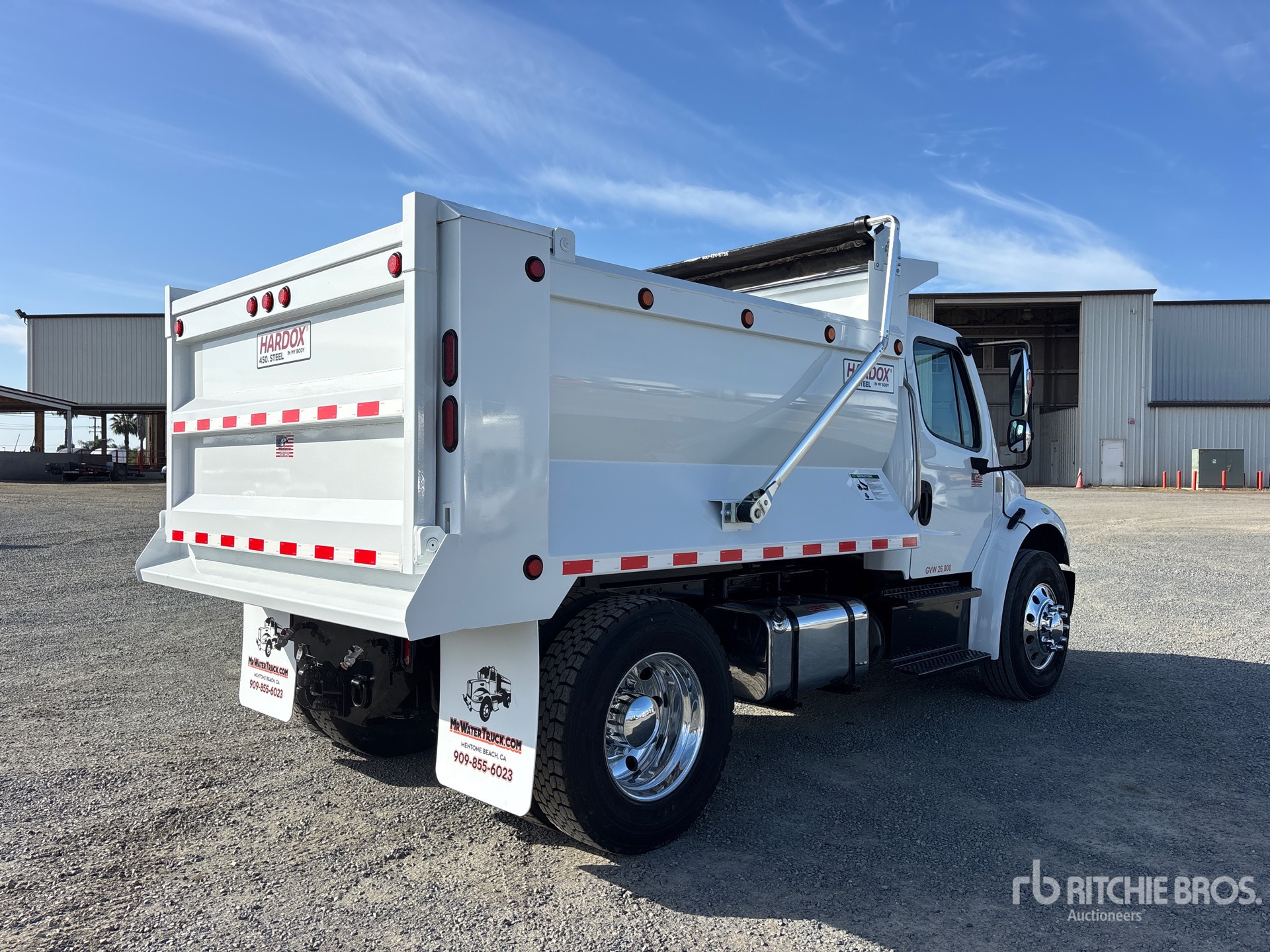 Cummins ISB 6 Cylinder 6.7 L Engine, 8572 Engine hrs, Exhaust Brake, Allison 2500 Automatic Transmission, 10000 lb Front Axle, 19000 lb Rears, Detroit DA-RS-19.0-4 Drive Axles, 5.56:1 Axle Ratio, 26000 lb GVWR, Air Ride Cab, Aluminum Outer Wheels, 11R22.5 Front Tires, 295/75R22.5 Rear Tires, Airliner Air Ride Suspension, 192 in Wheelbase, PTO, MEXLIFT 10 ft Long x 4 ft High Steel Body, Round Bottom, Electric Roll Tarp