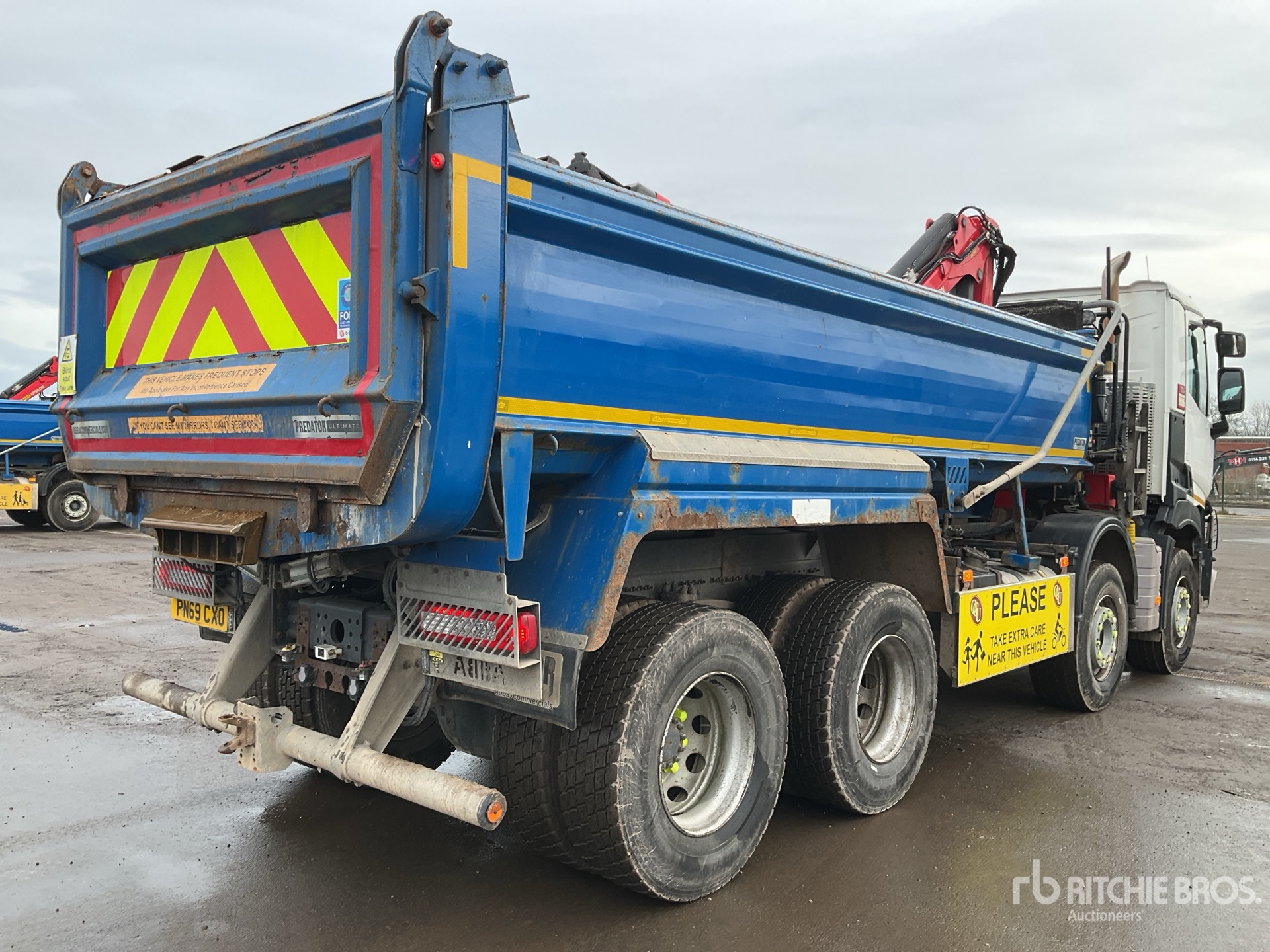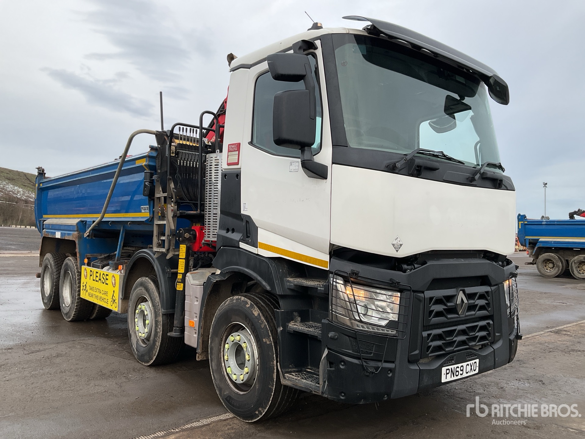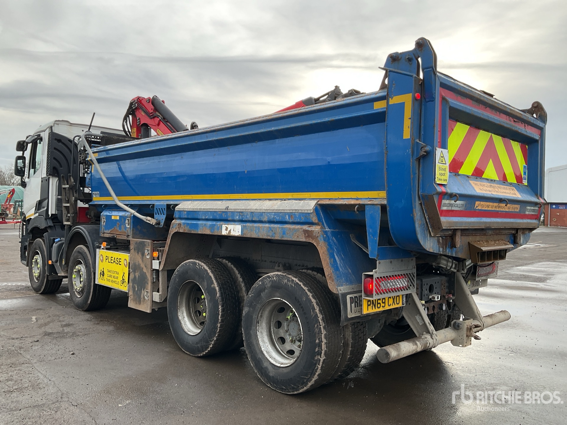 Volvo 6 Cylinder Diesel Engine, Requires AdBlue, Engine Brake, Automatic Transmission, Differential Lock, Right Hand Drive, 39000 kg GVWR, 385/65R22.5 Front Tires, 315/80R22.5 Rear Tires, Dual Steering Boxes, Spring Suspension, 2019 Palfinger Crane