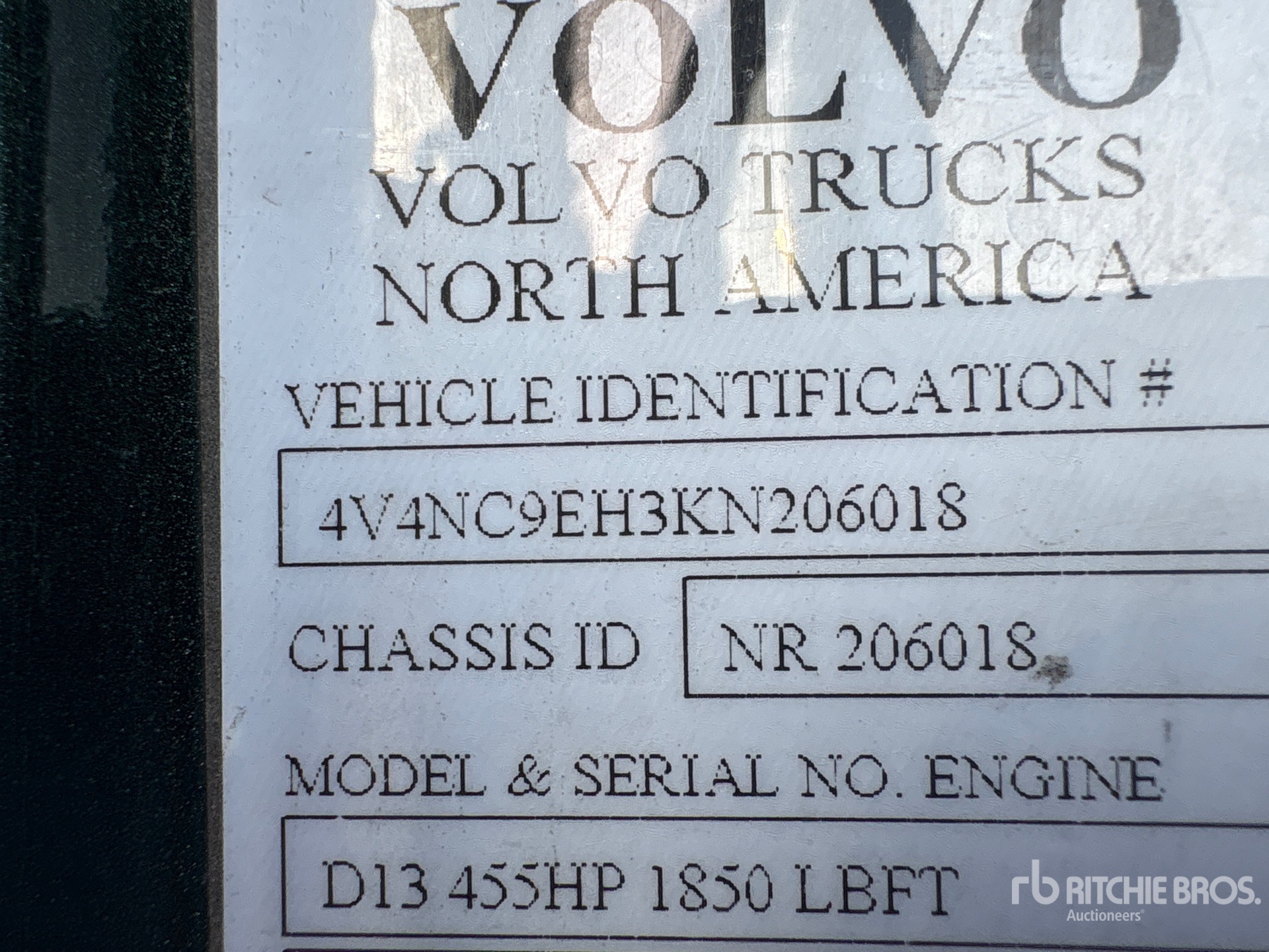 Volvo D13M 455 hp Engine, 2018 US EPA Label, 24464.9 Engine hrs, 13200 lb Front Axle, 19000 lb Rears, 51200 lb GVWR, 77 in High Rise Sleeper Cab, Bunk Beds, 210 in Wheelbase, Air Suspension, 295/75R22.5 Front Tires, 275/80R22.5 Rear Tires, Air Sliding 5th Wheel, Dual Fuel Tanks