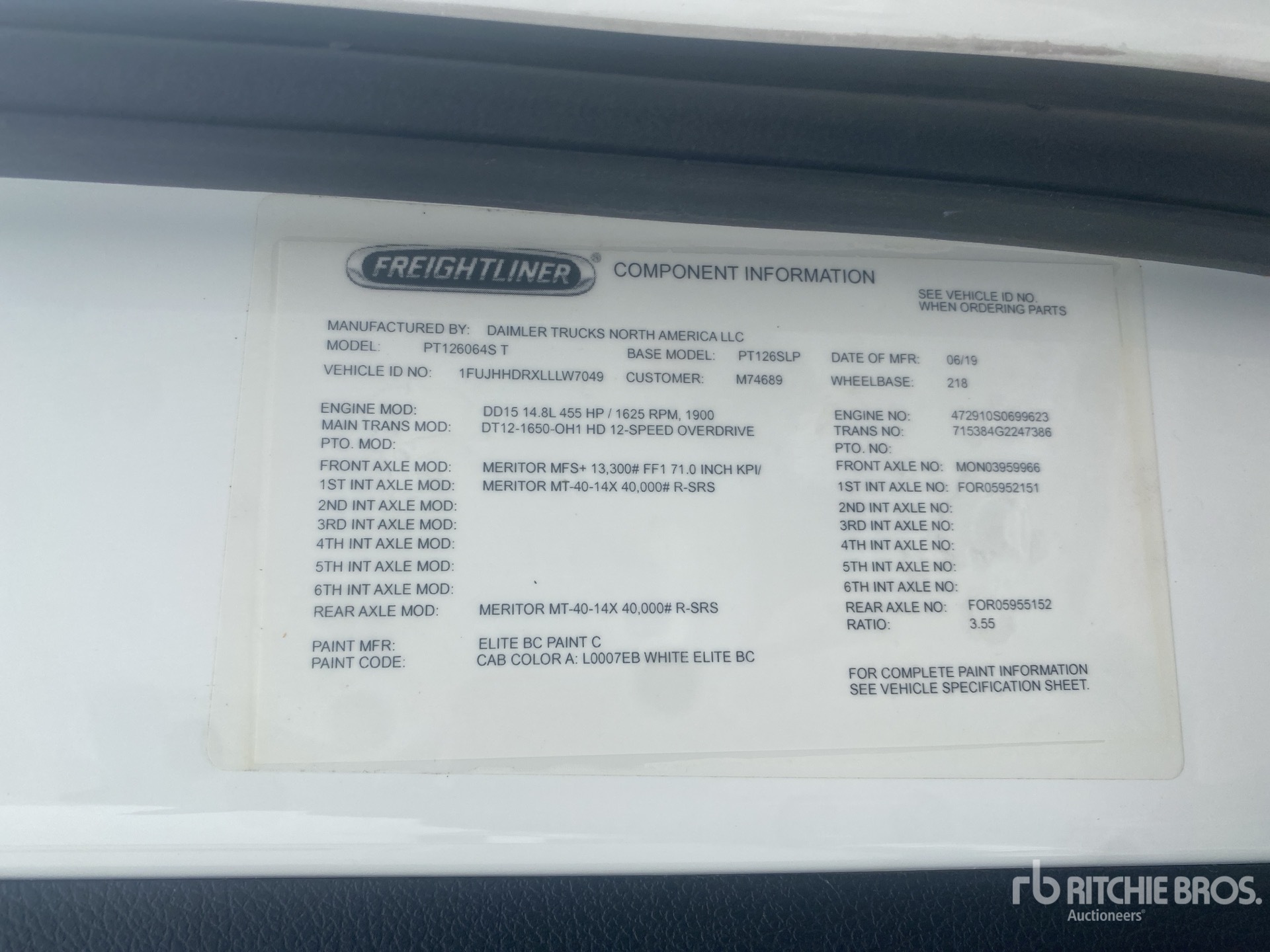 Detroit DD15 455 hp Engine, Detroit DT12-1650-OH1 12-Speed Automated Transmission, 13220 lb Front Axle, 40000 lb Rears, 53220 lb GVWR, Engine Brake, 60 in High Rise Sleeper Cab, Bunk Beds, 218 in Wheelbase, Air Suspension, Aluminum Wheels, 11R22.5, Air Sliding 5th Wheel, Dual Fuel Tanks
