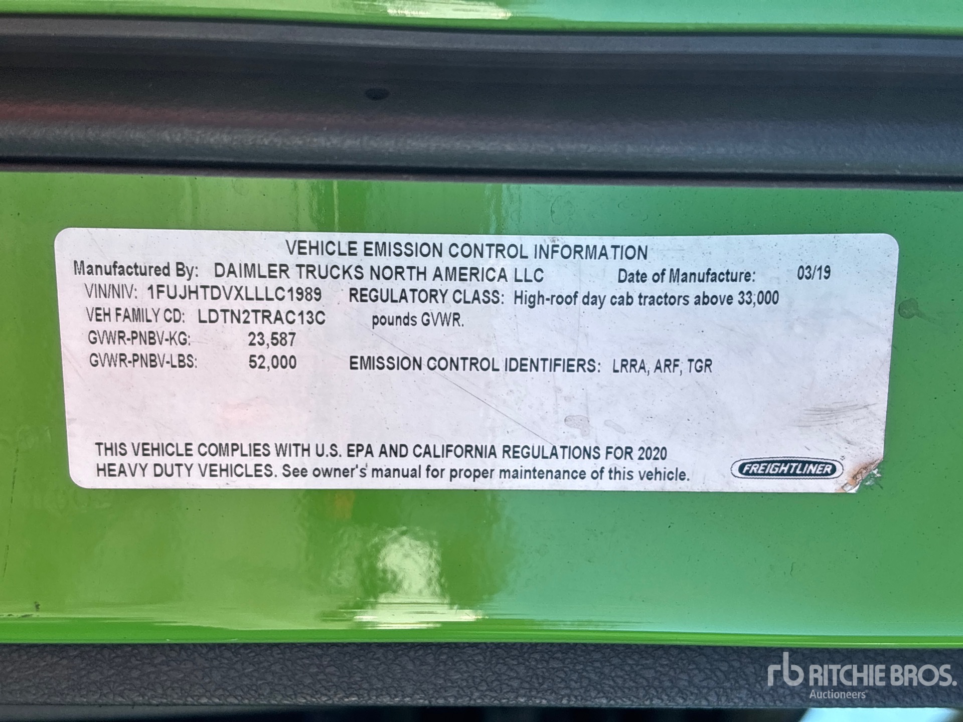 Detroit DD13 450 hp Engine, 2019 US EPA Label, 19391 Engine hrs, Detroit DT12-1550-OH1-8 HD 12-Speed Automated Transmission, 12000 lb Front Axle, 40000 lb Rears, 52000 lb GVWR, Engine Brake, 168 in Wheelbase, Air Suspension, Aluminum Wheels, 11R22.5, Air Sliding 5th Wheel, Dual Fuel Tanks