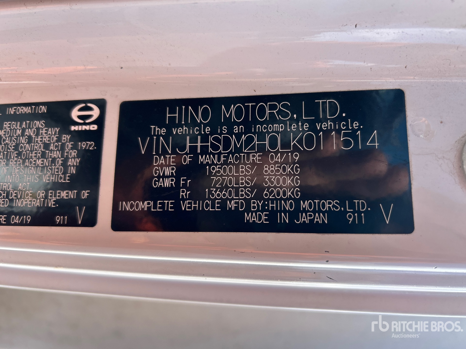 Hino J05E-TP 4 Cylinder 5.1 L Diesel 210 hp Engine, 2019 US EPA Label, Requires Diesel Exhaust Fluid, Automatic Transmission, 7270 lb Front Axle, 13660 lb Rears, 19500 lb GVWR, 225/70R19.5, Spring Suspension, 171 in Wheelbase, Morgan 20 ft x 96 in Wide x 92 in High Body