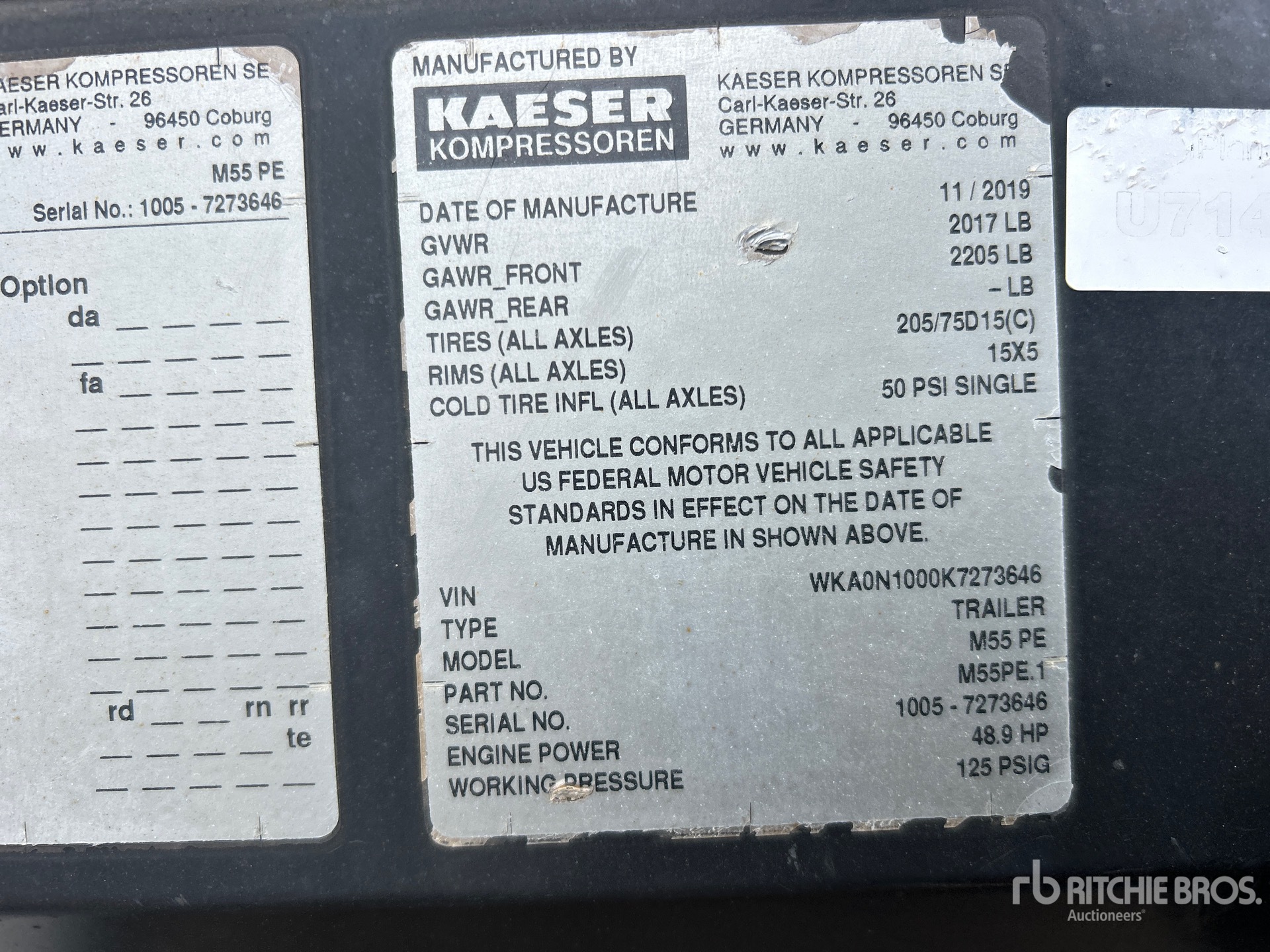 125 psi Working Pressure, 2019 US EPA Label, Kubota 3 Cylinder 36.5 kW 1.8 L Diesel Engine, Lunette Ring Carrier Trailer