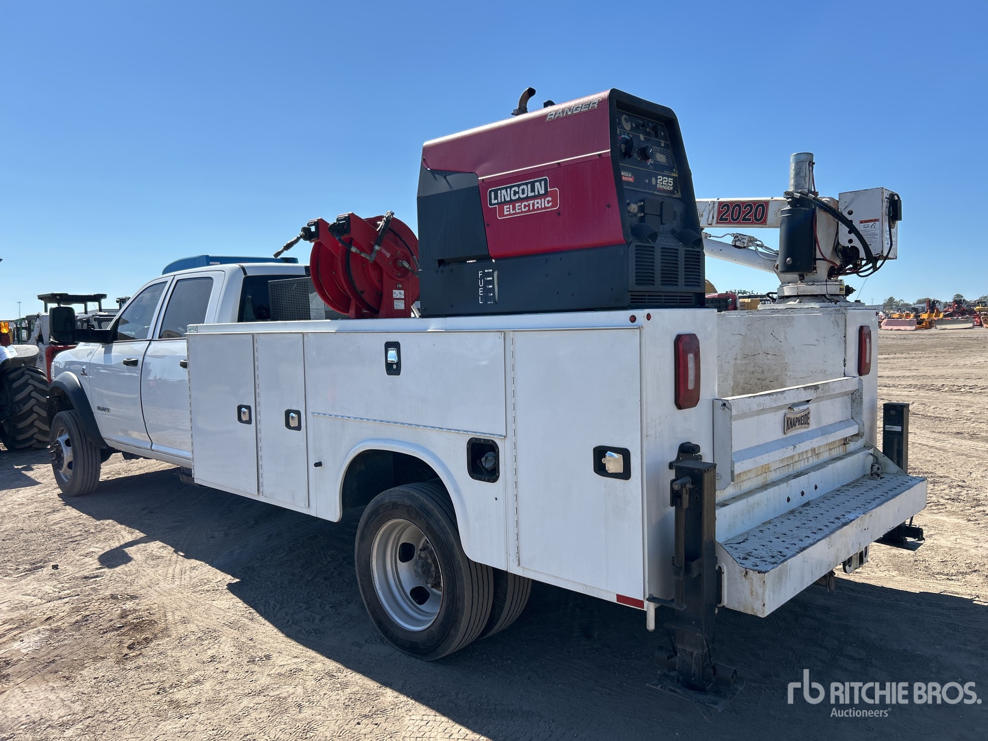 Located in Lane 93 Spot 7, Cummins 6 Cylinder 6.7 L Diesel Engine, 2019 US EPA Label, CARB Compliant, Requires Diesel Exhaust Fluid, Automatic Transmission, 7250 lb Front Axle, 13500 lb Rears, 19500 lb GVWR, 225/70R19.5, Spring Suspension, 196 in Wheelbase, PTO, Knapheide 11 ft Body, Manual Stabilizers, 2009 IMT 2020 5000 lb 3 Section Electric Crane, Wireless Remote Control, Lincoln Generator Set, Hydraulic Air Compressor, Air Hose Reel, Lincoln 225 Ranger 10500 kW 225 A Gasoline Welder