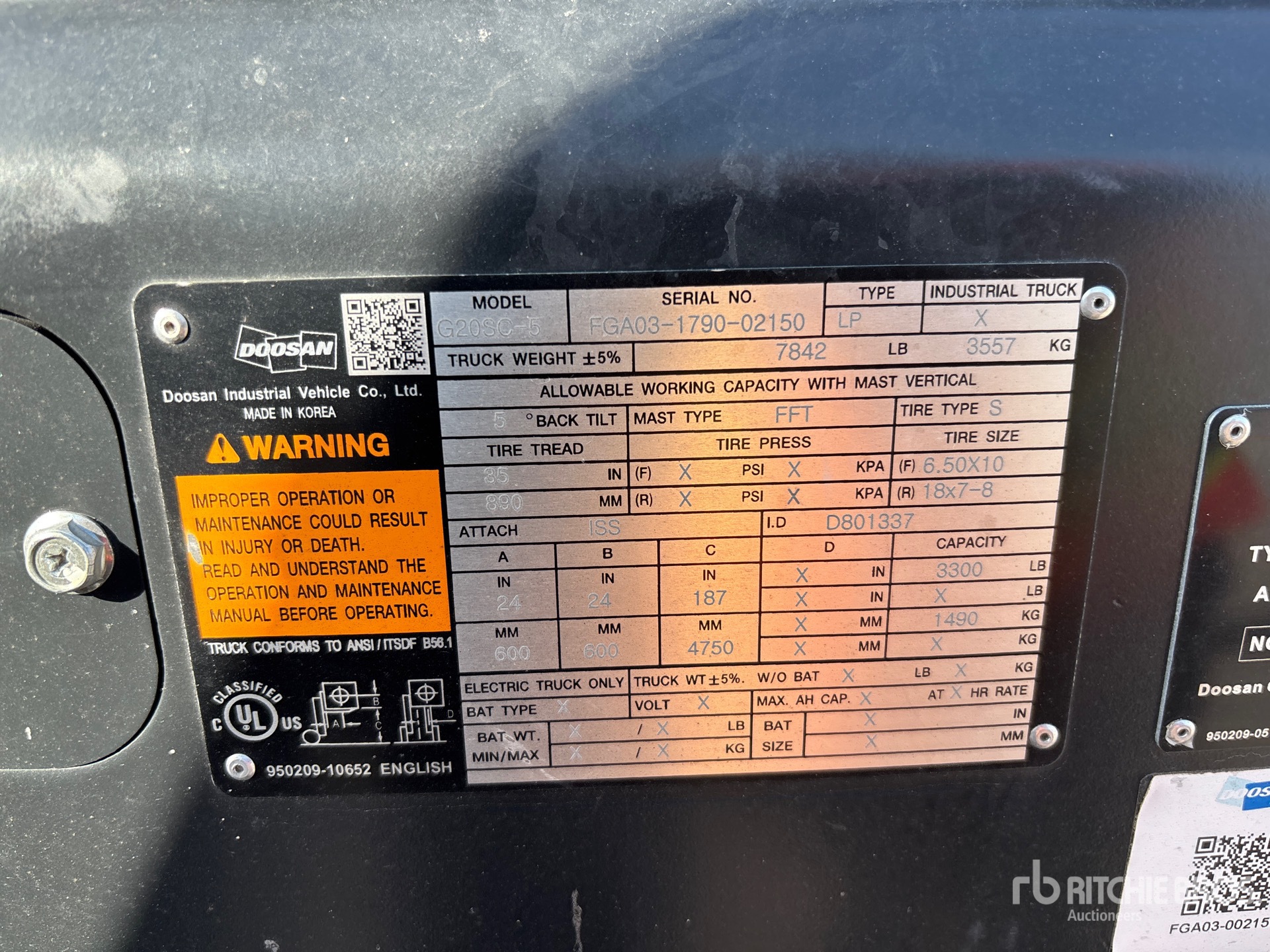 The detailed equipment information is limited in scope, and Ritchie Bros. Auctioneers has not inspected any aspects or components of the equipment other than those expressly set forth herein. Unless expressly stated, we make no representations or warranties, express or implied, concerning the equipment or its components, including without limitation any representations or warranties concerning functionality, conformity or compliance with any safety standard or requirement of any applicable authority or regulatory body, fitness for any particular purpose, or merchantability. You are strongly advised to perform your own detailed inspection of the equipment prior to bidding.