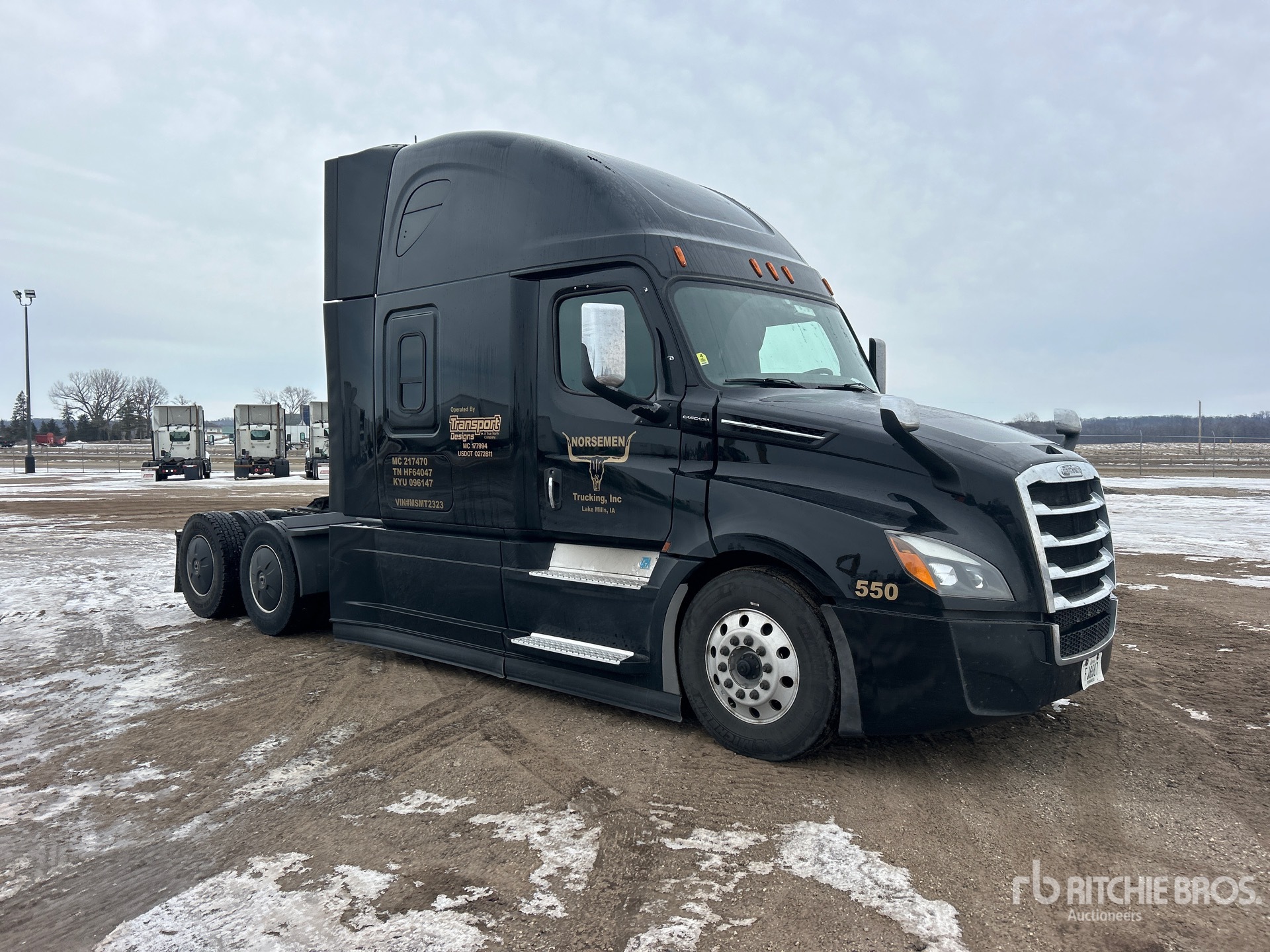 Detroit DD15 455 hp Engine, 24584 Engine hrs, Detroit DT12-1750-OHE 12-Speed Automated Transmission, 13300 lb Front Axle, 40000 lb Rears, 53300 lb GVWR, Engine Brake, 60 in High Rise Sleeper Cab, 227 in Wheelbase, Air Suspension, Aluminum Wheels, 295/75R22.5 Front Tires, 275/80R22.5 Rear Tires, Air Sliding 5th Wheel, Dual Fuel Tanks