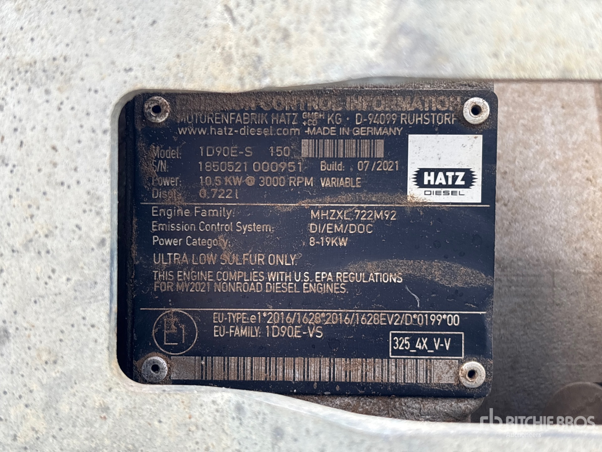 2021 US EPA Label, Hatz 1D90E-S 150 10.5 kW 0.722 L Diesel Engine