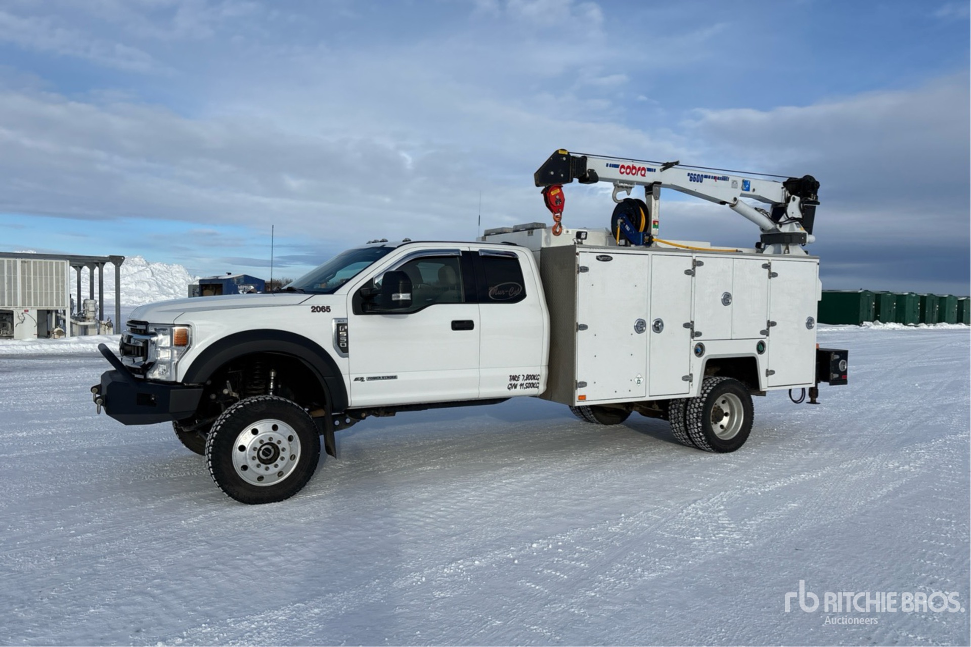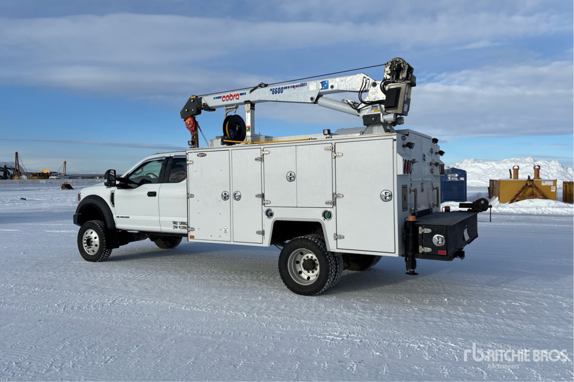 6.7 L Diesel Engine, 2021 US EPA Label, Requires Diesel Exhaust Fluid, Engine Coolant Heater, Eberspacher Engine Coolant Heater, 4617 Engine hrs, Exhaust Brake, Automatic Transmission, 6500 lb Front Axle, 14706 lb Rears, 19500 lb GVWR, Aluminum Wheels, 245/70R19.5 Front Tires, 245/70R19.5 Rear Tires, 192 in Wheelbase, PTO, Brutus 11 ft 6 in Body, Hydraulic Stabilizers, Cobra 6600 Crane, Wireless Remote Control, VMAC 70 cfm Air Compressor, Air Hose Reel, Lincoln Ranger 260MPX 9500 W 260 A Gasoline Welder, Oil Recovery System, Lift Kit, Complete-Retirement-Dispersal-for-Mur-Cal-Services-Ltd