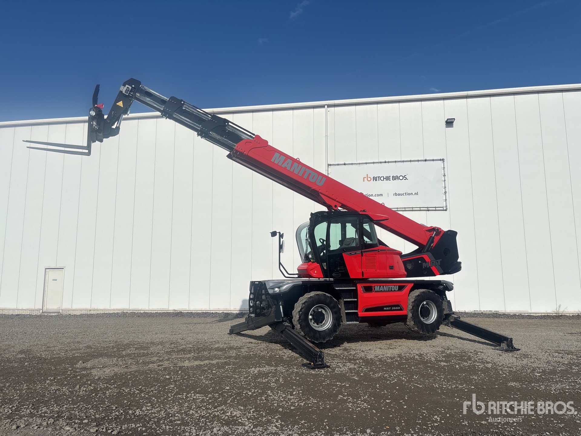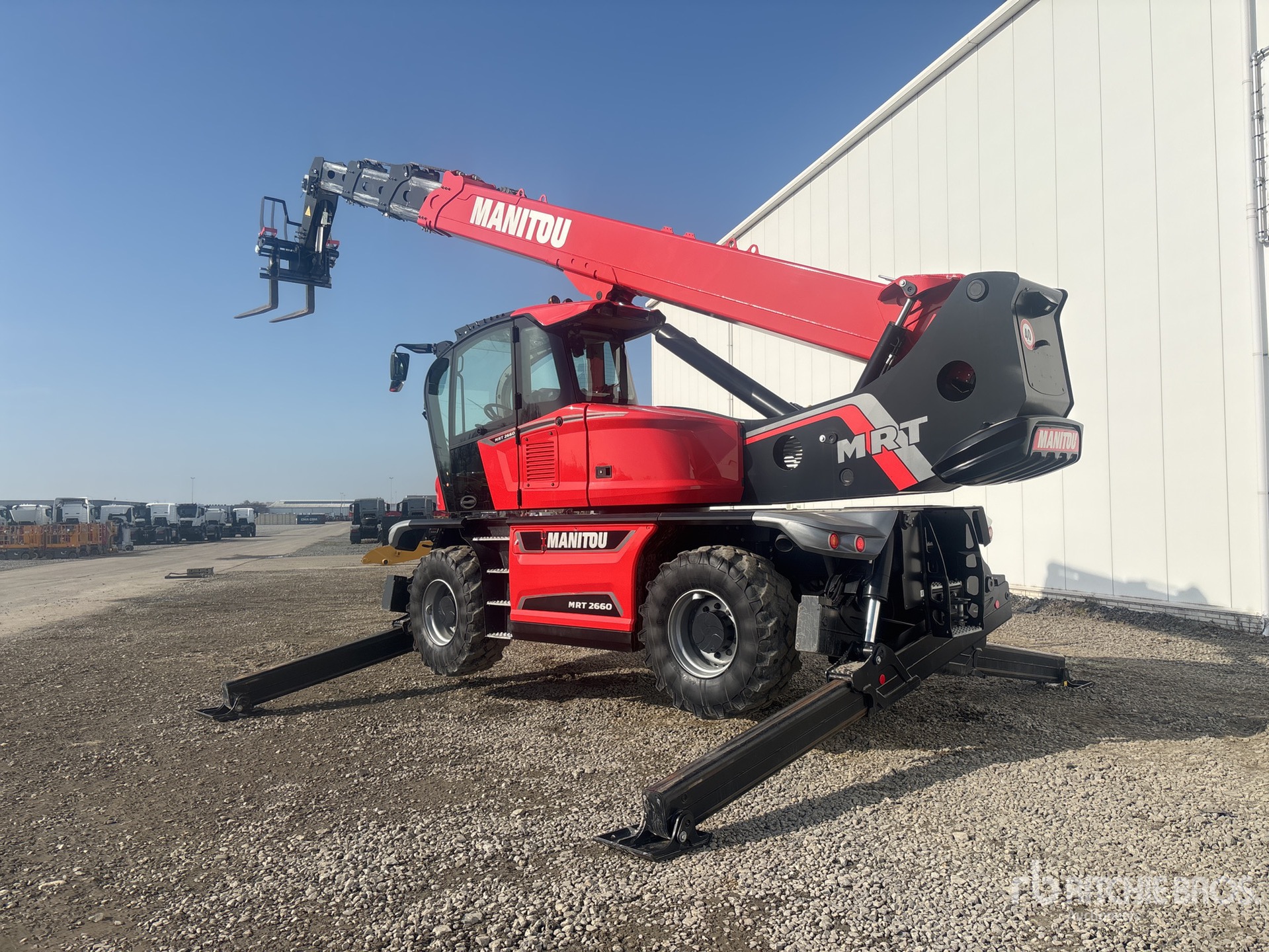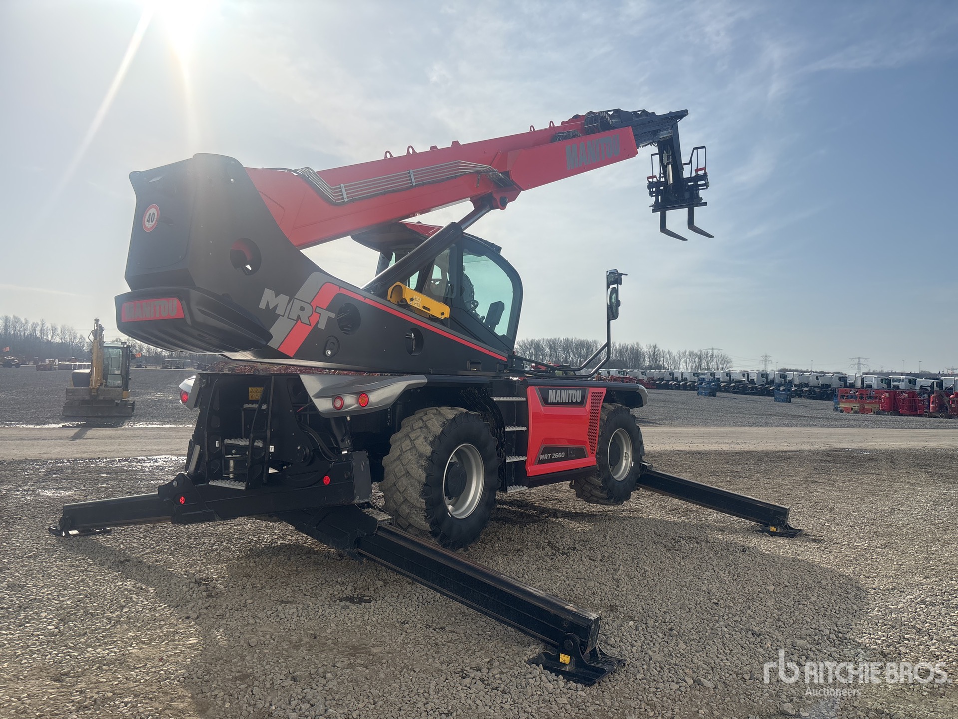 Enclosed Cab, Air Conditioner, Rear View Camera, Remote Control, Load Moment Indicator, 1200 mm Forks, Manual Coupler, Outriggers, Frame Leveling, Auxiliary Hydraulic Plumbing, 445/65-22.5 Tires