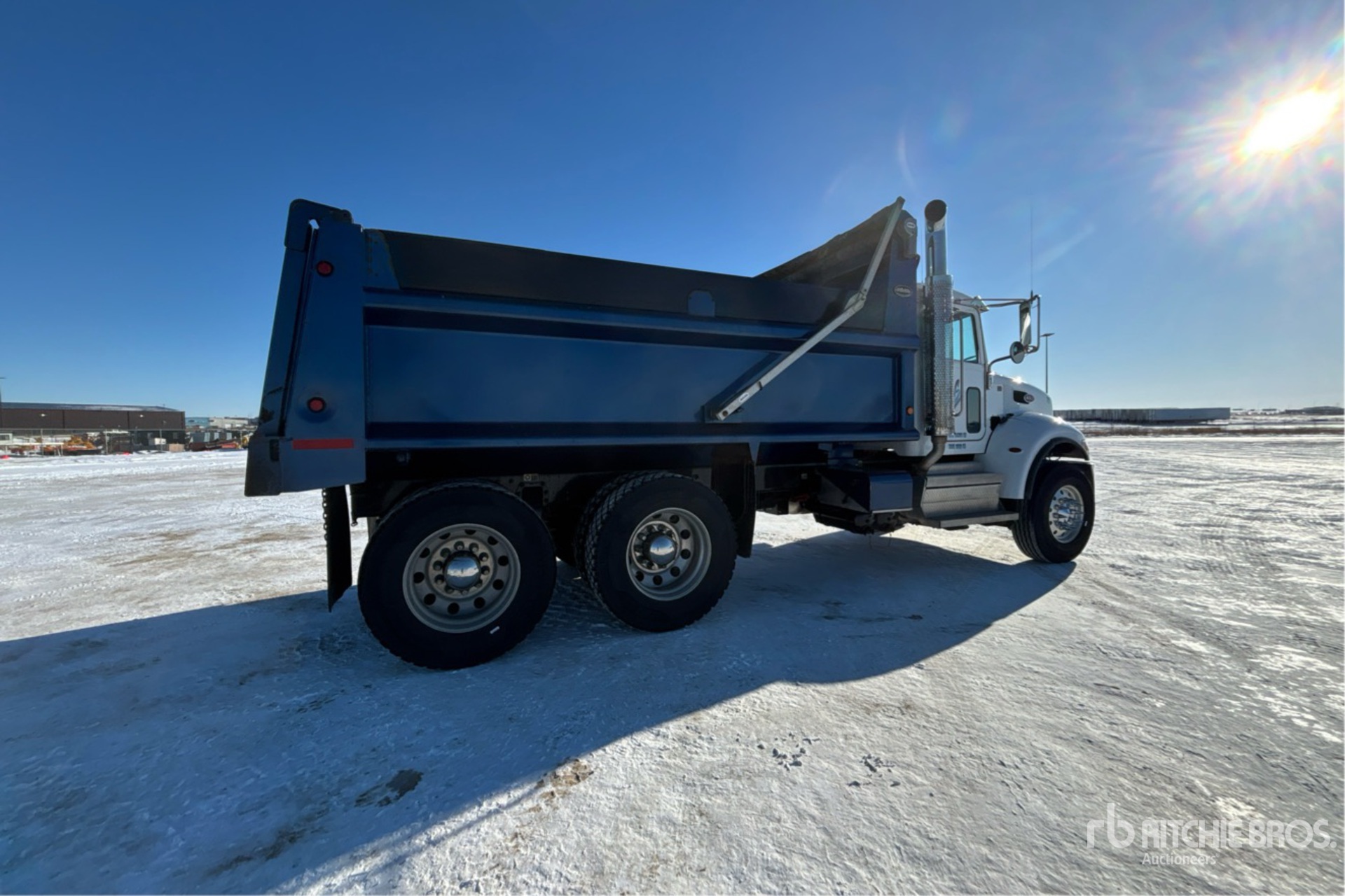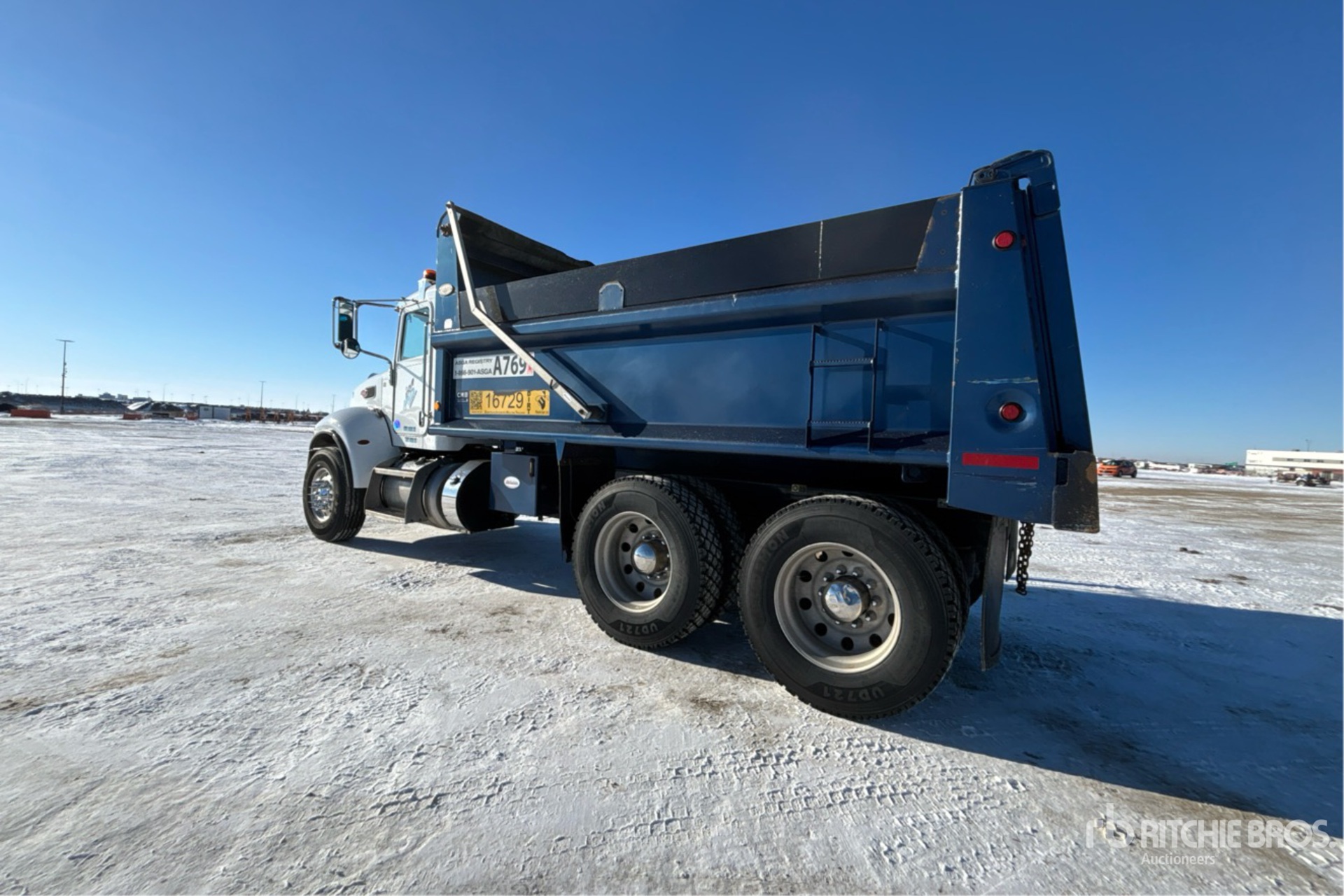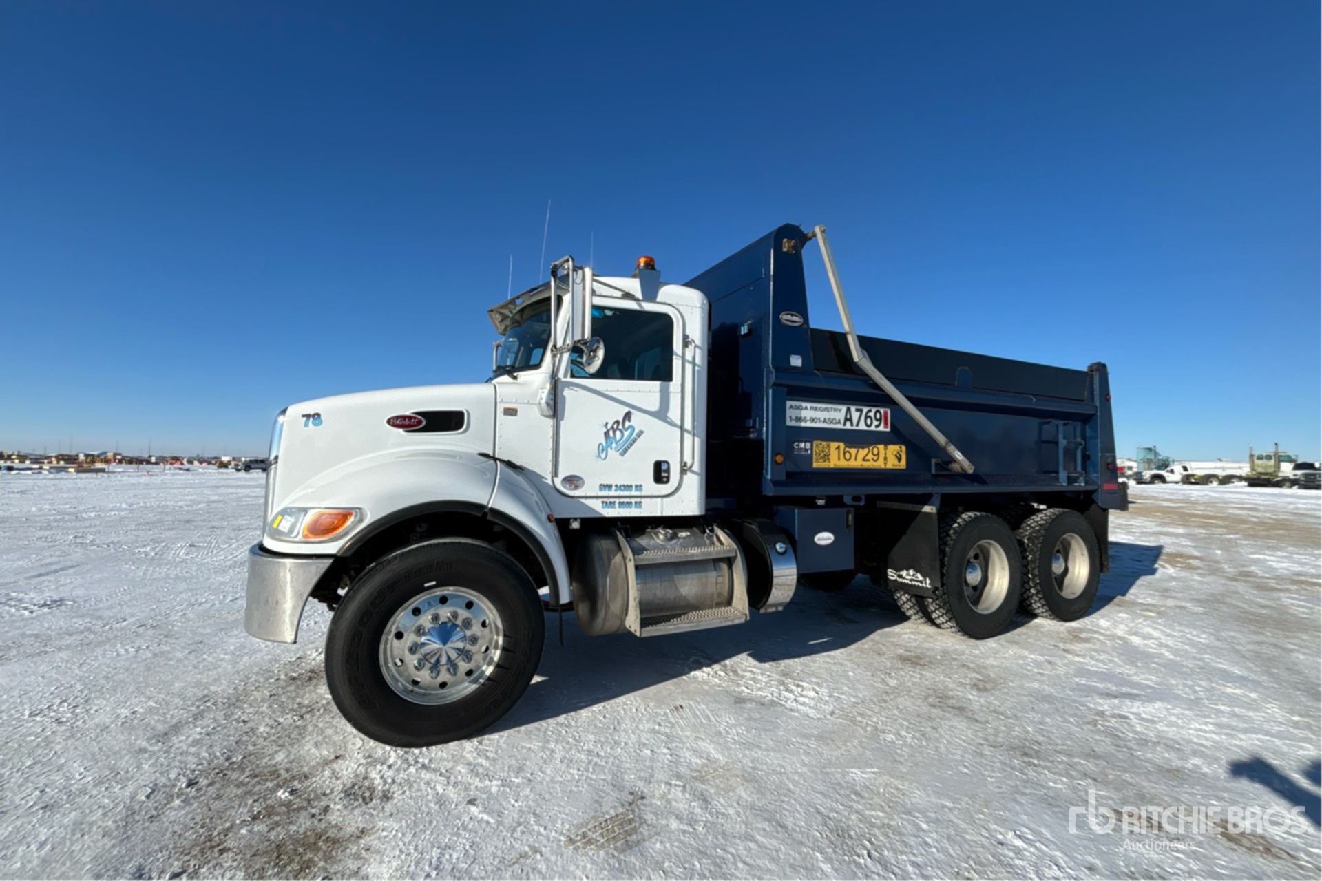 Paccar PX-9 6 Cylinder 8.9 L Diesel 330 hp Engine, 2021 US EPA Label, CARB Compliant, Requires Diesel Exhaust Fluid, 7315 Engine hrs, Engine Brake, Allison 6-Speed Automatic Transmission, Double Differential Locks, 14600 lb Front Axle, 40000 lb Rears, 54600 lb GVWR, Aluminum Wheels, 315/80R22.5 Front Tires, 11R24.5 Rear Tires, Air Trac Air Ride Suspension, 202 in Wheelbase, PTO, Summit 15 ft Long x 4 ft High Steel Body, Electric Roll Tarp, Complete-Dispersal-for-ABS-Trucking