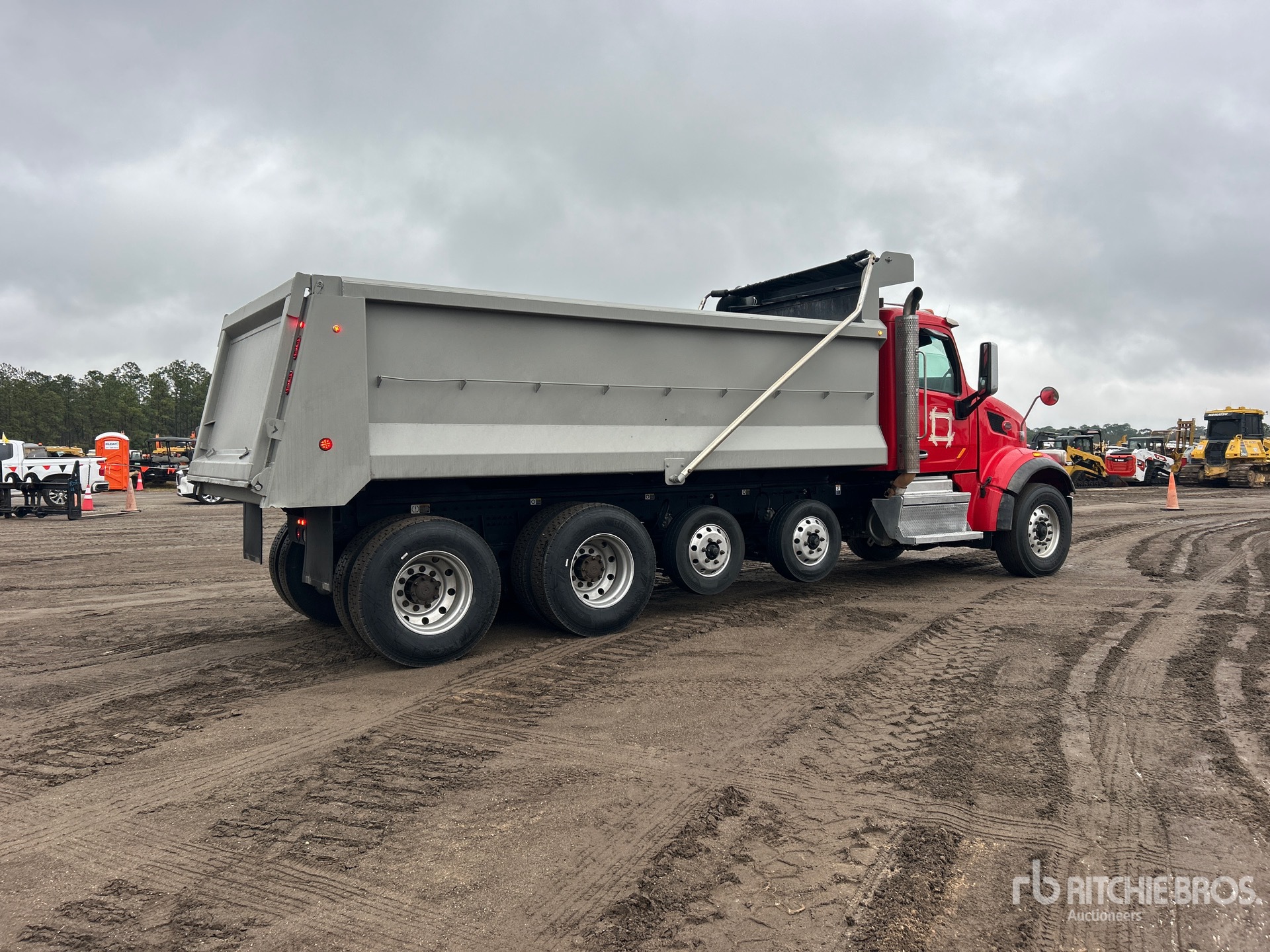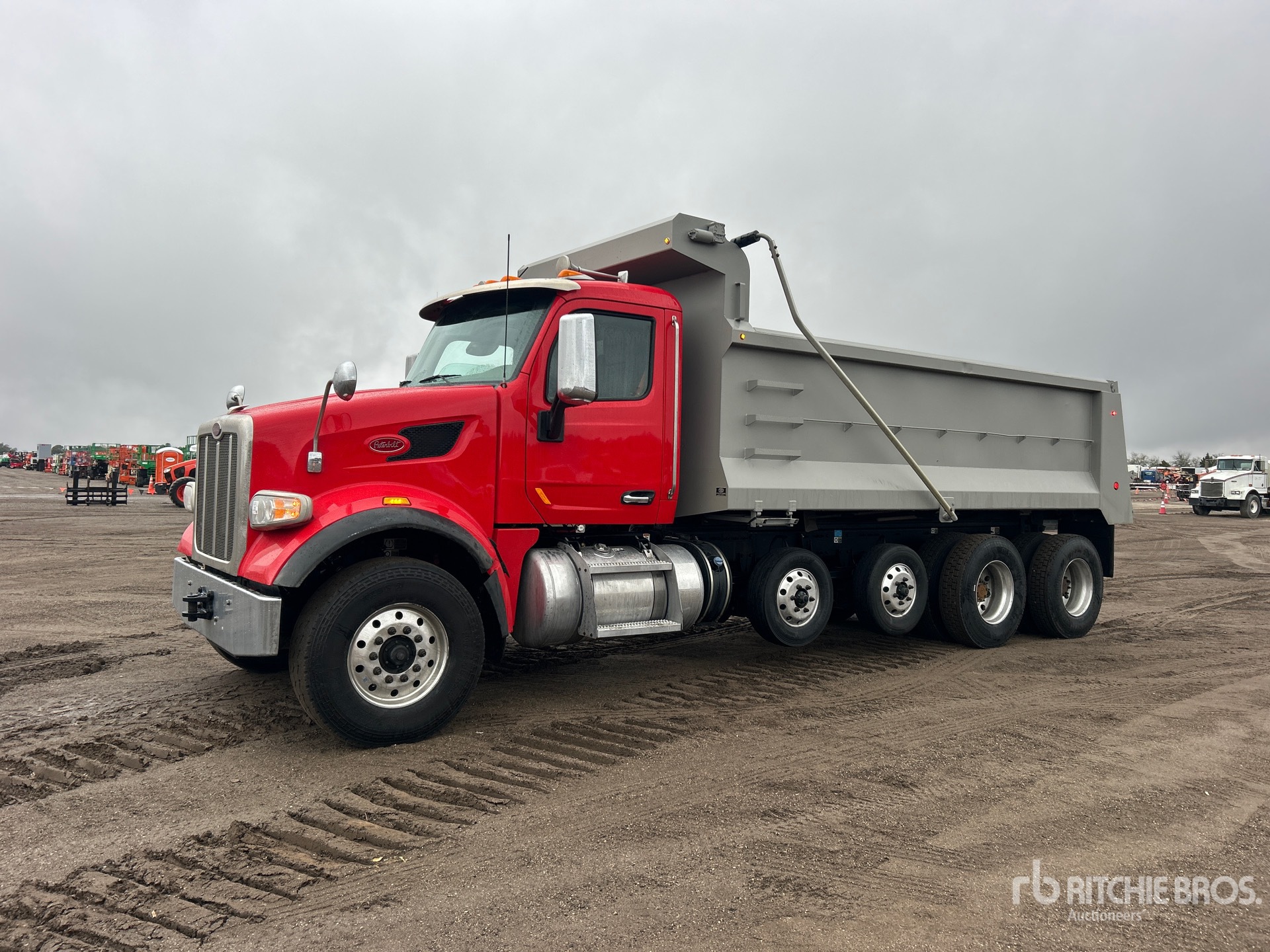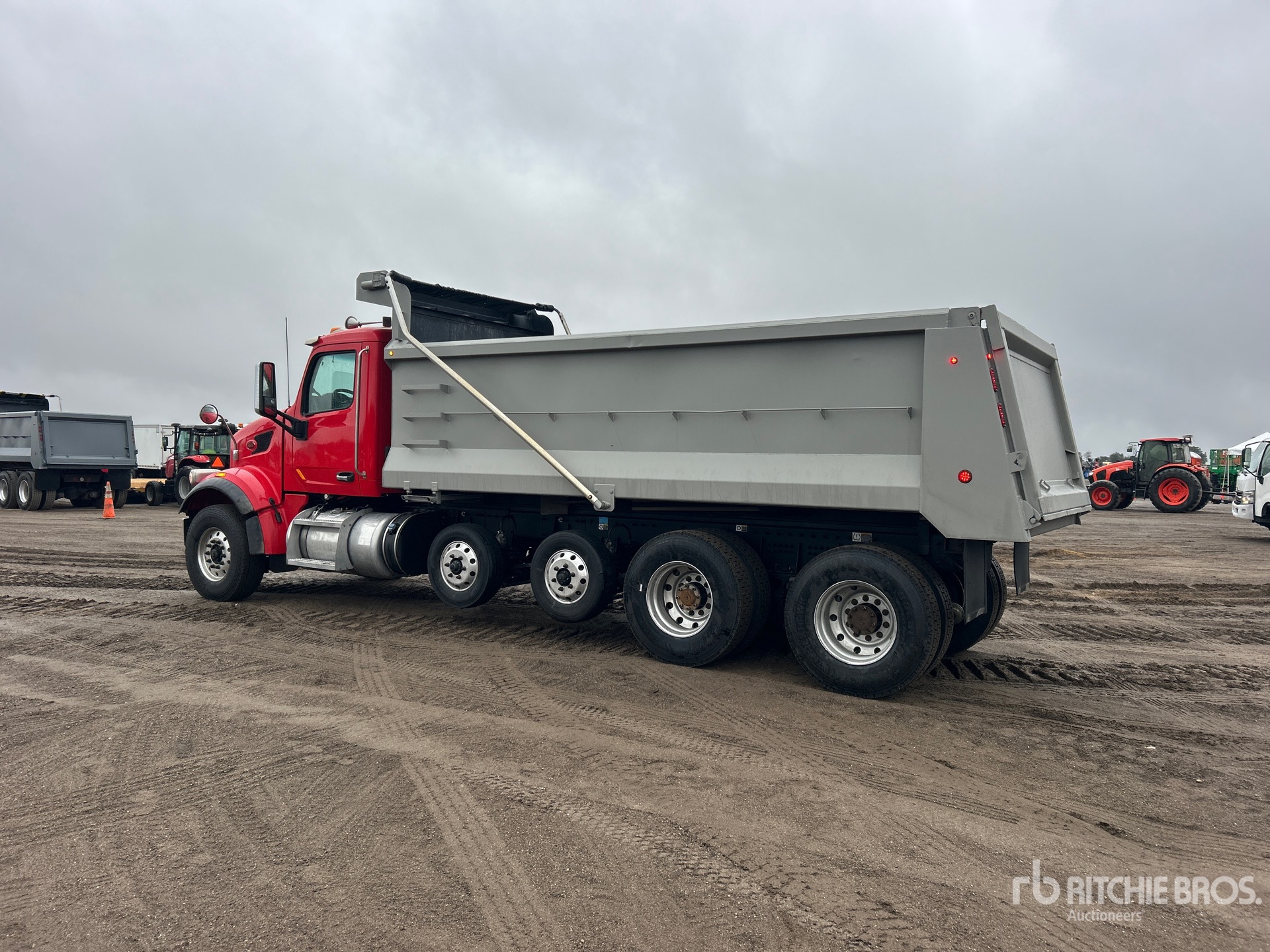 Paccar MX-13 6 Cylinder 12.9 L Diesel 455 hp Engine, 2021 US EPA Label, Requires Diesel Exhaust Fluid, 11401 Engine hrs, Engine Brake, Allison 4500 Automatic Transmission, Double Differential Locks, 20000 lb Front Axle, 44000 lb Rears, 72000 lb GVWR, Air Ride Cab, Aluminum Wheels, 315/80R22.5 Front Tires, 11R22.5 Rear Tires, 2 Steerable Air Lift Pusher Axle, Dual Steering Boxes, Double Frame, Rubber over Walking Beam Suspension, 258 in Wheelbase, PTO, Tebco 19 ft Long x 4 ft 6 in High Steel Body, Bed Vibrator, Electric Roll Tarp