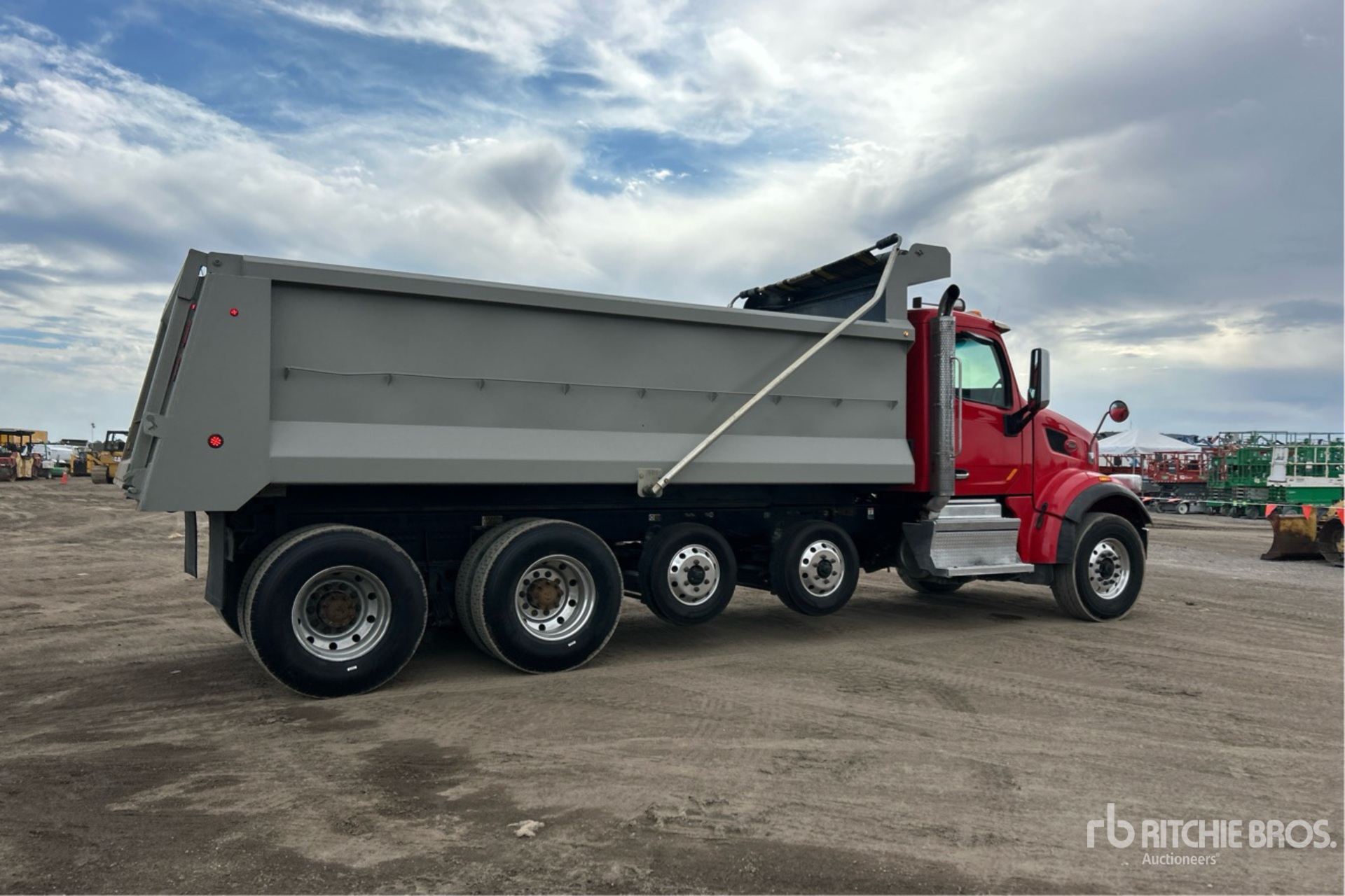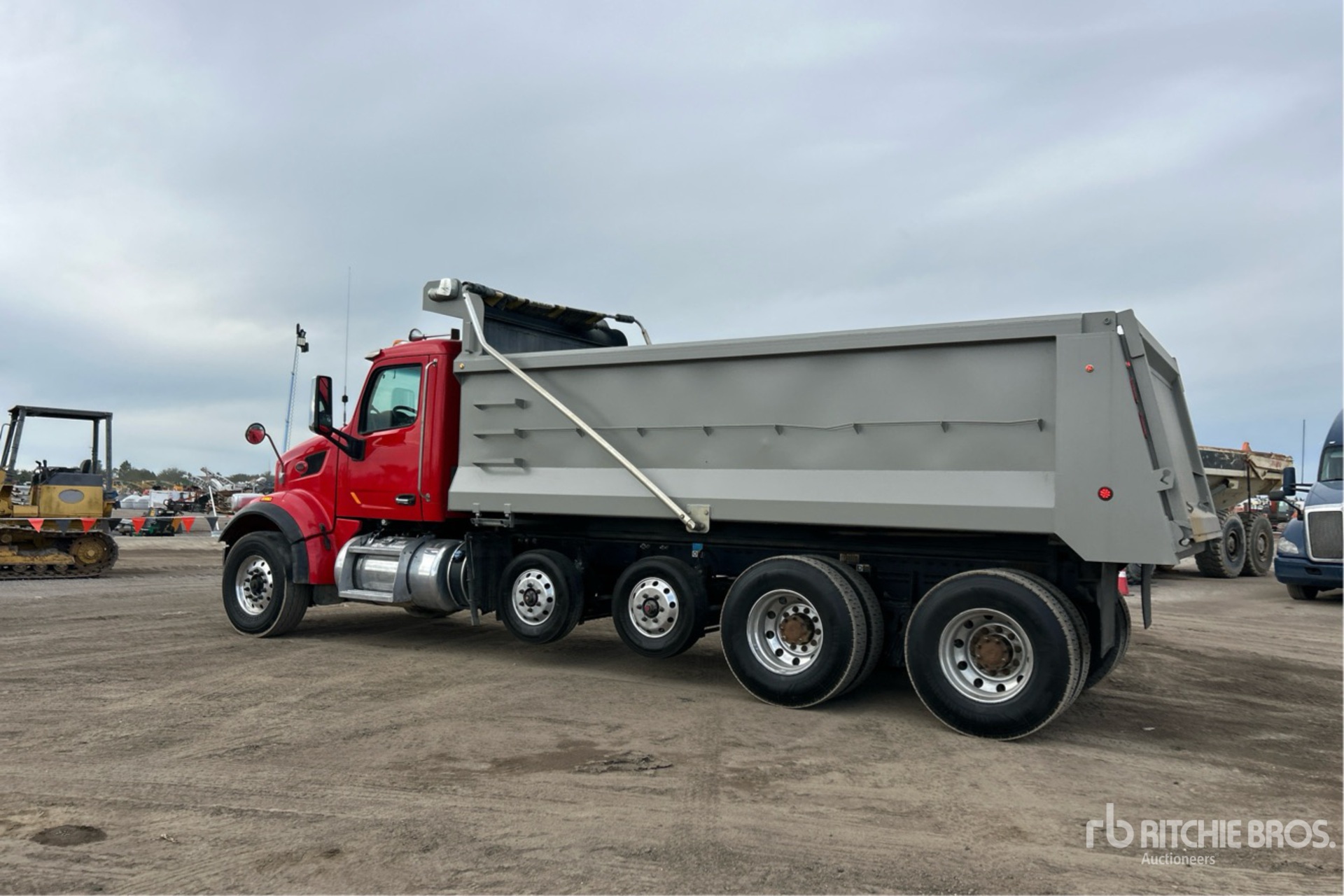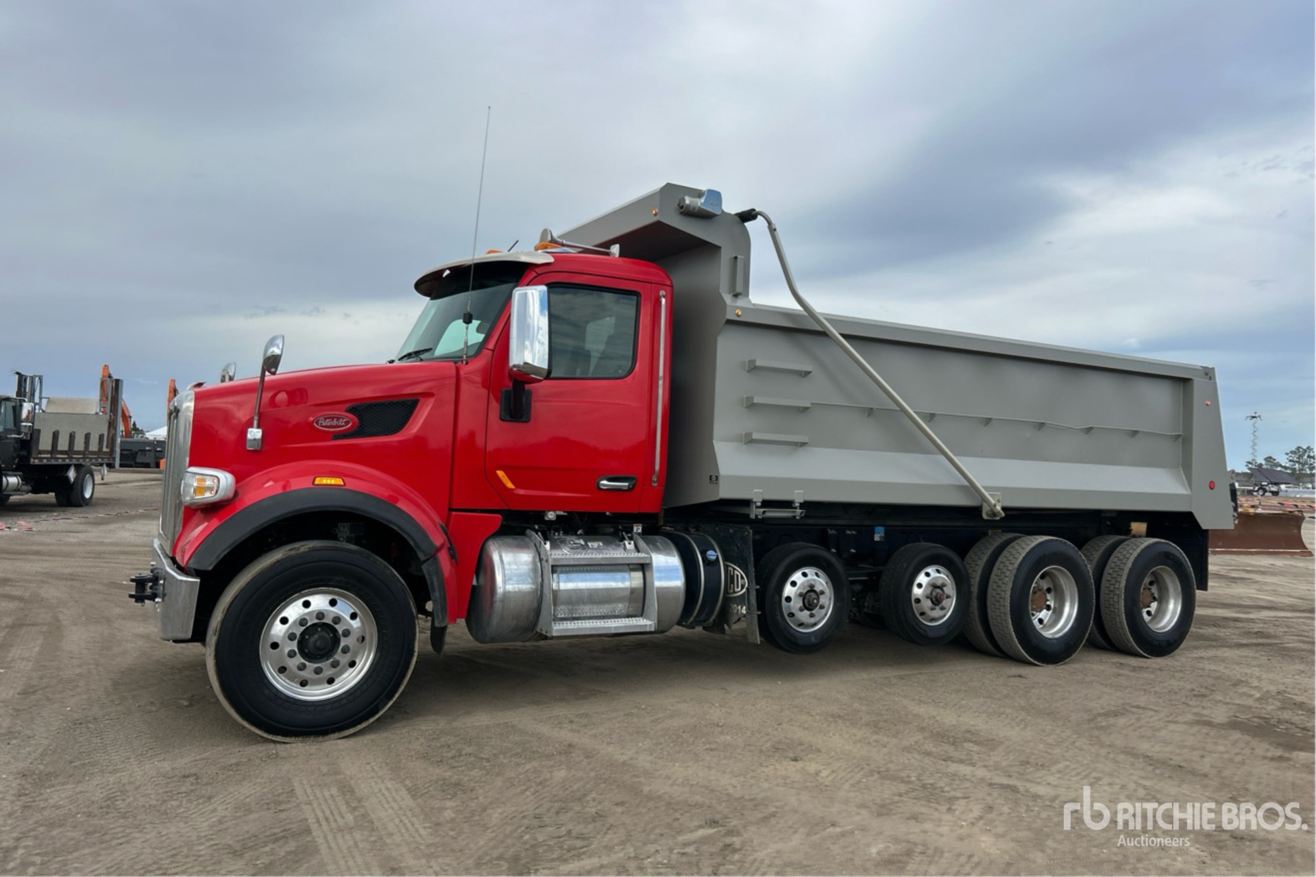 Paccar MX-13 6 Cylinder 12.9 L Diesel 455 hp Engine, 2020 US EPA Label, CARB Compliant, Requires Diesel Exhaust Fluid, 10910 Engine hrs, Engine Brake, Allison 6-Speed Automatic Transmission, Differential Lock, 20000 lb Front Axle, 44000 lb Rears, Meritor Drive Axles, Air Ride Cab, Aluminum Wheels, 315/80R22.5 Front Tires, 11R22.5 Rear Tires, 2 Steerable Air Lift Pusher Axle, Dual Steering Boxes, Double Frame, Hendrickson Haulmaax EX Rubber over Walking Beam Suspension, 258 in Wheelbase, PTO, Tedco 19 ft 1 in Long x 4 ft 4 in High Steel Body, Electric Roll Tarp