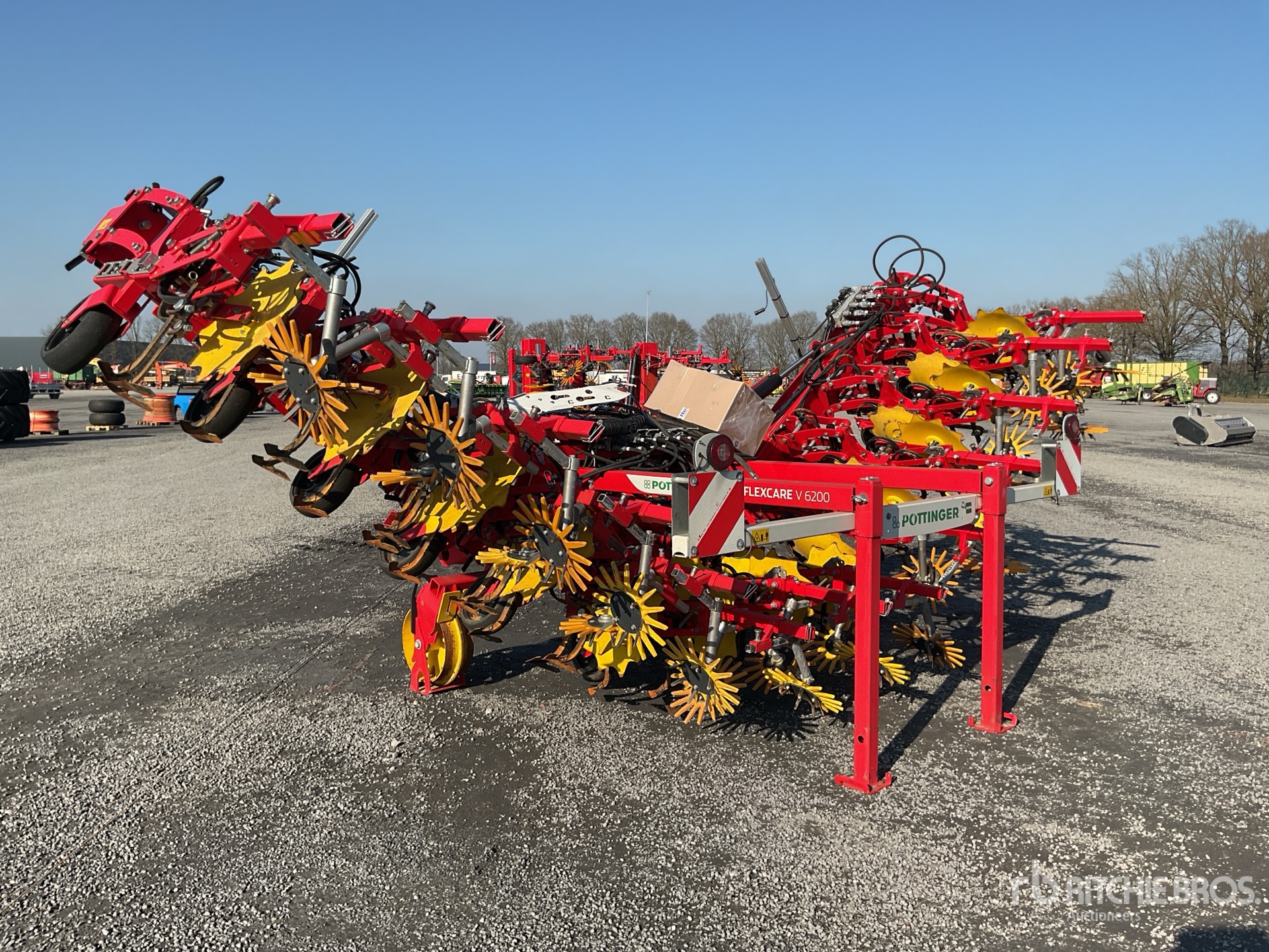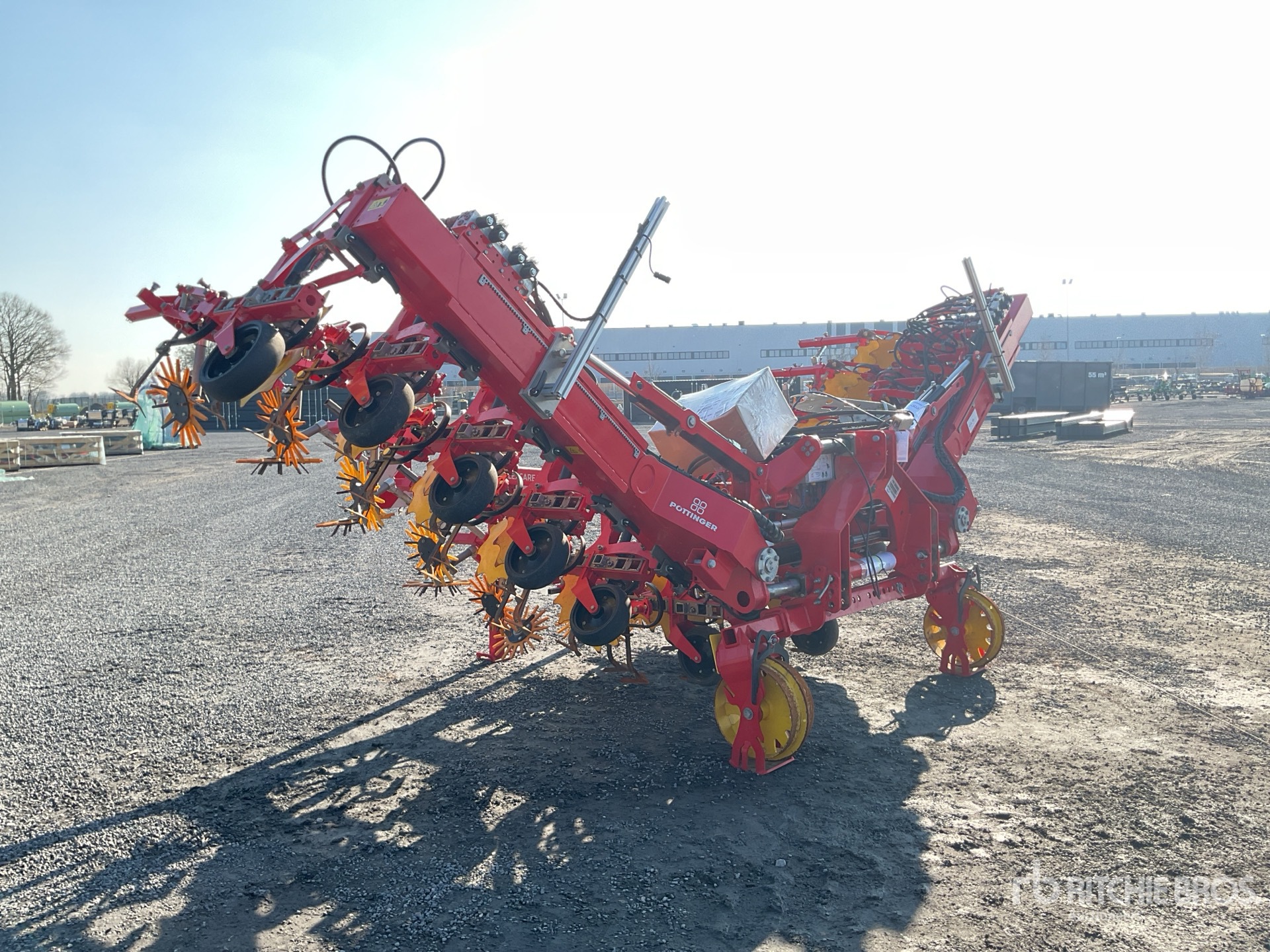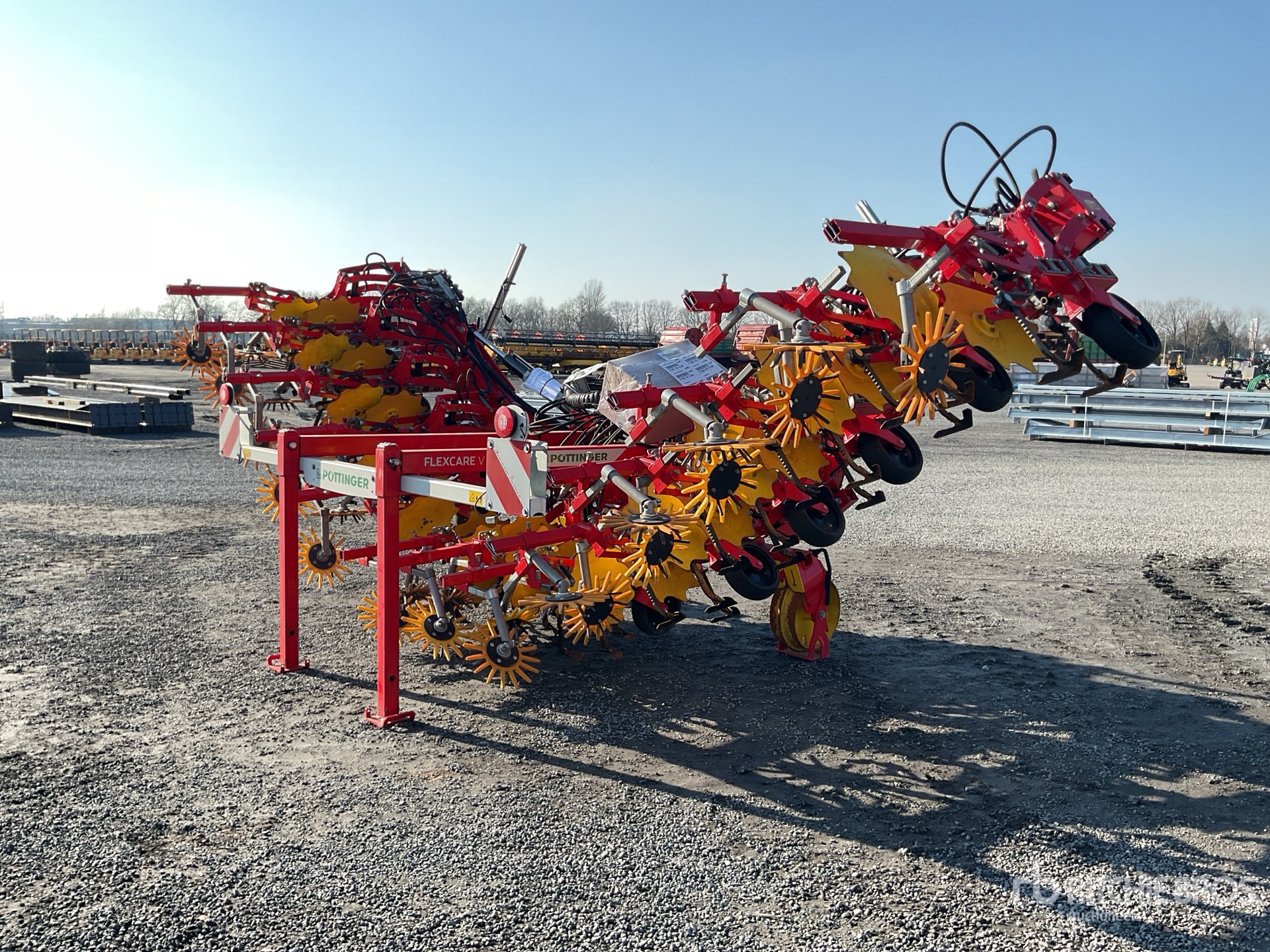 - Warning sign and lighting - Mechanical flanged wheels - 9 rows - Wide hoeing element (up to 80) - Goosefoot coulter 140/160 - Yellow finger hoe 370 - Serrated plant protection disc - Hydraulic single lift up to 12 rows - Upper link lift sensor - Load sensing - Frame extension 300 mm - Flat ridger