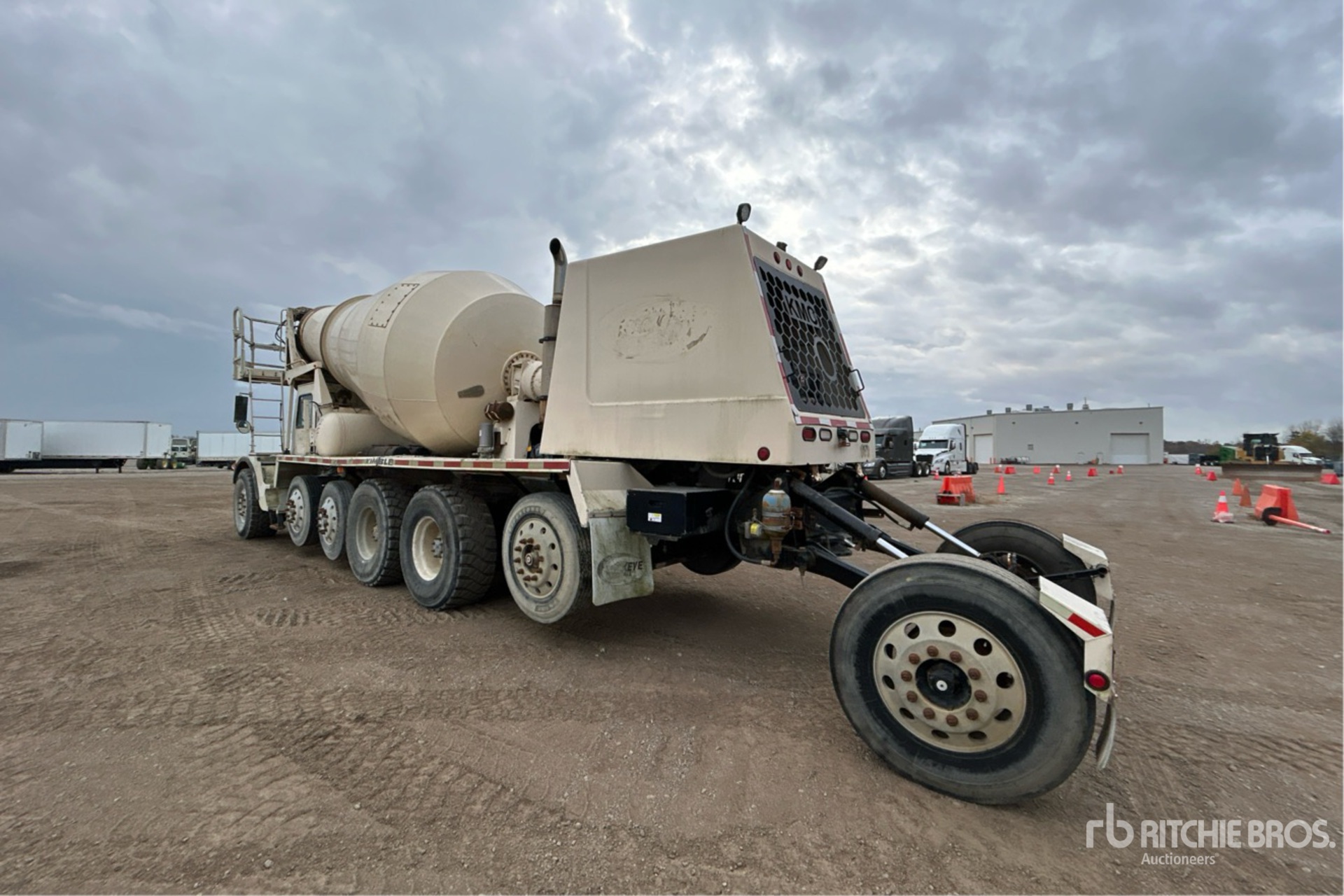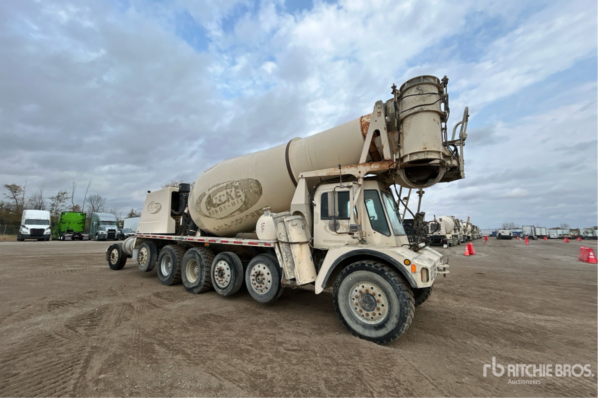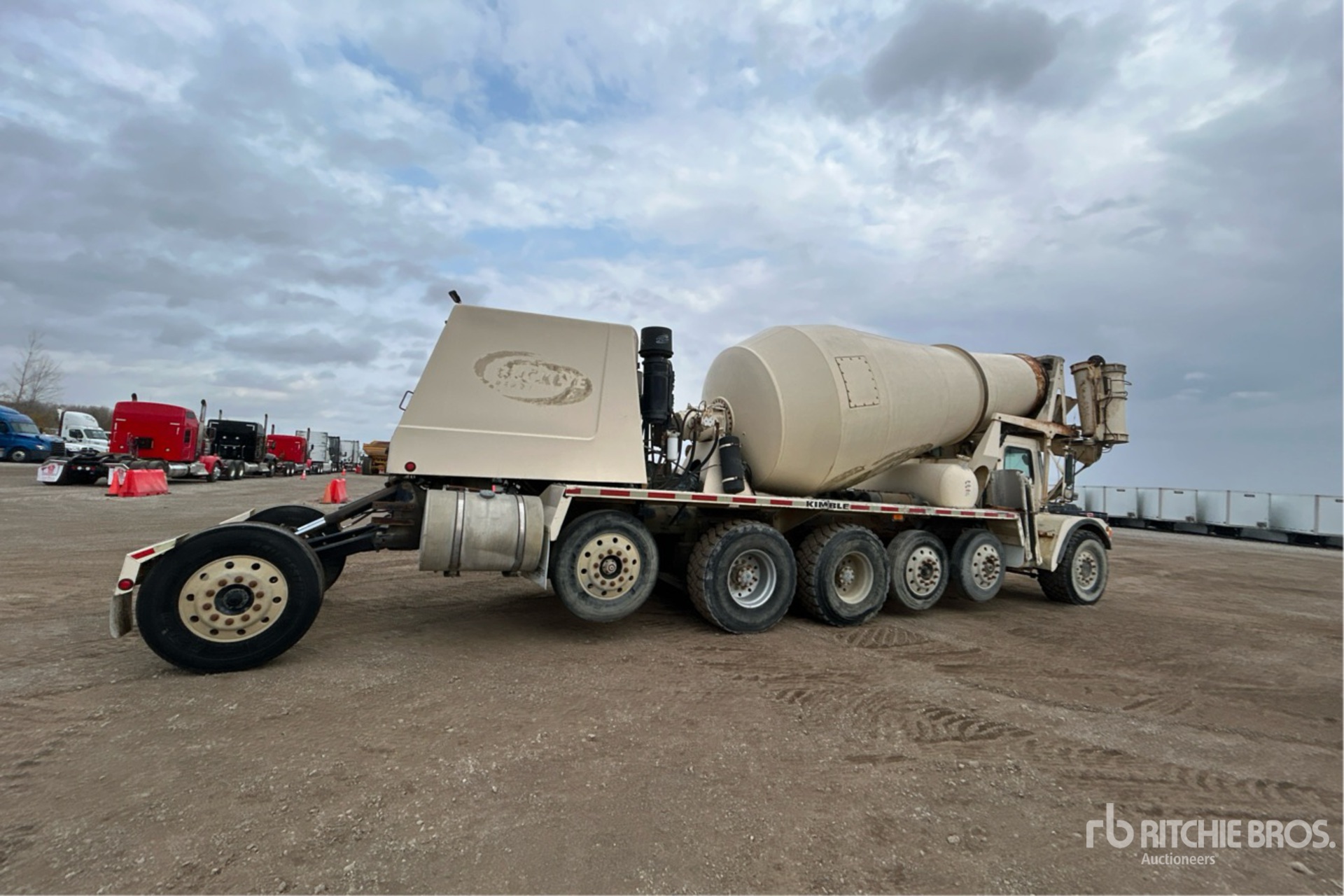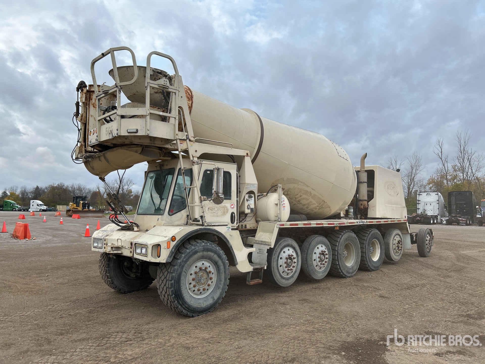 Cat C10 6 Cylinder Diesel 350 hp Engine, 28565 Engine hrs, Automatic Transmission, 21000 lb Front Axle, 40000 lb Rears, 103710 lb GVWR, Aluminum Wheels, 445/65R22.5, 2 Steerable Air Lift Pusher Axle, Steerable Air Lift Tag Axle, Trailing Tag Axle, Double Frame, Air Ride Suspension, 208 in Wheelbase, PTO, Kimble 14 cyd Mixer Unit, 2 Removable Chutes, Composite Water Tank