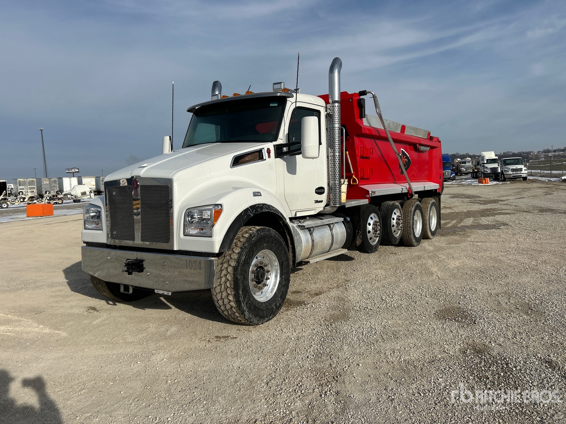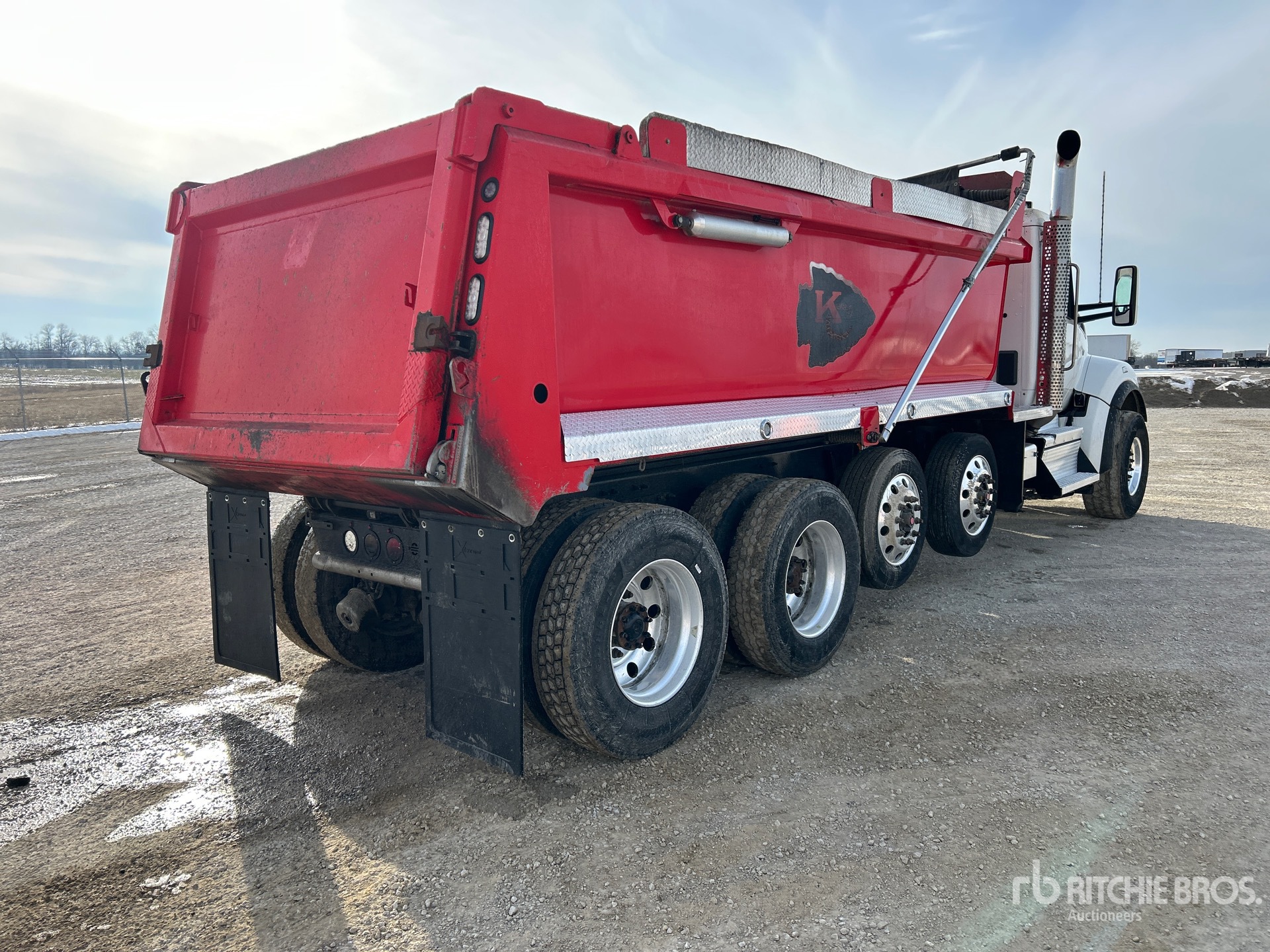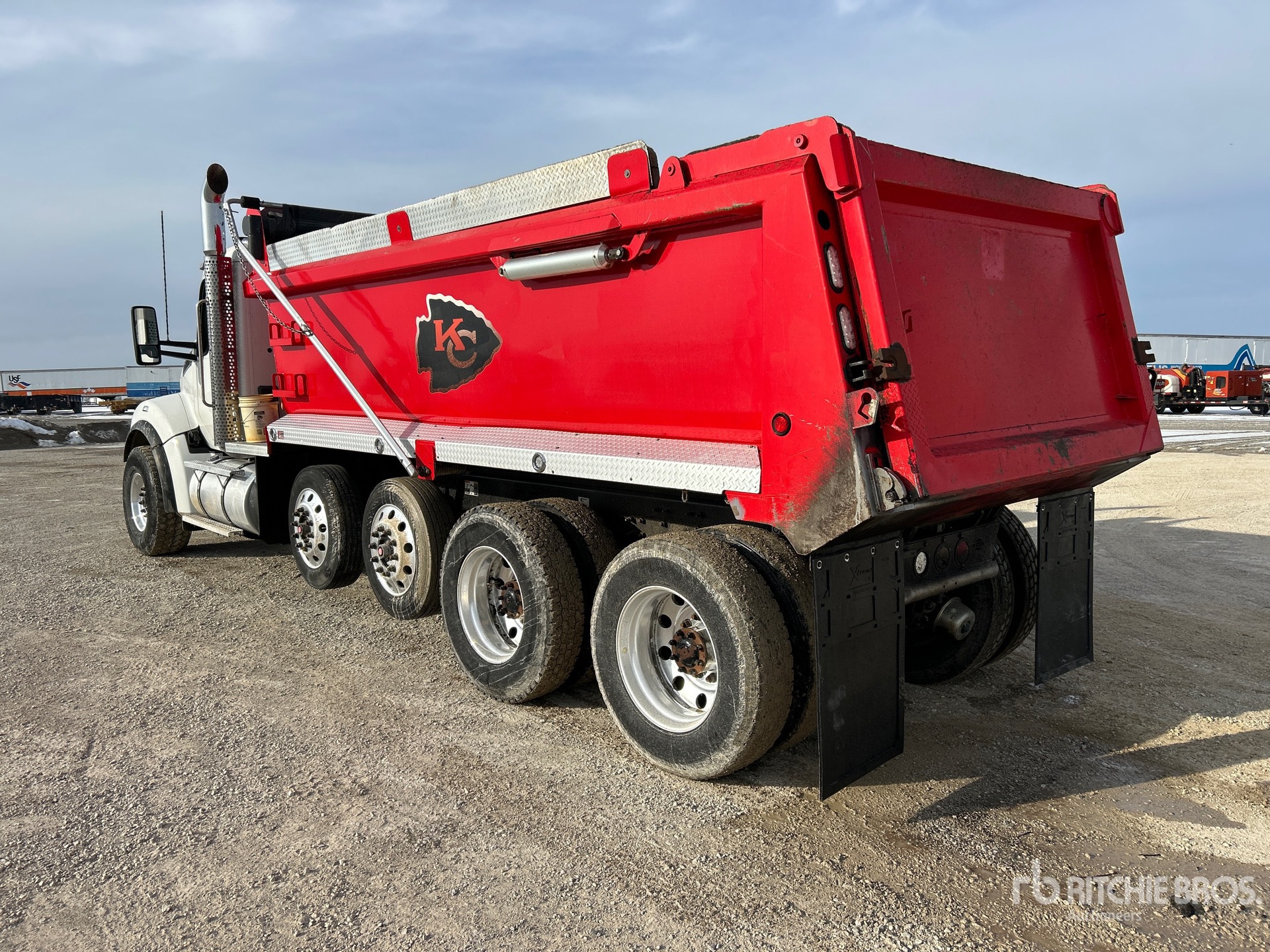 Paccar MX-11 6 Cylinder 10.8 L Diesel 400 hp Engine, 2022 US EPA Label, Requires Diesel Exhaust Fluid, 5562 Engine hrs, Engine Brake, Allison Automatic Transmission, Double Differential Locks, 20000 lb Front Axle, 68040 lb Rears, 88040 lb GVWR, Air Ride Cab, Aluminum Wheels, 425/65R22.5 Front Tires, 11R24.5 Rear Tires, 2 Air Lift Pusher Axles, Double Frame, Air Assist Front Suspension, Chalmers Suspension, 268 in Wheelbase, Logan 18 ft Long x 48 in High Steel Body, 25 cyd, Capacity, Electric Roll Tarp, High-Lift Tailgate, Equipment-from-Martin-T-Rucker-Development