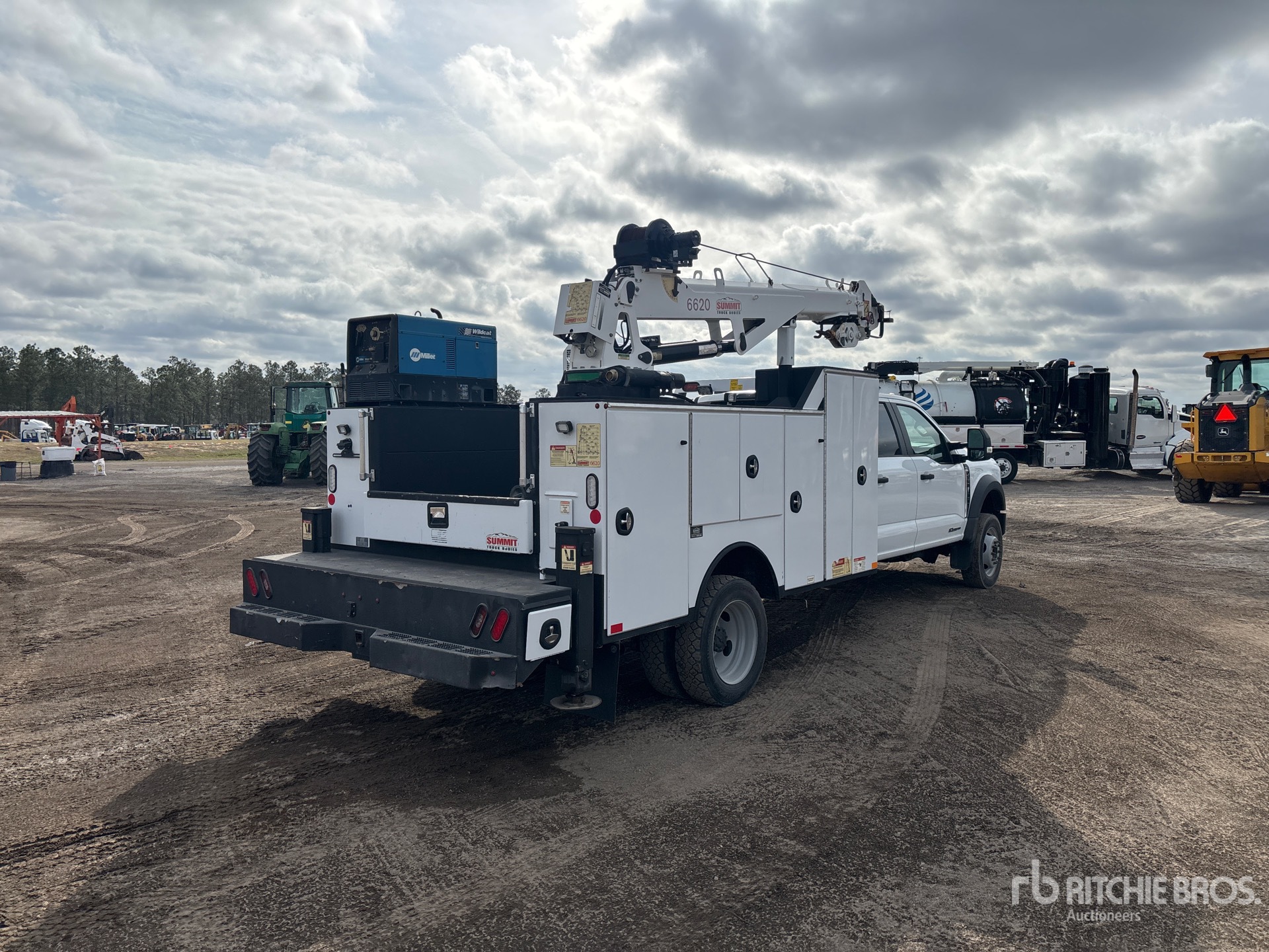 Located in Lane 93 Spot 4, Ford Powerstroke V8 6.7 L Diesel Engine, 2024 US EPA Label, CARB Compliant, Requires Diesel Exhaust Fluid, Engine Brake, Automatic Transmission, 6500 lb Front Axle, 13660 lb Rears, 18000 lb GVWR, 225/70R19.5, Spring Suspension, 206 in Wheelbase, Summit 11 ft Body, Hydraulic Stabilizers, Summit 6620 6000 lb 3 Section Hydraulic Crane, Miller Wildcat 200 6500 W Gasoline Generator Set, Boss Infinity 35 Hydraulic Air Compressor, Air Hose Reel, Miller Wildcat Gasoline Welder