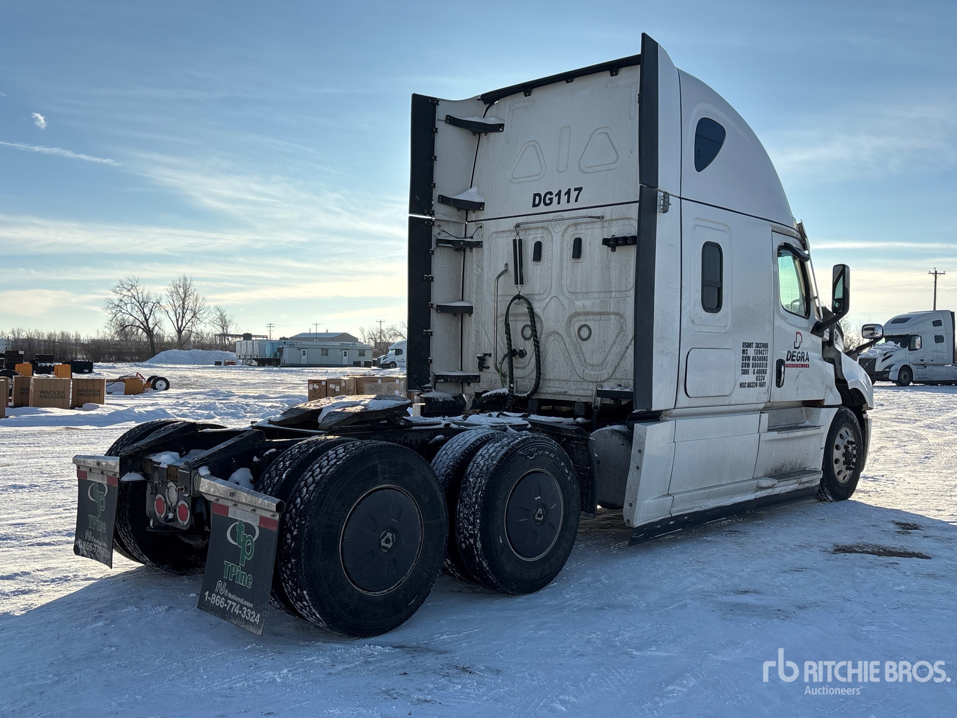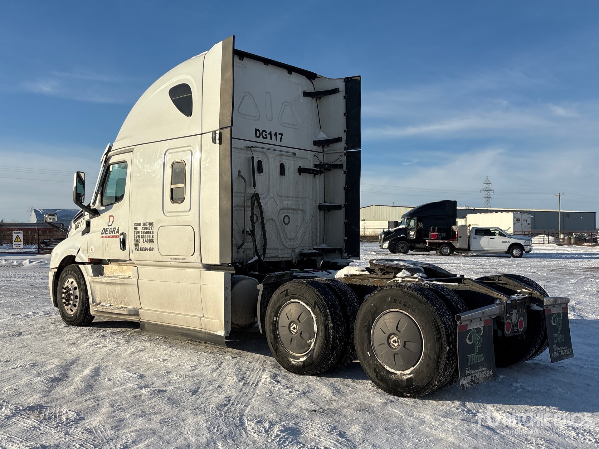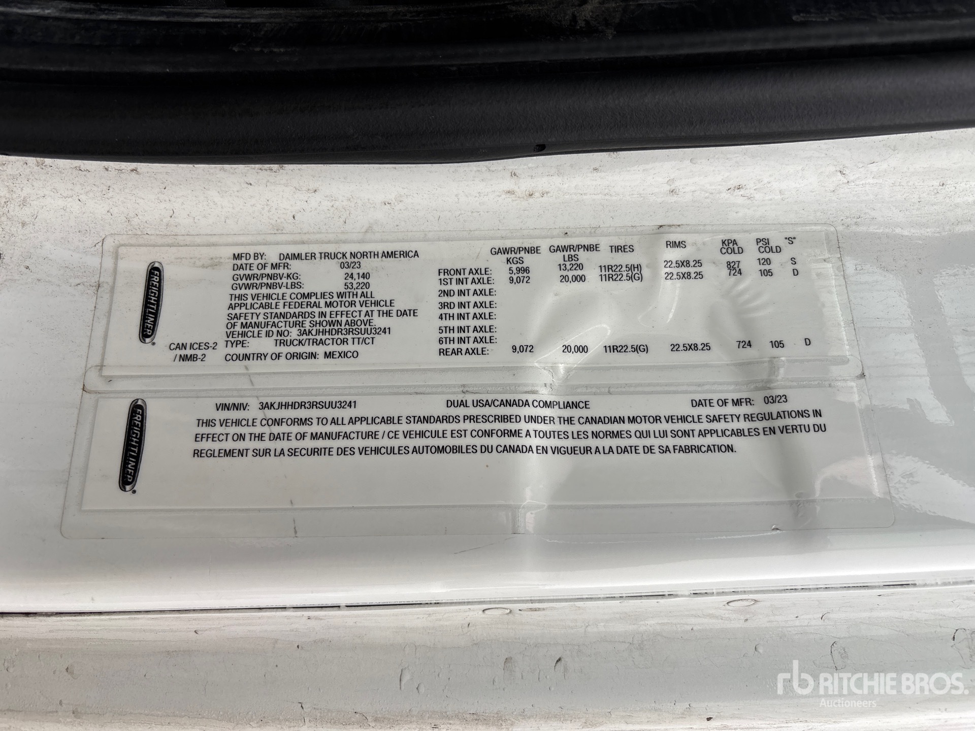 Detroit DD15 505 hp Engine, 2023 US EPA Label, 13281 Engine hrs, Detroit DT12-1650-OHE 12-Speed Automated Transmission, 13220 lb Front Axle, 40000 lb Rears, 53220 lb GVWR, Engine Brake, Double Differential Locks, 60 in High Rise Sleeper Cab, Bunk Beds, 229 in Wheelbase, Air Suspension, Aluminum Wheels, 12R22.5, Air Sliding 5th Wheel, Dual Fuel Tanks