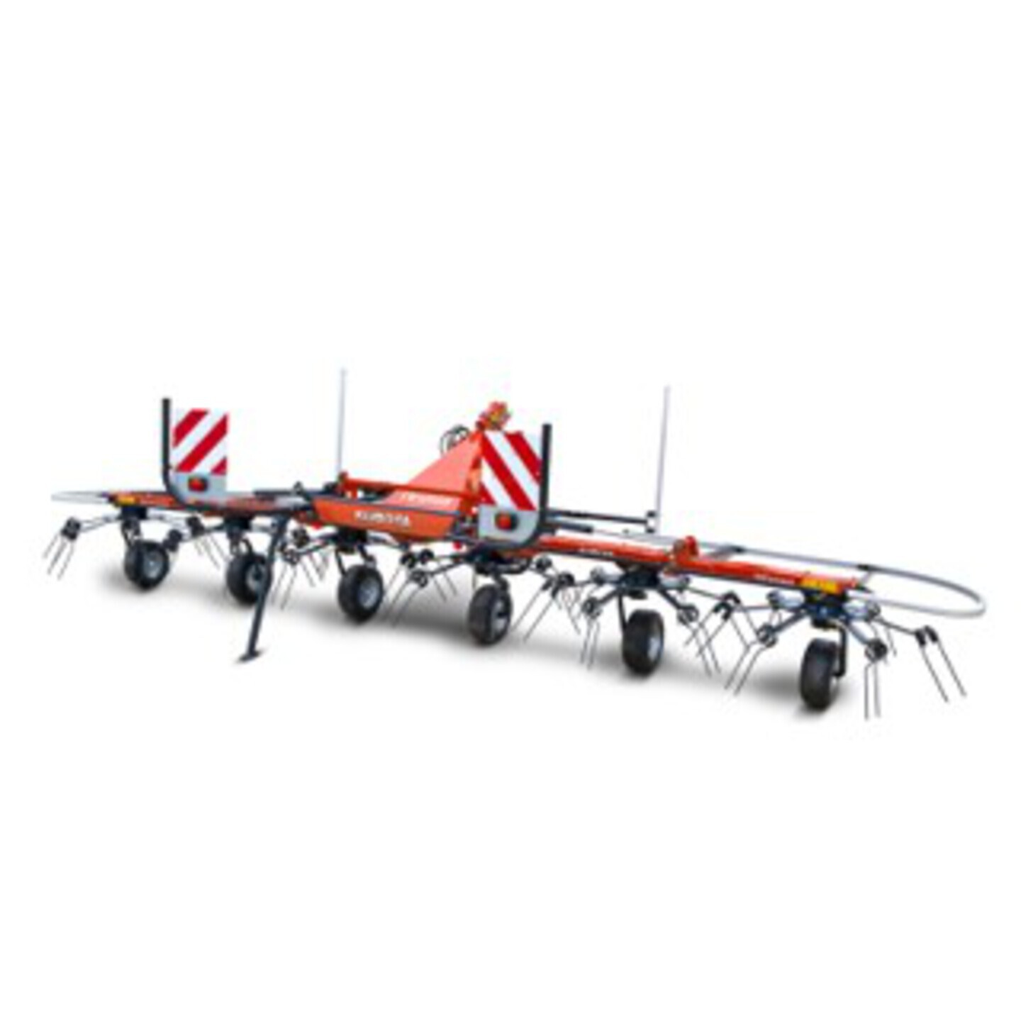 Working width: 7,6m Transport width/height: 2,95m/3,46m 6 rotors with 7 arms Weight: 990 kg 1 double acting valve Rotor wheels: 16 x 6.50-8 PR 6