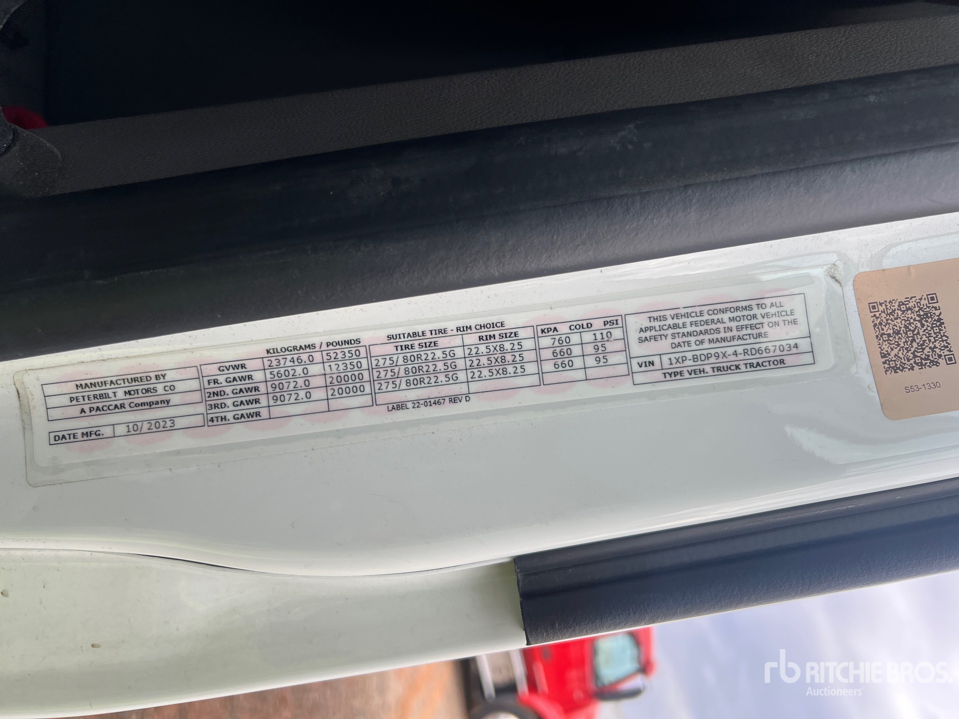 Paccar MX-13 456 hp Engine, 2023 US EPA Label, 1734 Engine hrs, Paccar PO-16F112C 12-Speed Automated Transmission, 12350 lb Front Axle, 40000 lb Rears, 52350 lb GVWR, Engine Brake, 165 in Wheelbase, Air Suspension, Aluminum Outer Wheels, 275/80R22.5, Air Sliding 5th Wheel, Dual Fuel Tanks