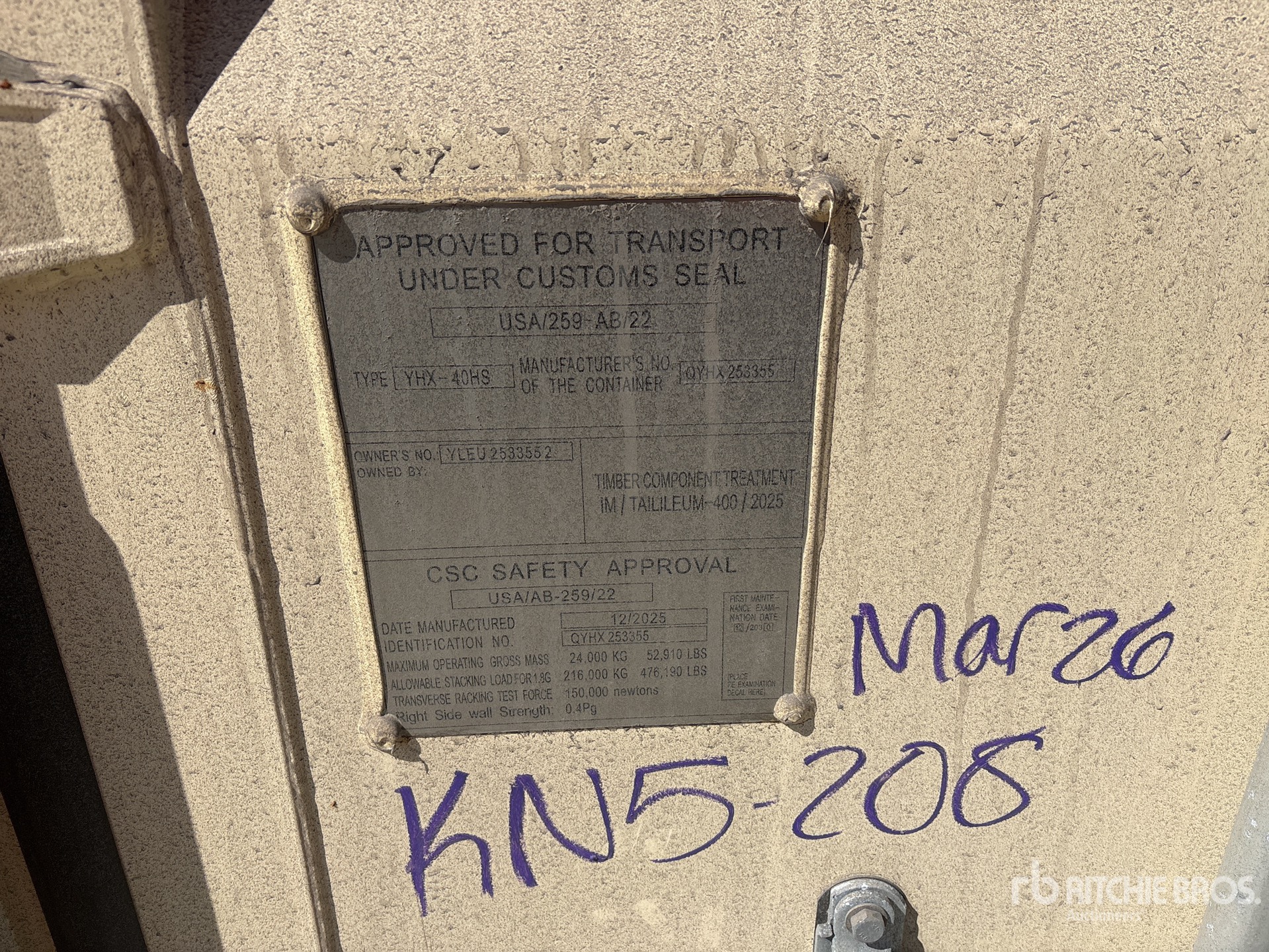 A qualified Ritchie Bros. employee collected detailed equipment information and performed functional tests on the key components of this asset. You, or a proxy, may also inspect any items on site prior to bidding on auction day.