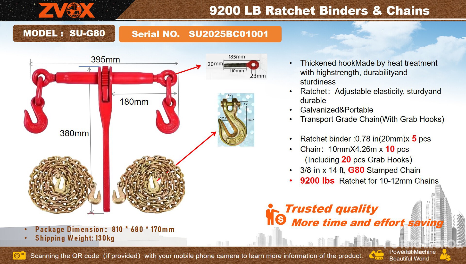 (5) 9200 lb Ratchet Binders, (10) 3/8 in x 14 ft G80 Chains & (20) Grab Hooks