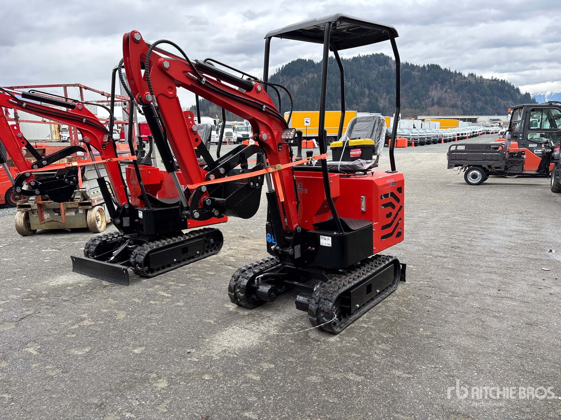 2 ft 8 in Stick, Auxiliary Hydraulic Plumbing, Backfill Blade, 7 in Rubber Tracks, 15 in Digging Bucket, Manual Thumb