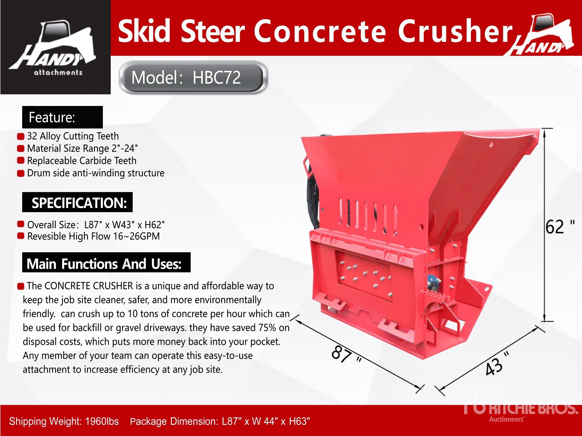 The detailed equipment information is limited in scope, and Ritchie Bros. Auctioneers has not inspected any aspects or components of the equipment other than those expressly set forth herein. Unless expressly stated, we make no representations or warranties, express or implied, concerning the equipment or its components, including without limitation any representations or warranties concerning functionality, conformity or compliance with any safety standard or requirement of any applicable authority or regulatory body, fitness for any particular purpose, or merchantability. You are strongly advised to perform your own detailed inspection of the equipment prior to bidding.
