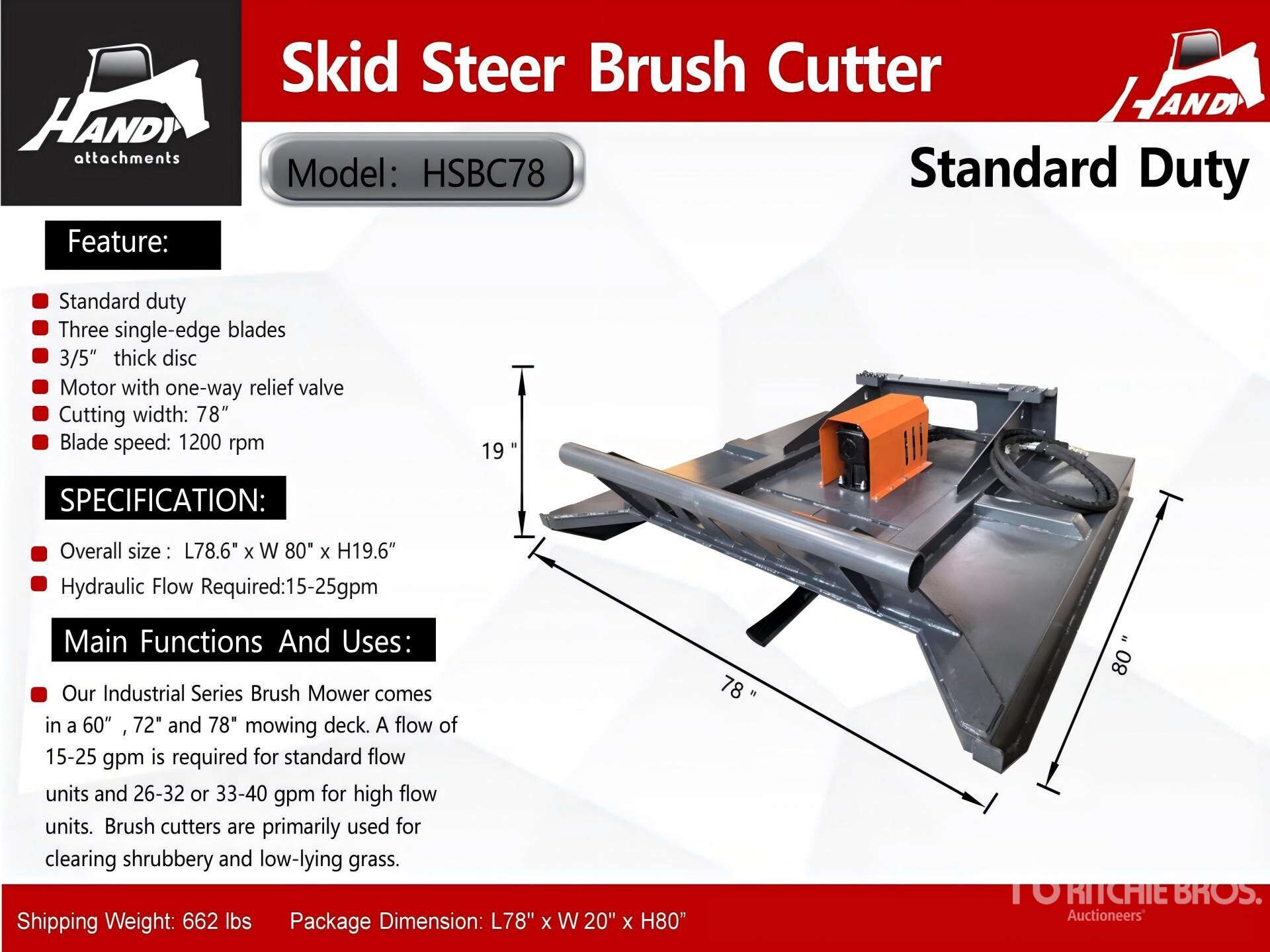 The detailed equipment information is limited in scope, and Ritchie Bros. Auctioneers has not inspected any aspects or components of the equipment other than those expressly set forth herein. Unless expressly stated, we make no representations or warranties, express or implied, concerning the equipment or its components, including without limitation any representations or warranties concerning functionality, conformity or compliance with any safety standard or requirement of any applicable authority or regulatory body, fitness for any particular purpose, or merchantability. You are strongly advised to perform your own detailed inspection of the equipment prior to bidding.
