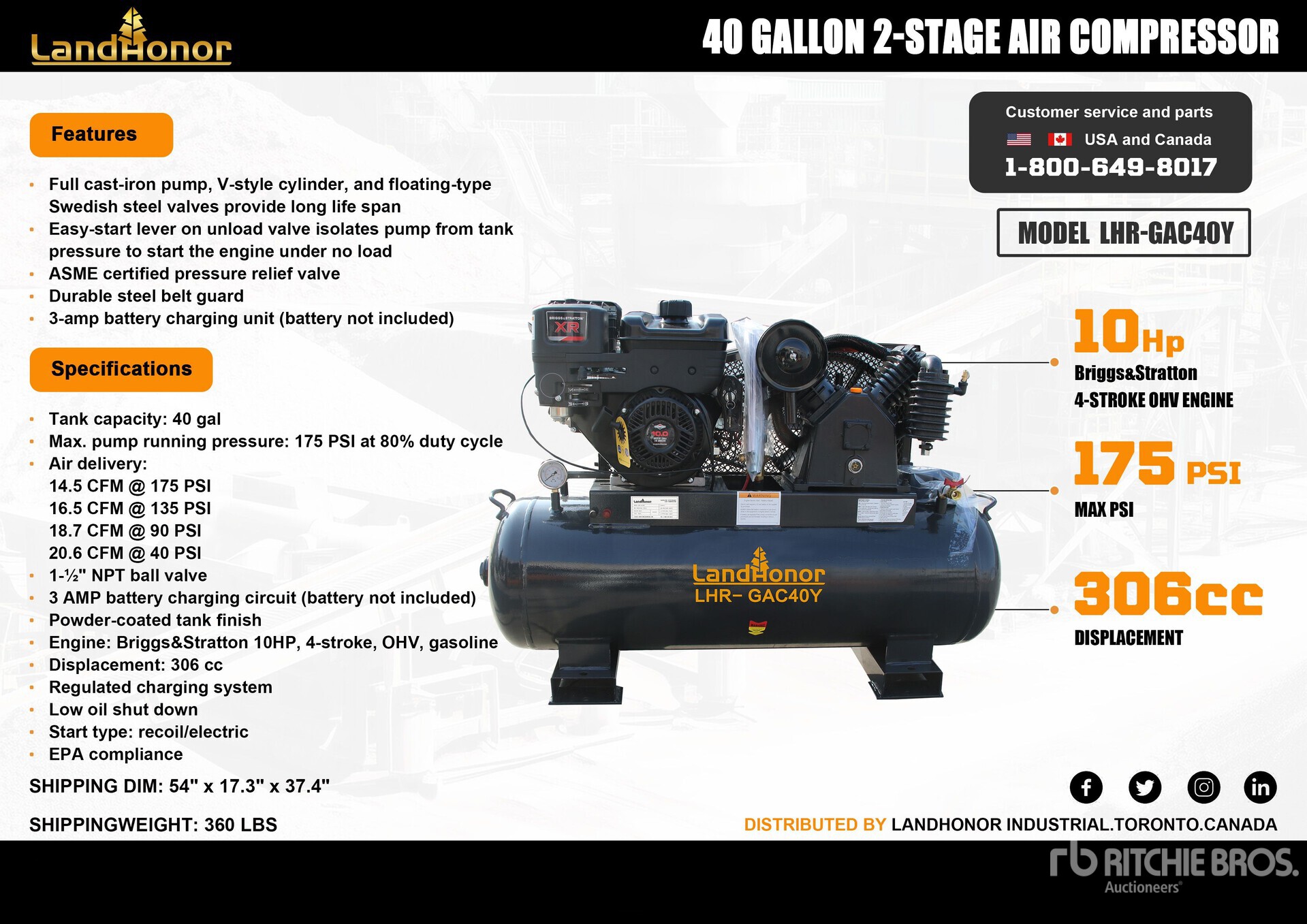175 psi Working Pressure, 1 Cylinder Gasoline Engine
