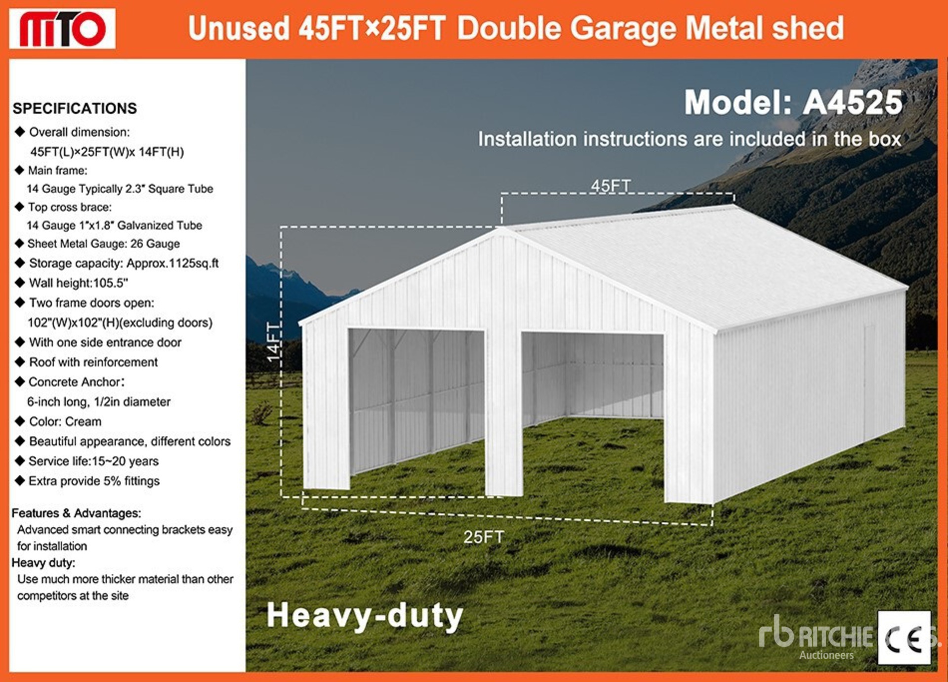 2026 MTO A4525 25 ft x 45 ft Double Garage Metal Storage Building (Unused)