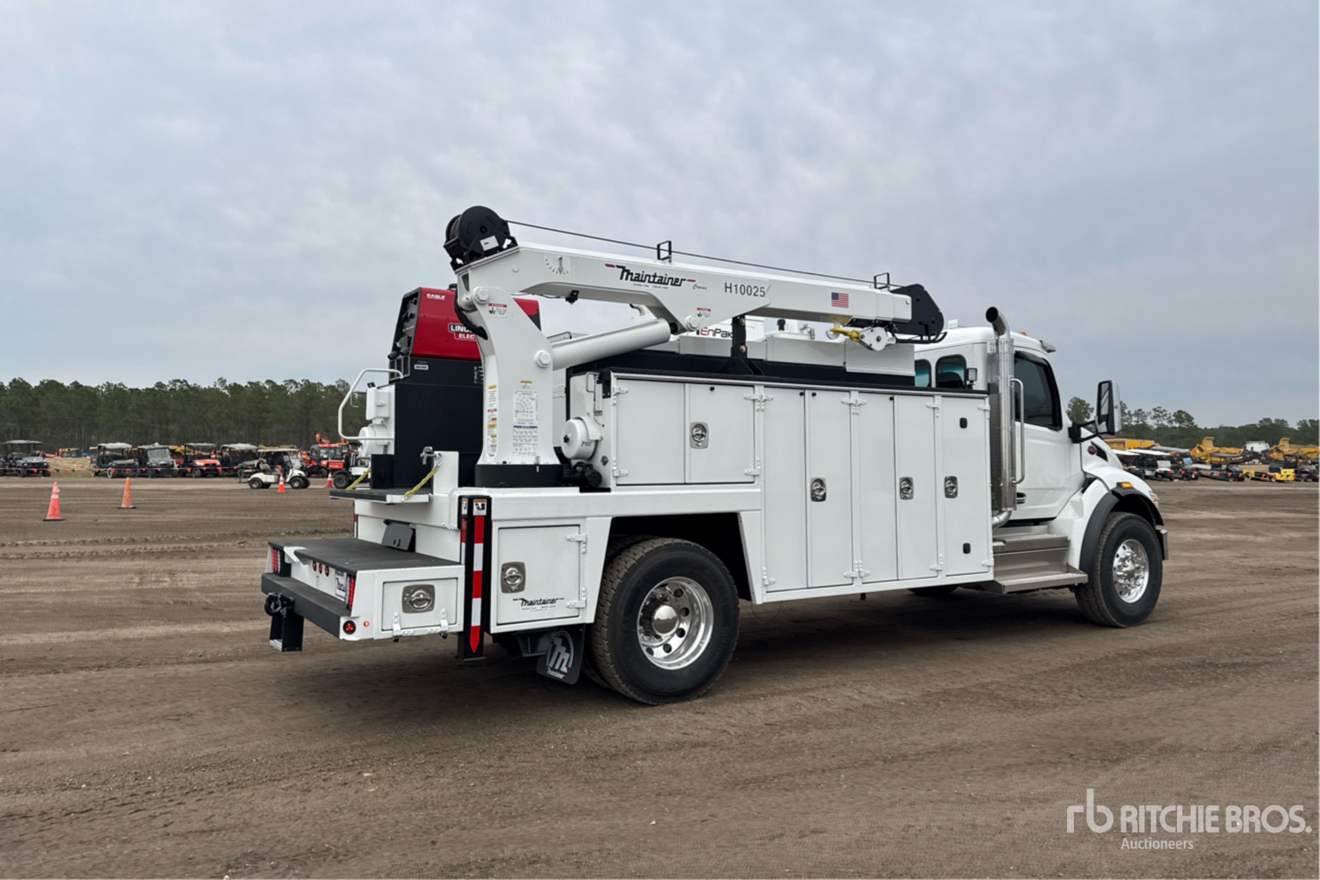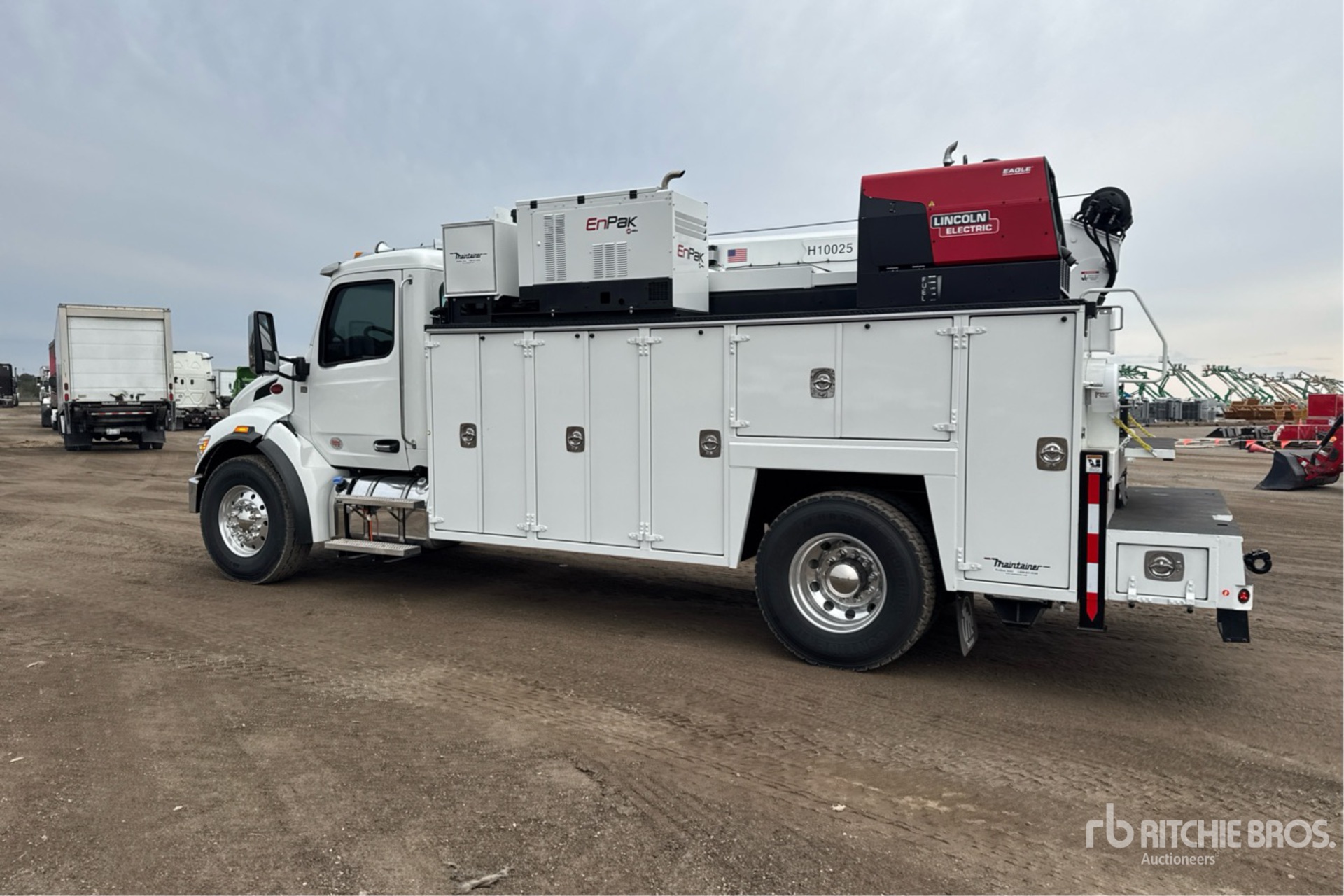Paccar PX-9 6 Cylinder 8.9 L Diesel 370 hp Engine, 2025 US EPA Label, Requires Diesel Exhaust Fluid, Engine Coolant Heater, 14.1 Engine hrs, Engine Brake, Allison 3000 RDS-P Gen 6 Automatic Transmission, Differential Lock, 12000 lb Front Axle, 21000 lb Rears, 33000 lb GVWR, Aluminum Outer Wheels, 315/80R22.5 Front Tires, 11R22.5 Rear Tires, Hendrickson Spring Suspension, 200 in Wheelbase, Maintainer 16 ft Body, Hydraulic Stabilizers, Maintainer H10025 10000 lb 3 Section Hydraulic Crane, Wireless Remote Control, Miller EnPak Diesel Generator Set, EnPak Hydraulic Air Compressor, Air Hose Reel, Lincoln Eagle Plus 10000 W 225 A Gasoline Welder