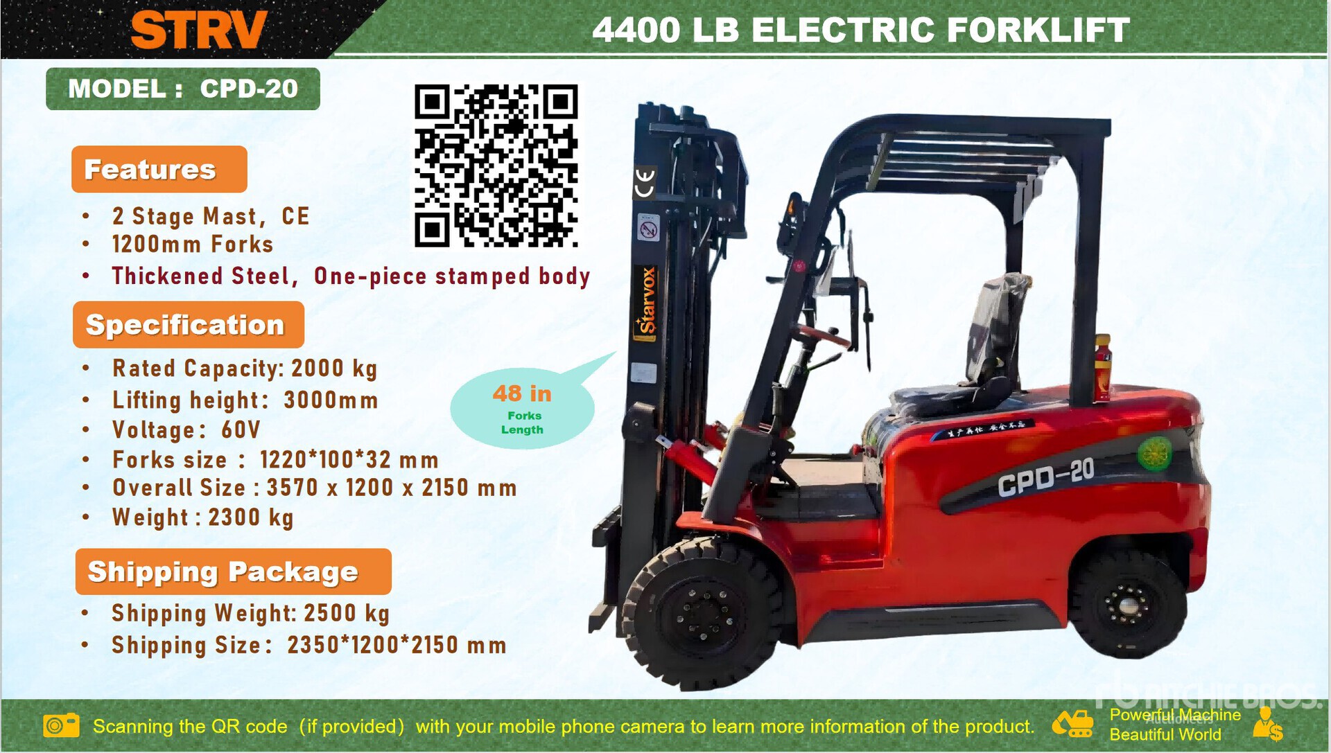 2 Stage Mast, 118 in Max Lift Height, 48 in Forks, 60 V, Product images displayed are stock photos. Item is new/unused.