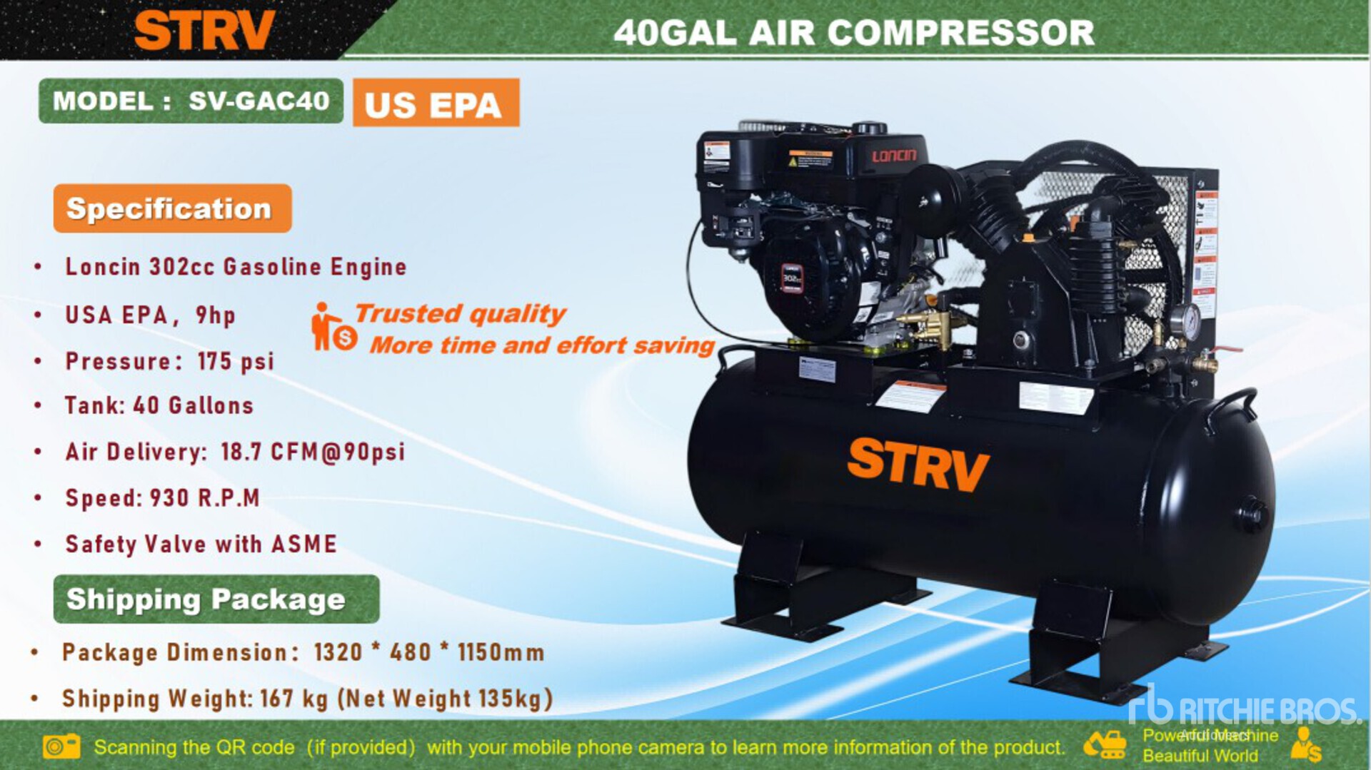 175 psi Working Pressure, Loncin 1 Cylinder 9 hp 302 cc Gasoline Engine, Product images displayed are stock photos. Item is new/unused.