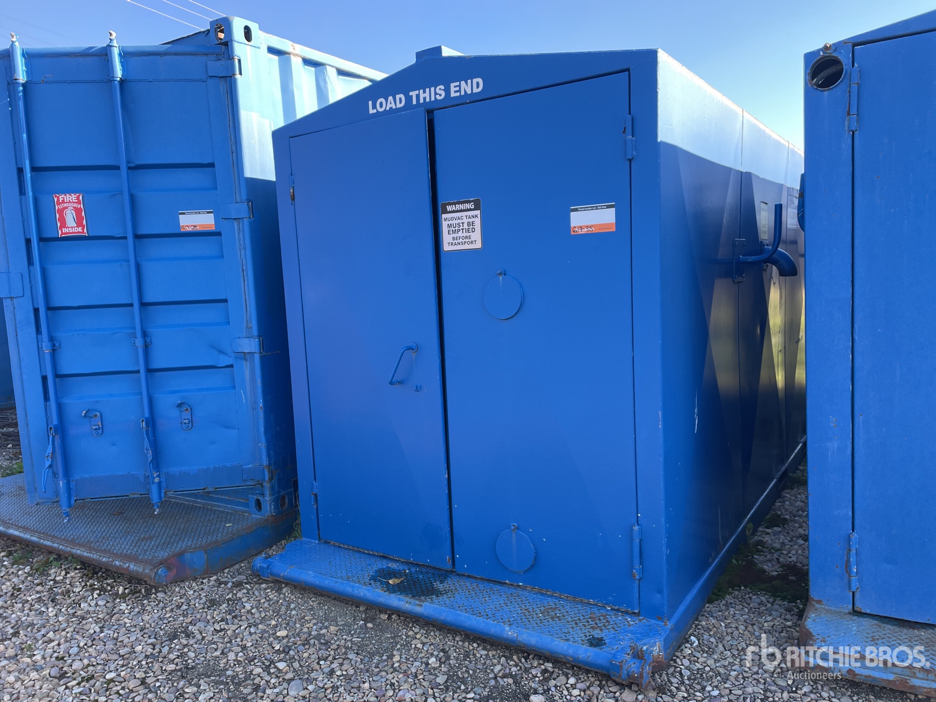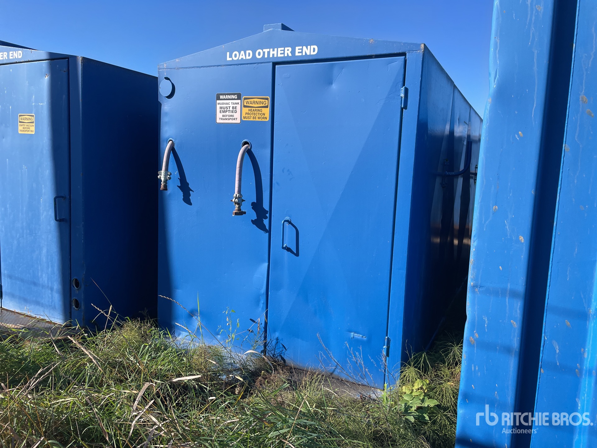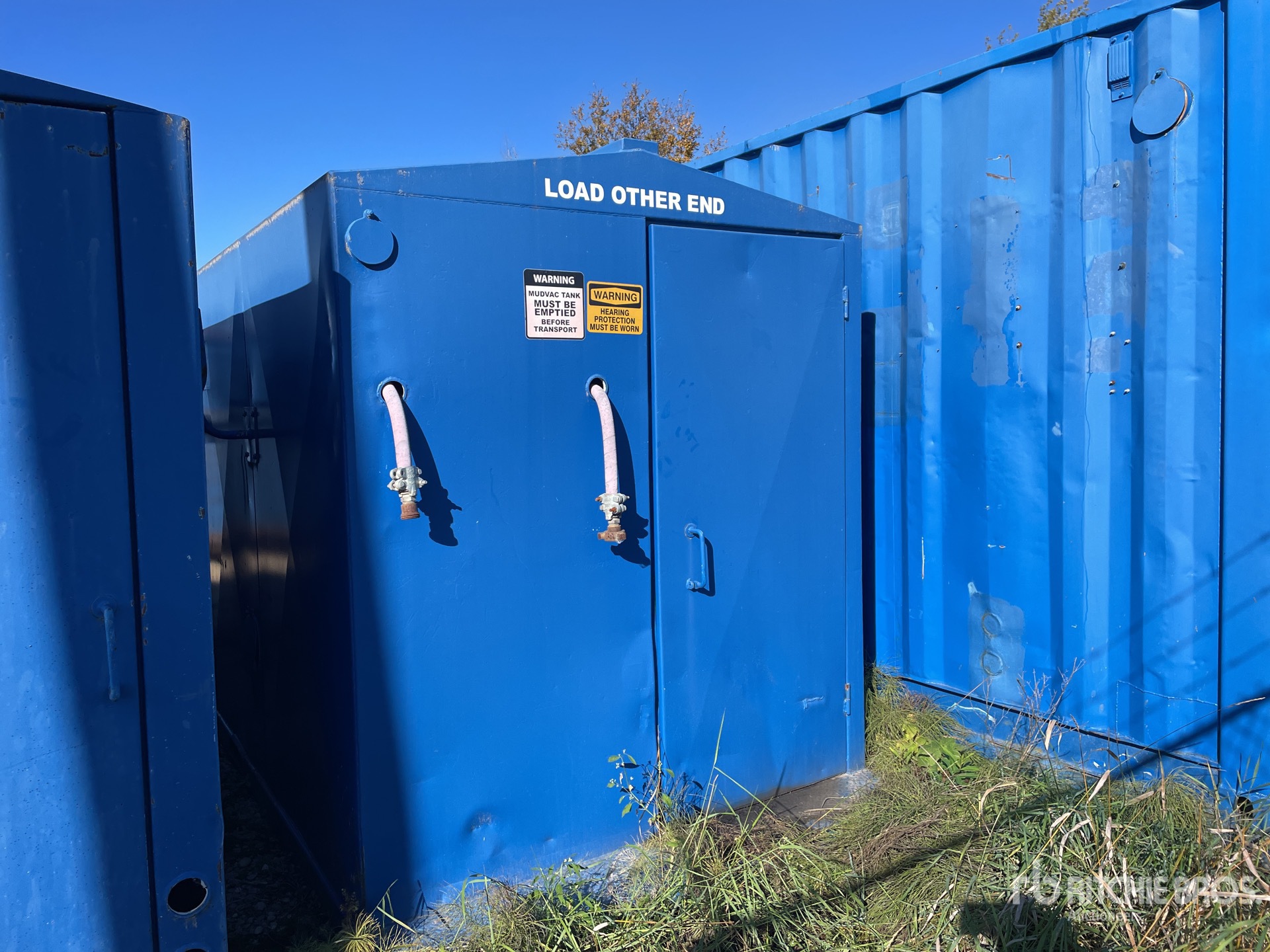 Environment clean-gup of contaminated fluids, Manual discharge, Fruitland 500 vacuum pump 28.5" HG, 5-gallon capacity oil reservoir, High liquid level switch will shut off mudvac when full, Suction valves 2" hose / Discharge valves 3" hose, 25 HP 3 phase electric motor, 480V, explosion proof, 10PSI discharge pressure, A-B #2 starter, explosion proof. Moisture trap located opposite side of A-B starter, Pressure relief valve / Vacuum relief valve. 30" vacuum to 30PSI pressure gauge, Remote on/off switch, auto shut off timer, full tank auto shut off, Comes with 100' cab tire, 6 ft 3 inch x 16 ft Storage Building