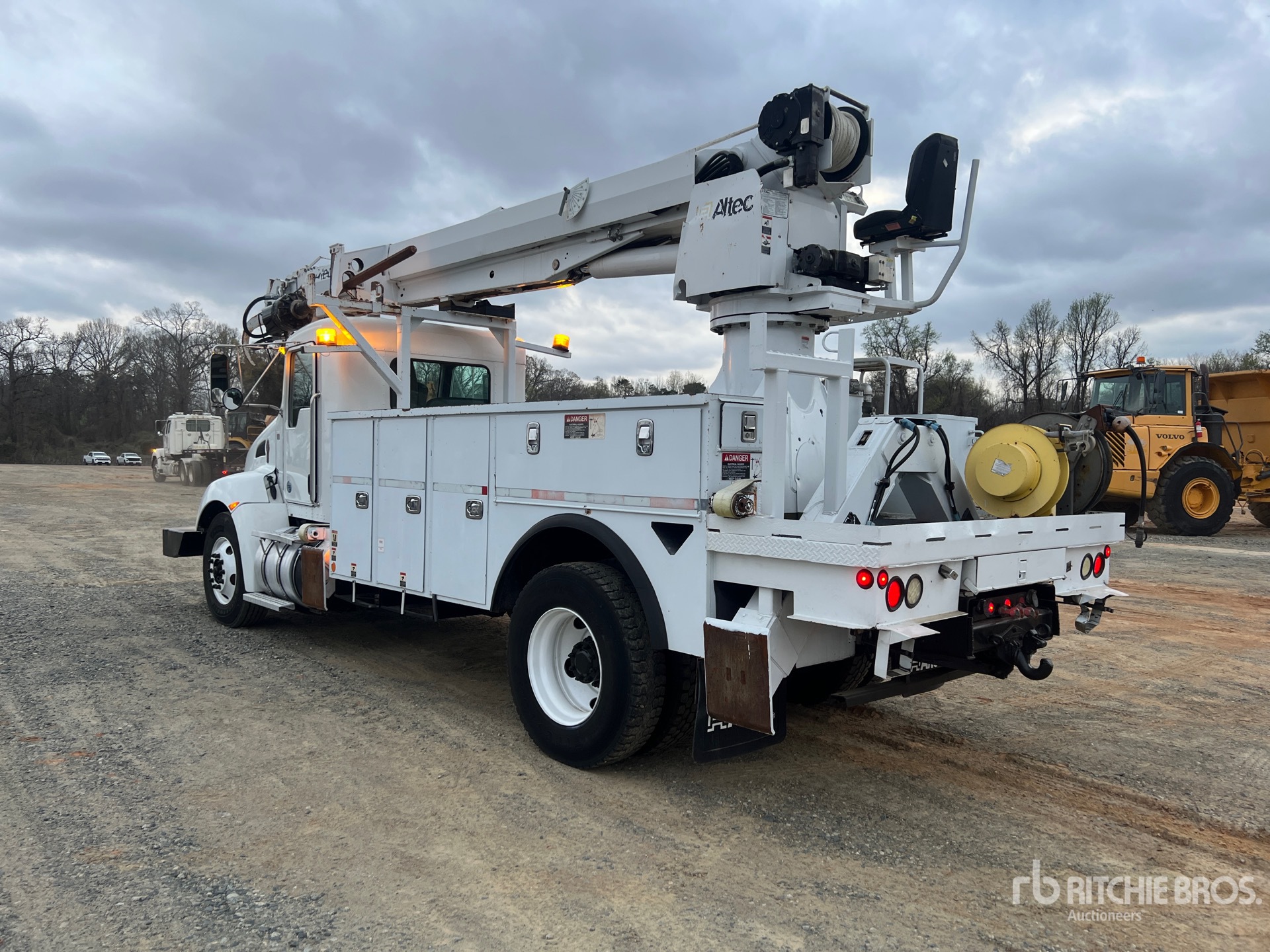 Paccar PC-7 6 Cylinder 6.7 L Diesel 260 hp Engine, 2014 US EPA Label, CARB Compliant, Requires Diesel Exhaust Fluid, 7213 Engine hrs, Engine Brake, Allison Automatic Transmission, 13000 lb Front Axle, 20000 lb Rears, 33000 lb GVWR, 11R22.5, Spring Suspension, 192 in Wheelbase, PTO, Rear Mounted, Material Handling Jib, Altec 14 ft 8 in Body, A-Outriggers, Rear Outriggers, Bumper Mounted Winch, Hydraulic Hose Reel