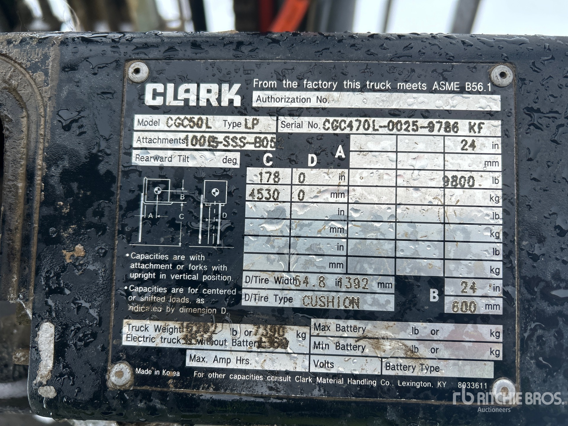 The detailed equipment information is limited in scope, and Ritchie Bros. Auctioneers has not inspected any aspects or components of the equipment other than those expressly set forth herein. Unless expressly stated, we make no representations or warranties, express or implied, concerning the equipment or its components, including without limitation any representations or warranties concerning functionality, conformity or compliance with any safety standard or requirement of any applicable authority or regulatory body, fitness for any particular purpose, or merchantability. You are strongly advised to perform your own detailed inspection of the equipment prior to bidding.