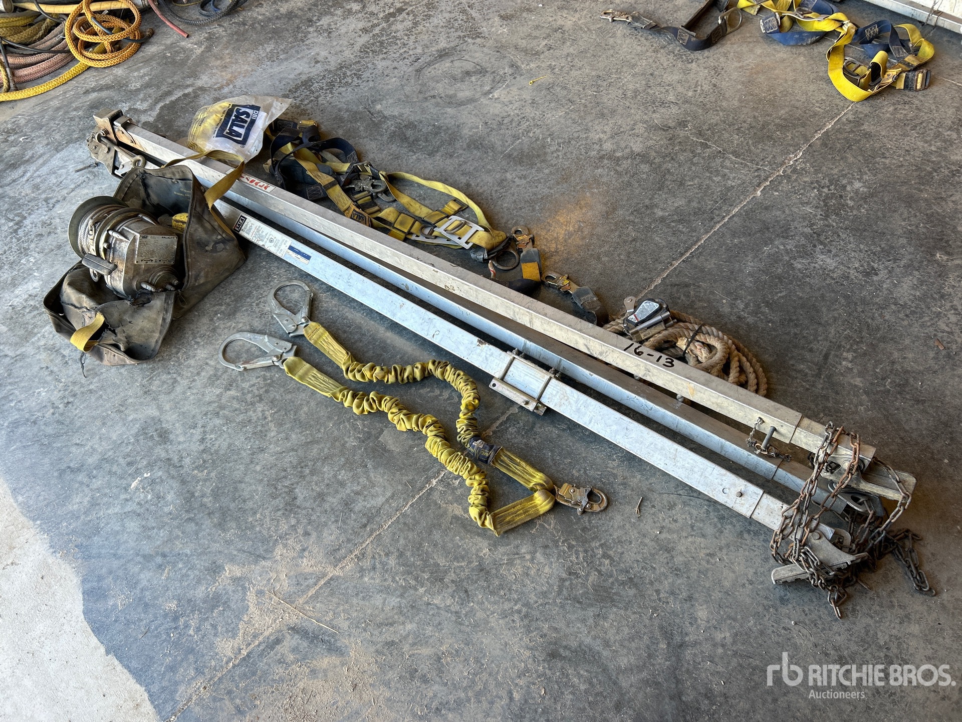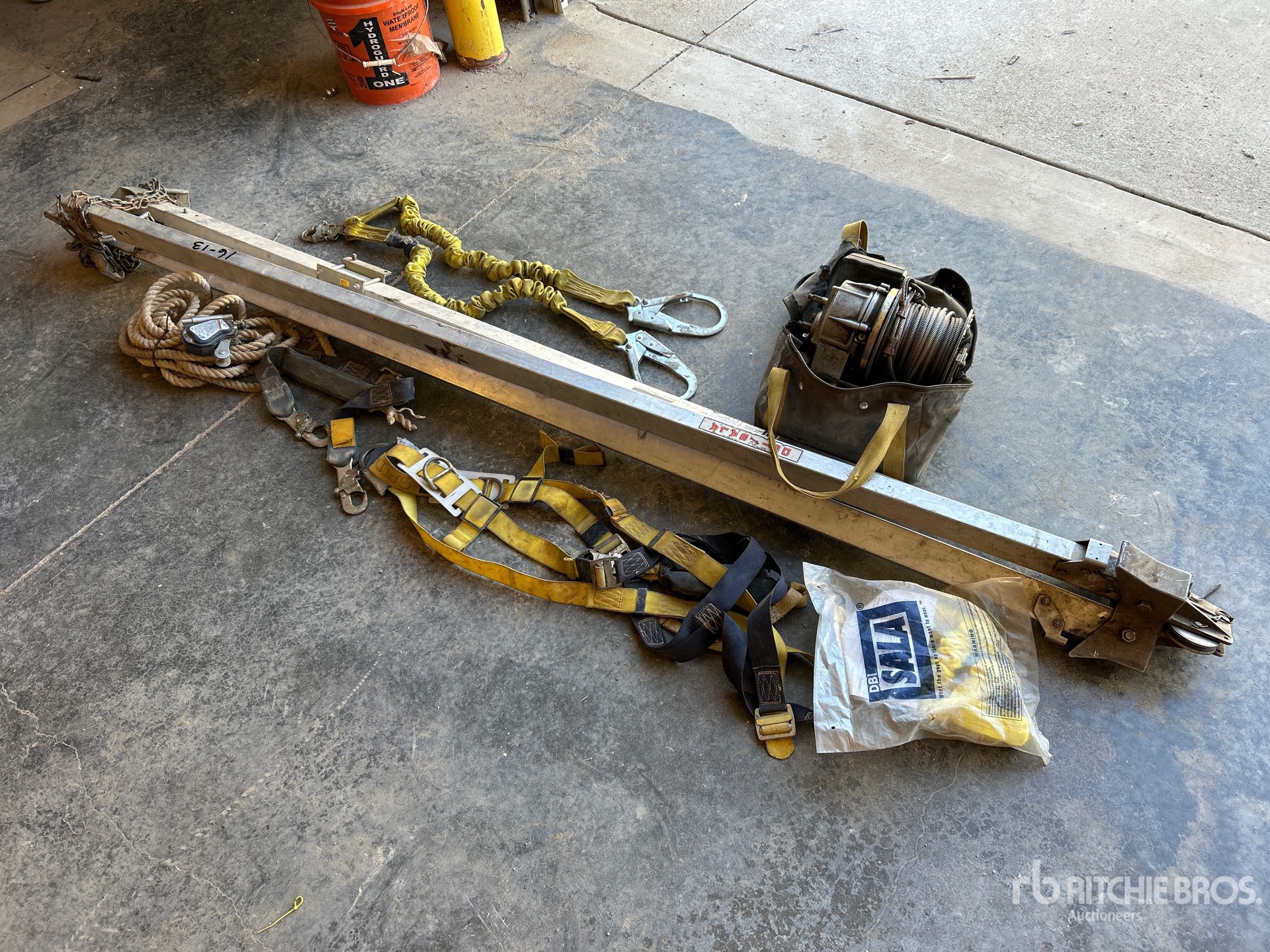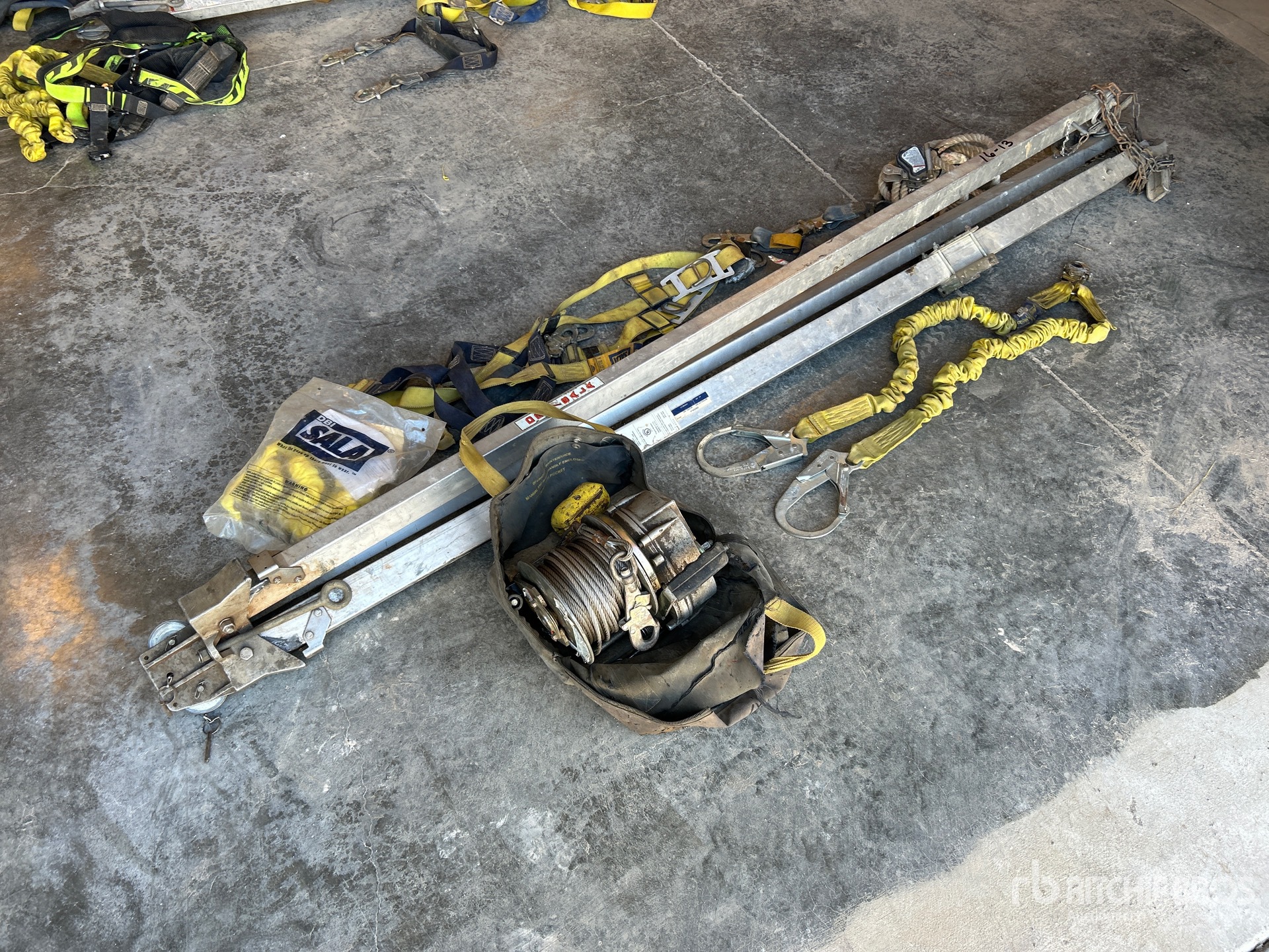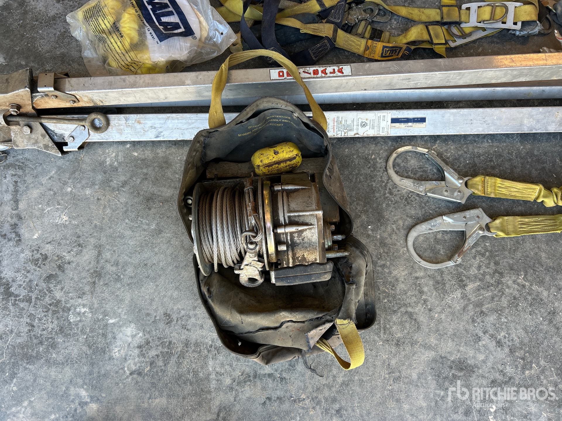 Comes with DBI winch (350lbs capacity), safety harness, lanyard, Rope