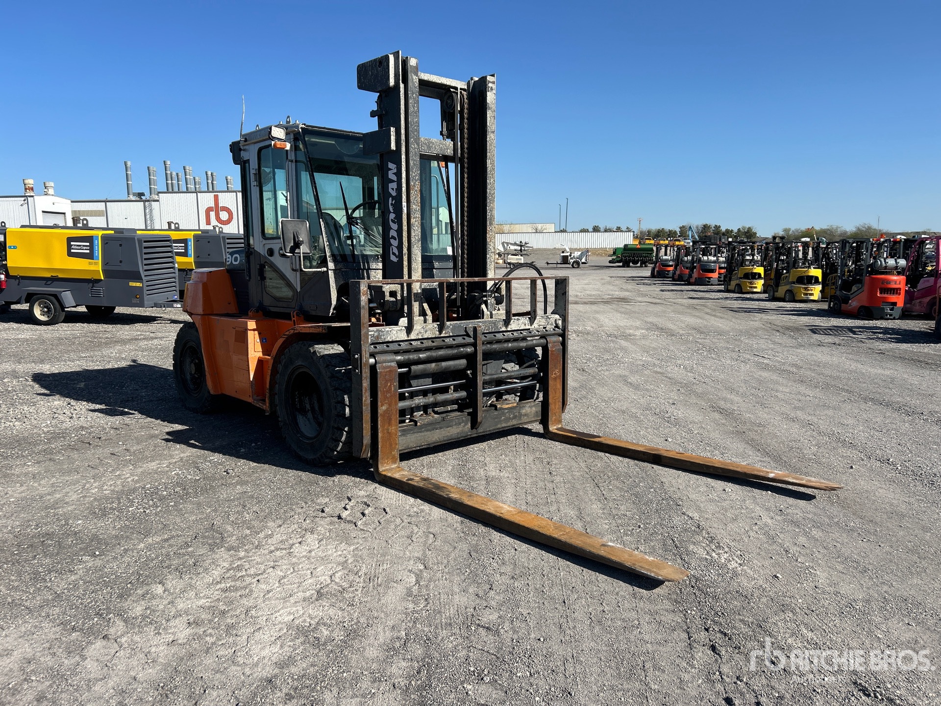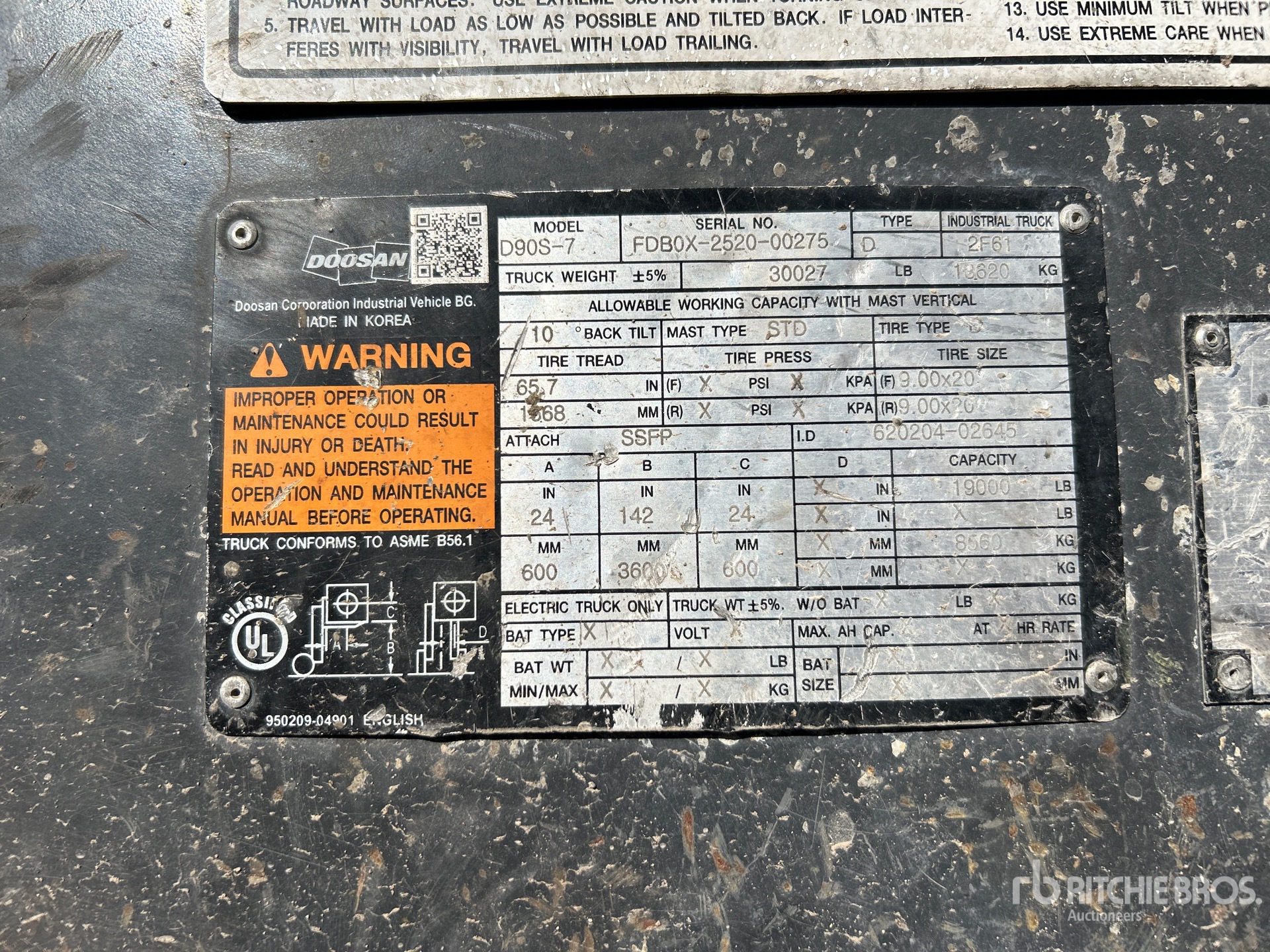 Enclosed Cab, Air Conditioner, 2 Stage Mast, 142 in Max Lift Height, 120 in Lowered Mast Height, 92 in Forks, Side Shift, Fork Positioner, Solid Pneumatic Tires, Tier 4, 2019 US EPA Label, Doosan 4 Cylinder 3.4 L Diesel Engine, Requires Diesel Exhaust Fluid, Hours 8117