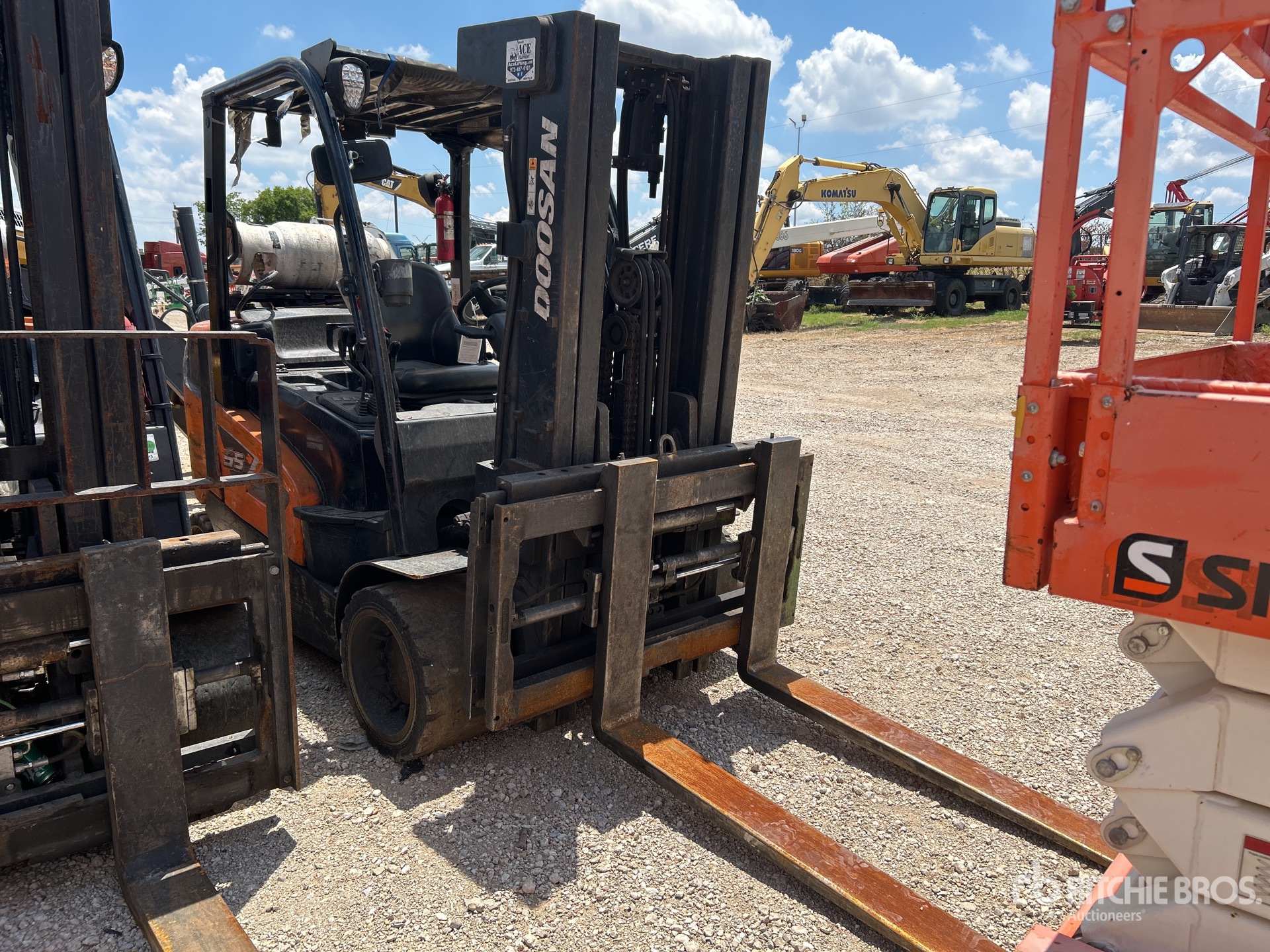 2 Stage Mast, 162 in Max Lift Height, 82 in Lowered Mast Height, 59 in Forks, Side Shift, Fork Positioner, Solid Pneumatic Tires, 3 Cylinder LPG Engine