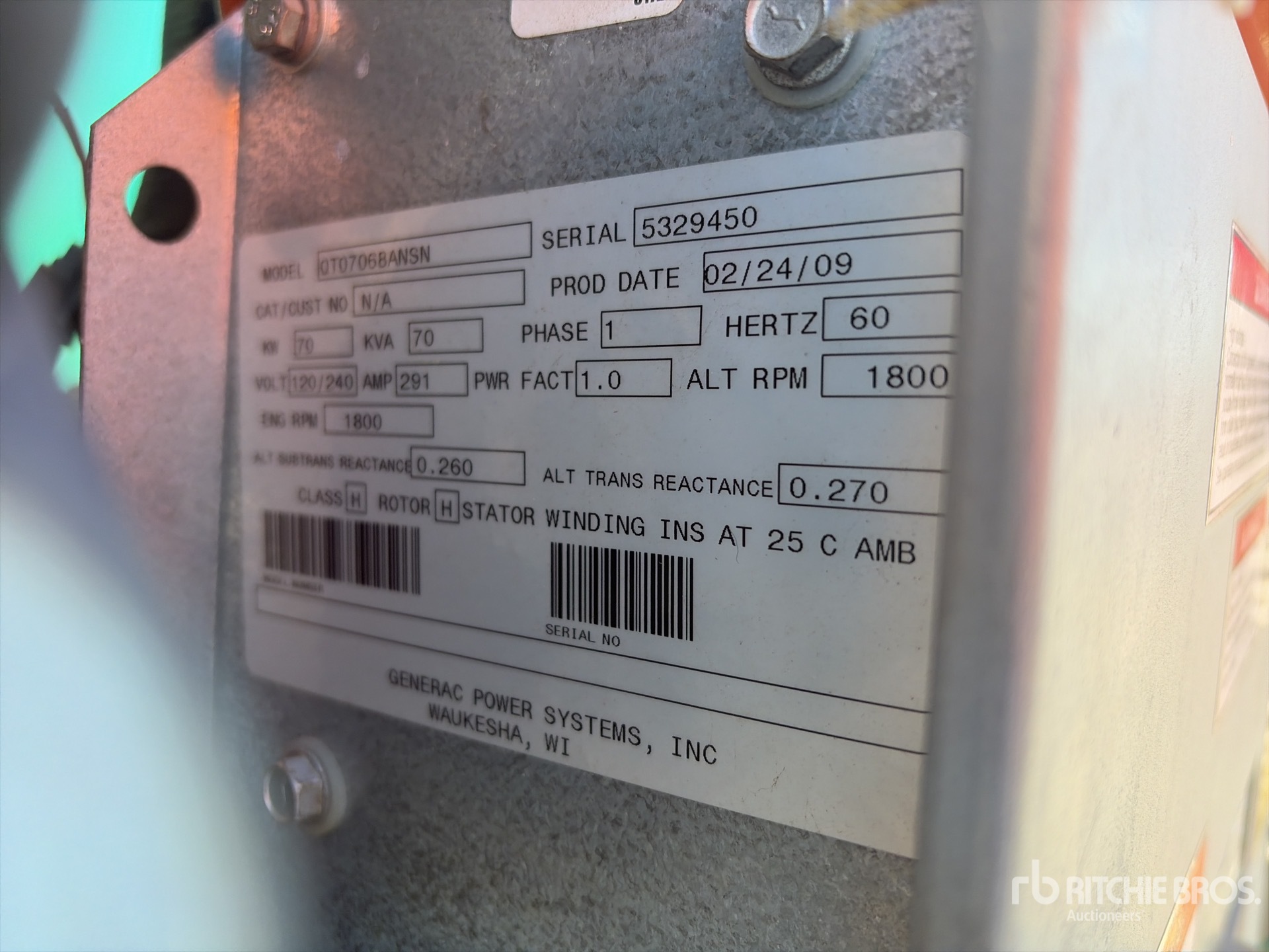 2009 US EPA Label, Generac 10 Cylinder 6760 cc Diesel Engine, /70 kW, Rated Single Phase Output, 120 V / 240 V Rated Voltage