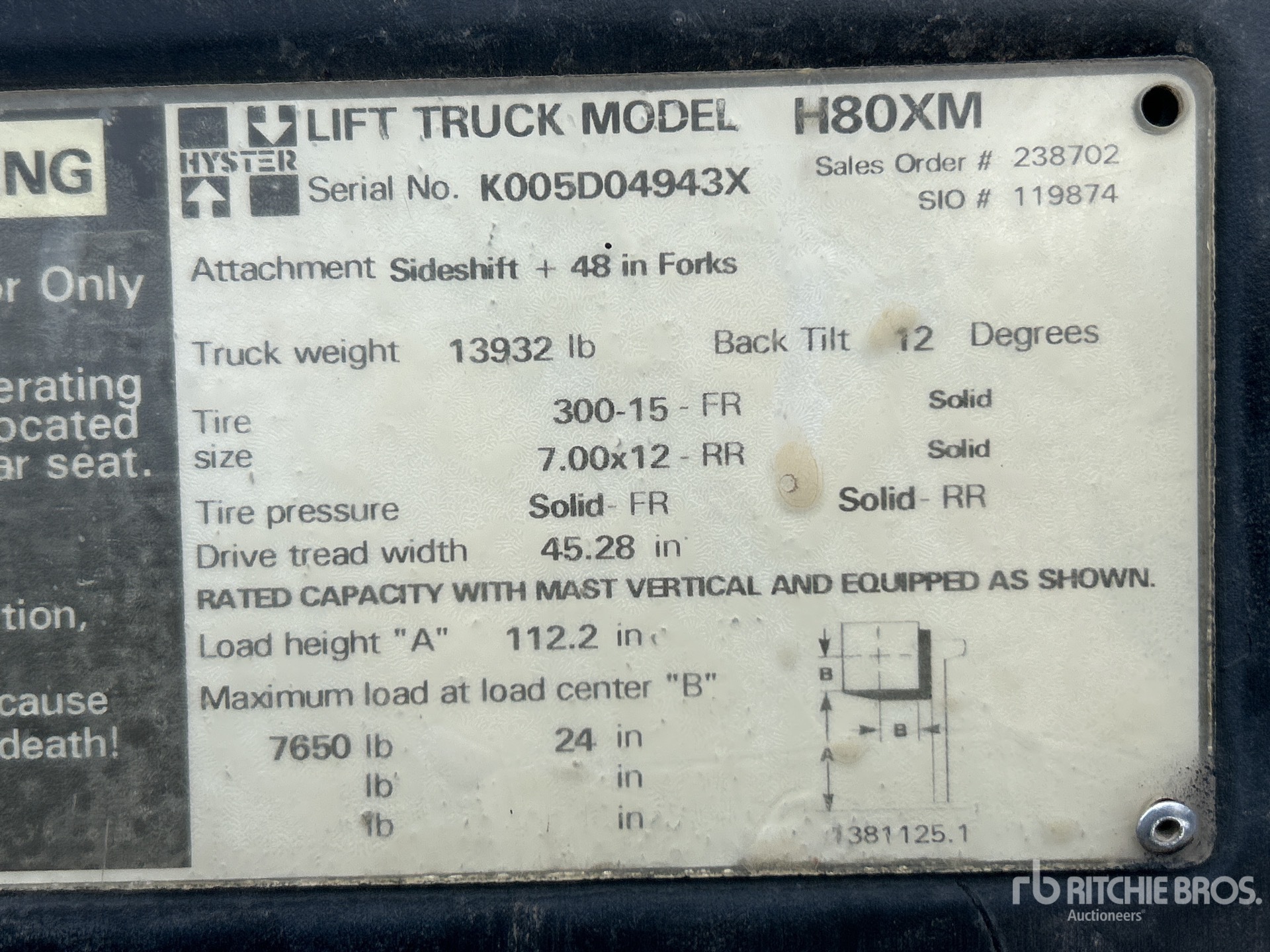 The detailed equipment information is limited in scope, and Ritchie Bros. Auctioneers has not inspected any aspects or components of the equipment other than those expressly set forth herein. Unless expressly stated, we make no representations or warranties, express or implied, concerning the equipment or its components, including without limitation any representations or warranties concerning functionality, conformity or compliance with any safety standard or requirement of any applicable authority or regulatory body, fitness for any particular purpose, or merchantability. You are strongly advised to perform your own detailed inspection of the equipment prior to bidding.