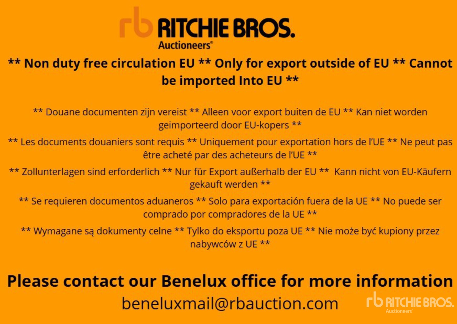 The detailed equipment information is limited in scope, and Ritchie Bros. Auctioneers has not inspected any aspects or components of the equipment other than those expressly set forth herein. Unless expressly stated, we make no representations or warranties, express or implied, concerning the equipment or its components, including without limitation any representations or warranties concerning functionality, conformity or compliance with any safety standard or requirement of any applicable authority or regulatory body, fitness for any particular purpose, or merchantability. You are strongly advised to perform your own detailed inspection of the equipment prior to bidding.