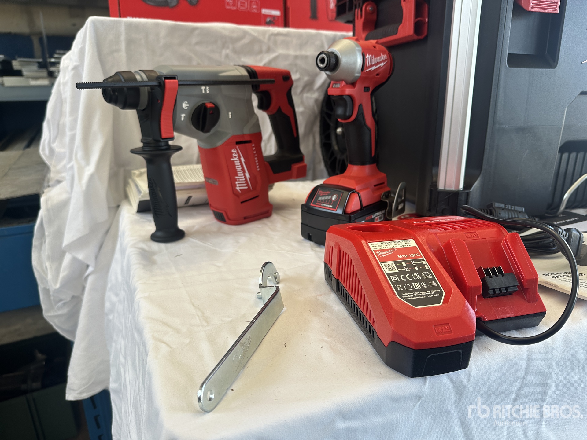1pc tile cutter, 1pc grinder, 1pc impact driver, 1pc compact drill driver, 3pcs batteries, 1pc battery charger, 1pc trolley