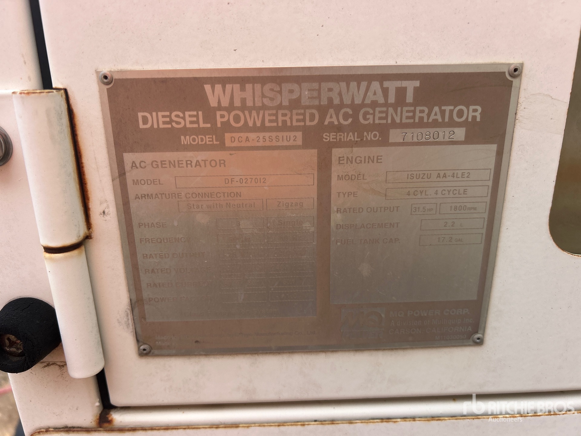 2004 US EPA Label, Isuzu AA4LE2 4 Cylinder 2.2 L Diesel Engine, 25 kVA/ Rated 3 Phase Output, 240 V / 480 V Rated Voltage, /14.4 kW, Rated Single Phase Output, 120 V / 240 V Rated Voltage, 240 V & 120 V Receptacles, Sound Attenuated, Bottom Mounted Fuel Tank, Ball Hitch Carrier Trailer