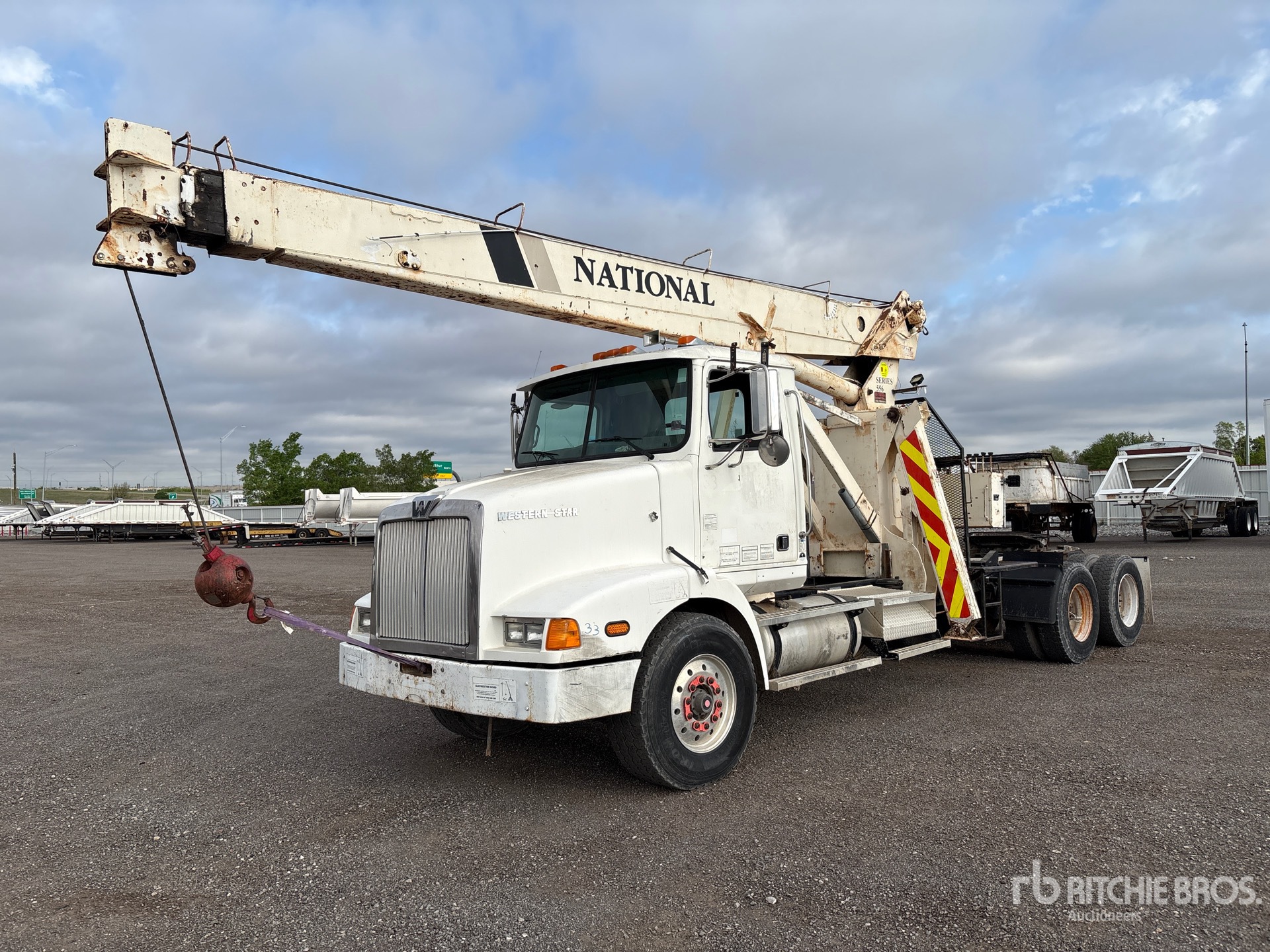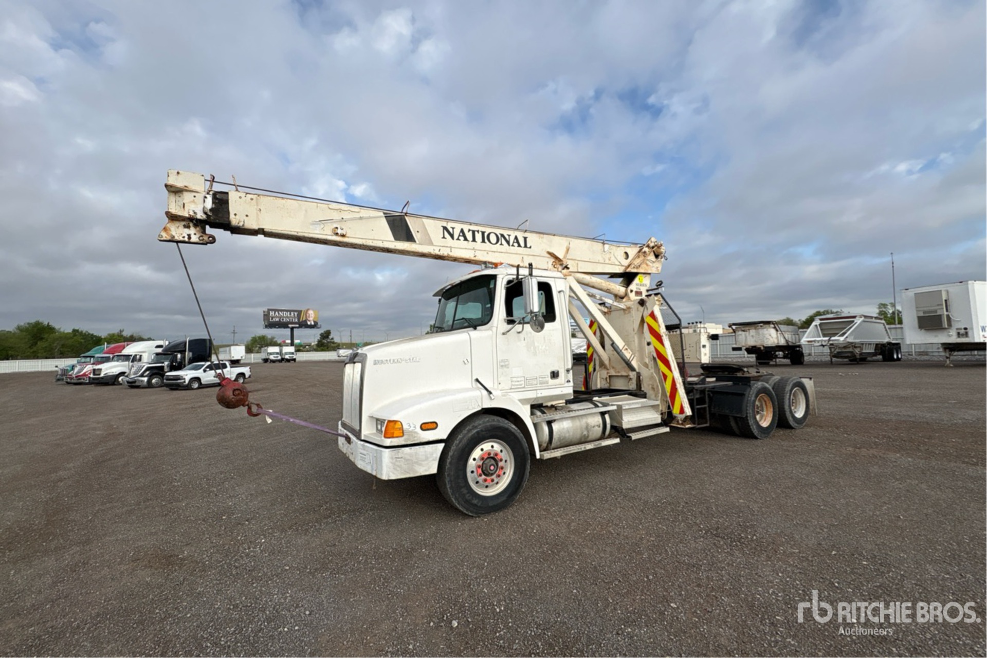 Cummins M11 6 Cylinder Diesel Engine, 1997 US EPA Label, Engine Brake, Eaton Fuller 9-Speed Manual Transmission, Differential Lock, 16970 lb Front Axle, 40000 lb Rears, Spicer DS-405 Drive Axles, 56970 lb GVWR, Air Ride Cab, Aluminum Front Wheels, 385/65R22.5 Front Tires, 11R22.5 Rear Tires, Double Frame, Hendrickson Air Ride Suspension, 253 in Wheelbase, PTO, 2 Section Boom, Ovrehaul Ball A-Outriggers, Hydraulic Crane