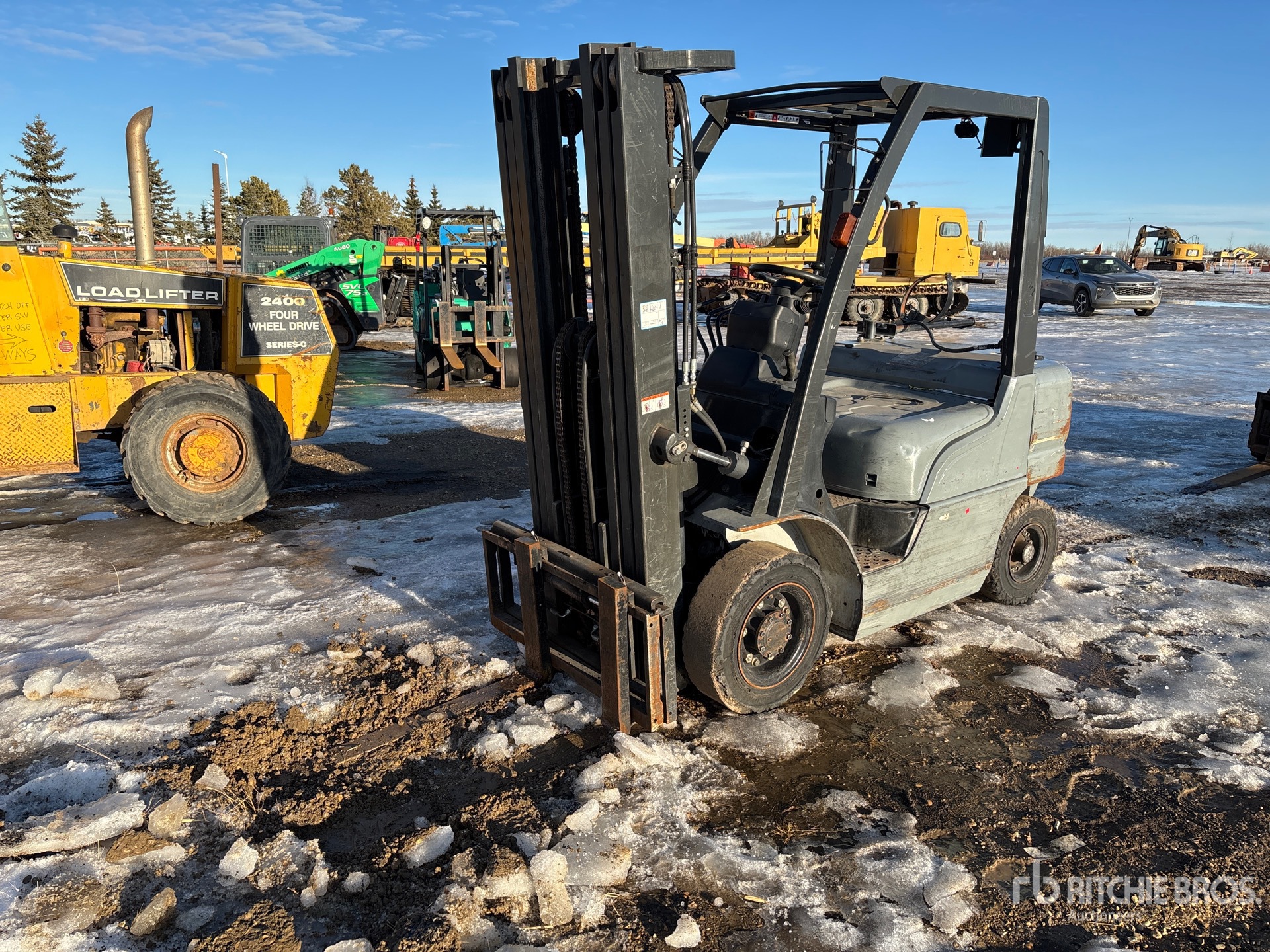 3 Stage Mast, 187 in Max Lift Height, 80 in Lowered Mast Height, 42 in Forks, Solid Pneumatic Tires, 2007 US EPA Label, CARB Compliant, Nissan 4 Cylinder 2.1 L LPG Engine