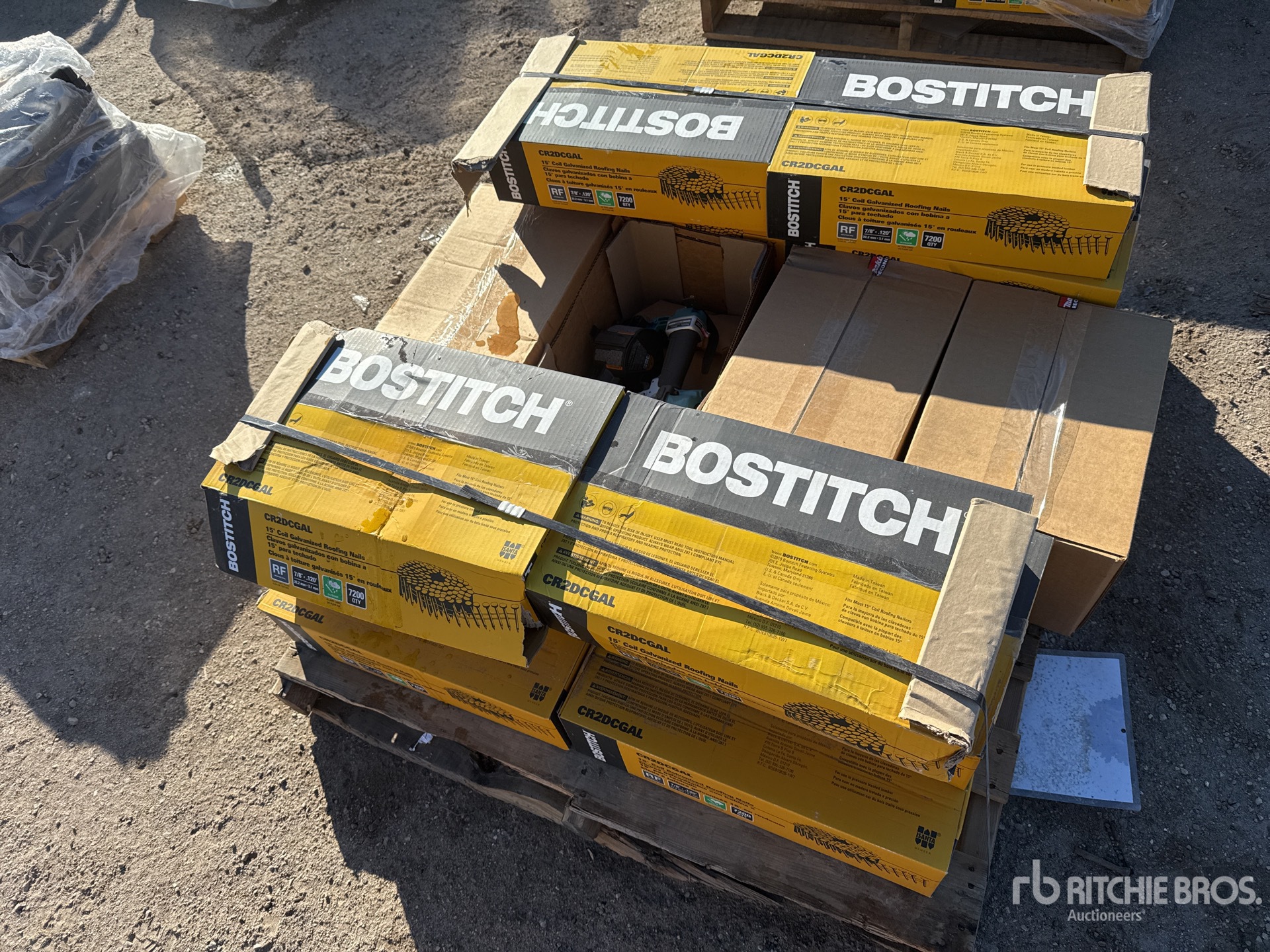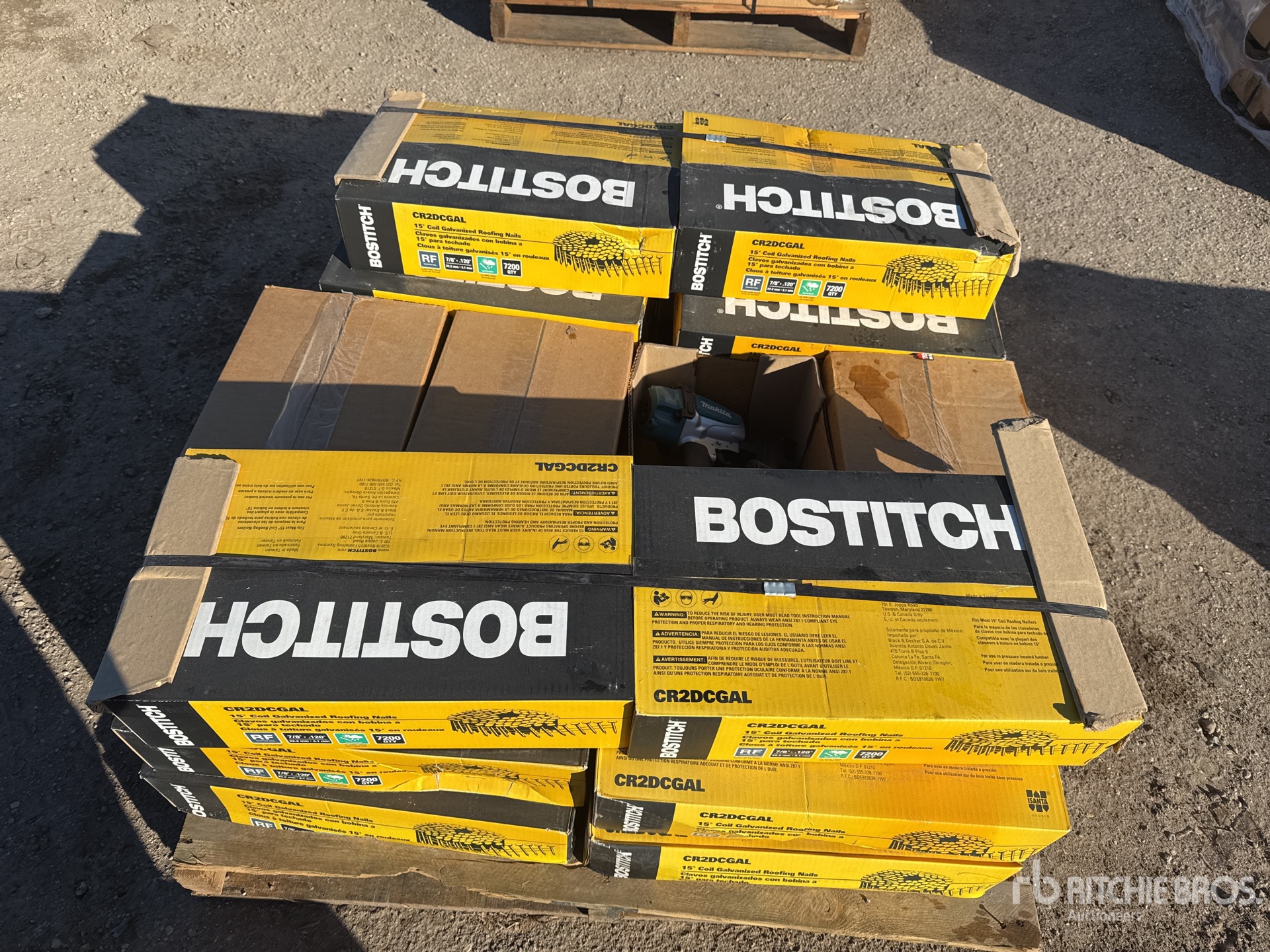 Quantity of (12) Stanley Bostitch AN454 7/8 in Coil Roofing Nails and (4) AN454 MAKITA Roofing Air Nail Gun (Unused)