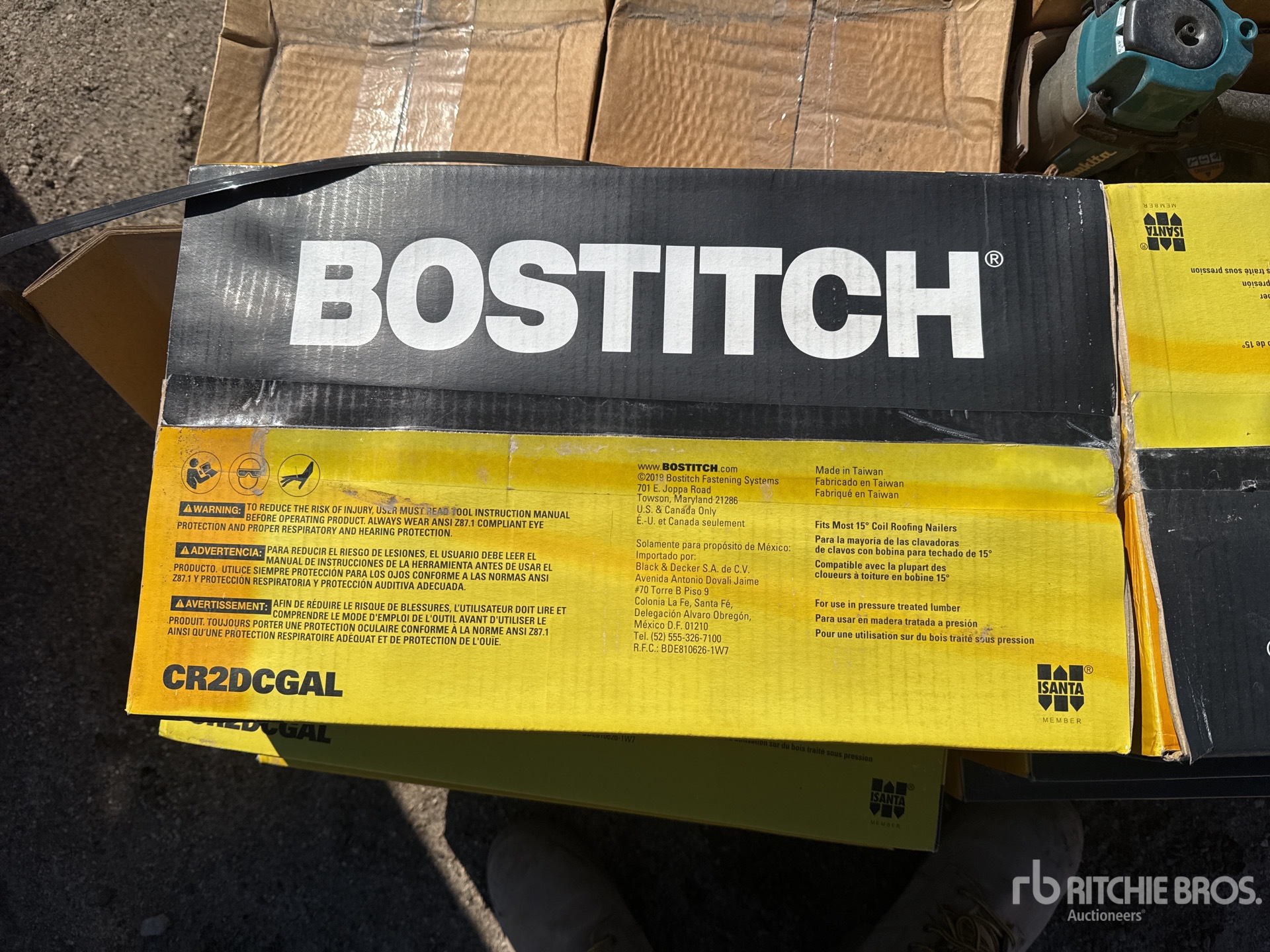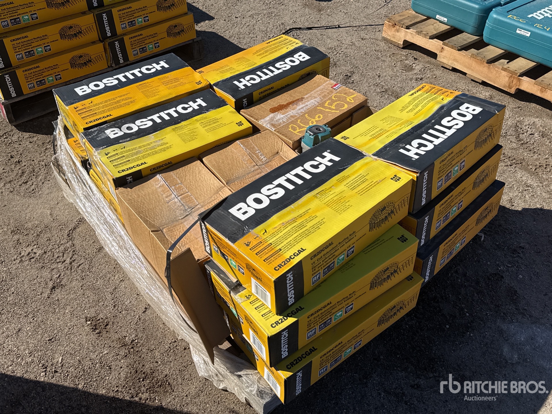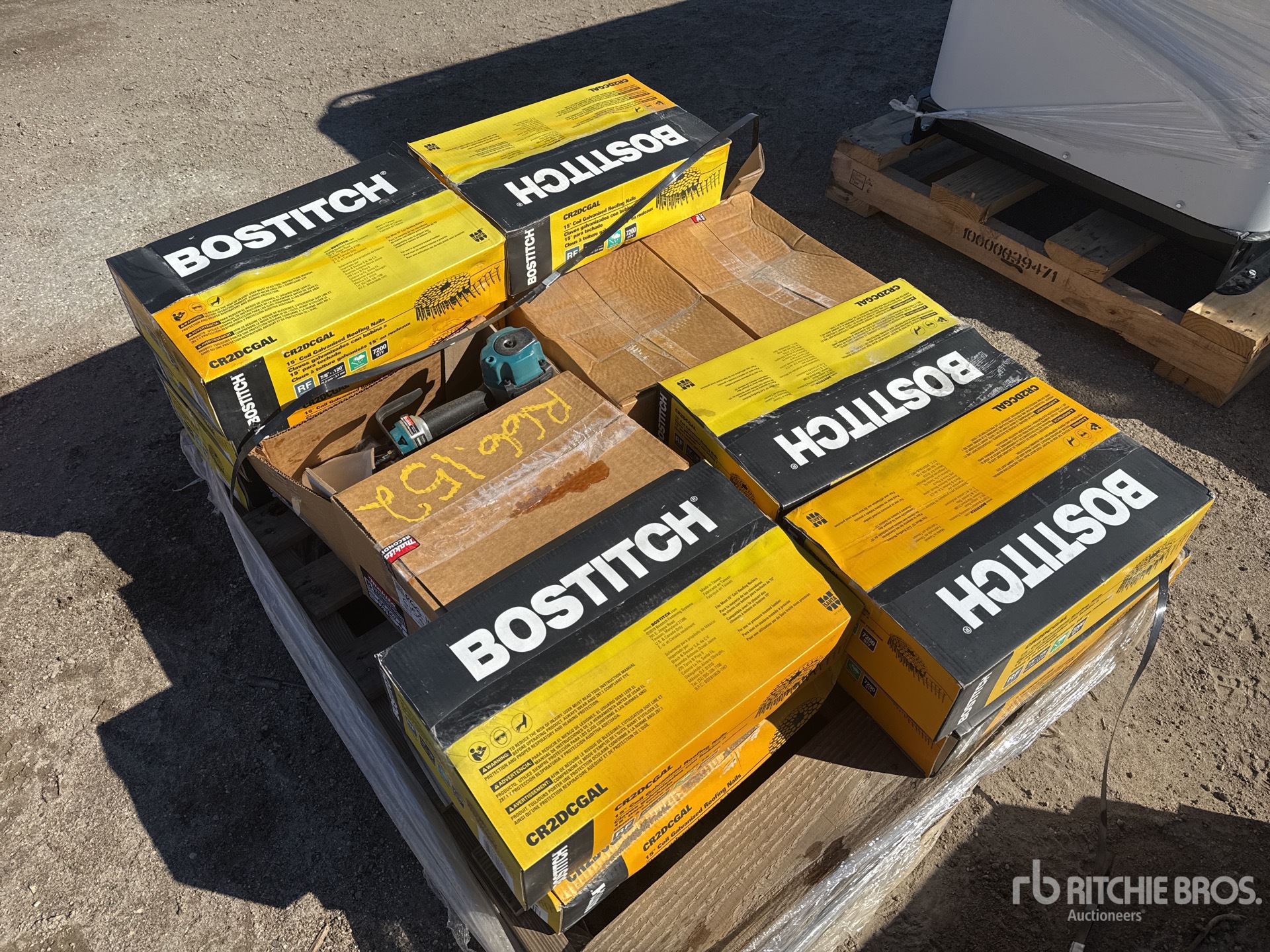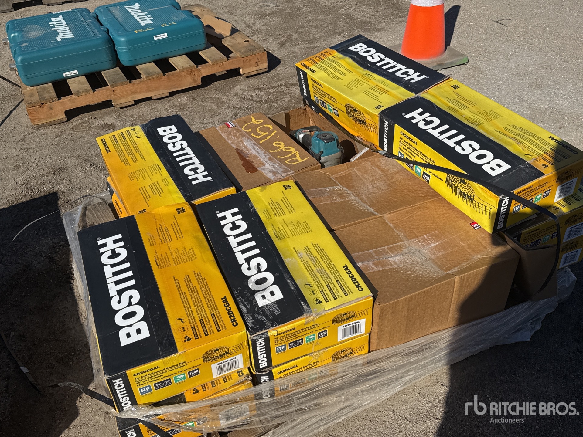 Quantity of (12) Stanley Bostitch AN454 7/8 in Coil Roofing Nails and (4) AN454 MAKITA Roofing Air Nail Gun (Unused)