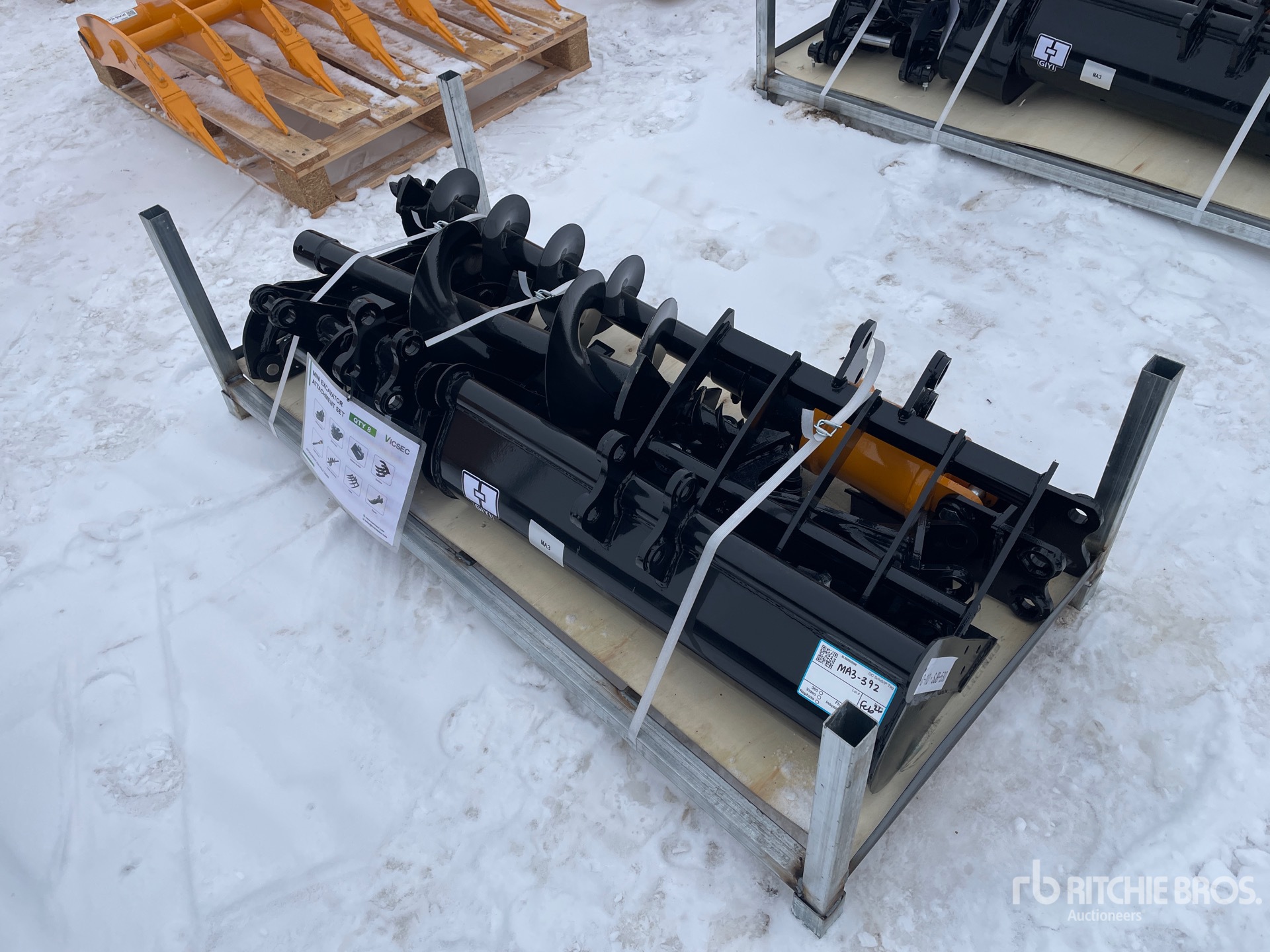 (1) Rake, (1) Ripper, (1) Grapple, (1) Auger w/ 12 in & 16 in Auger Bits, (1) 8 in Narrow Bucket, (1) 24 in Bucket, (1) 32 in Bucket