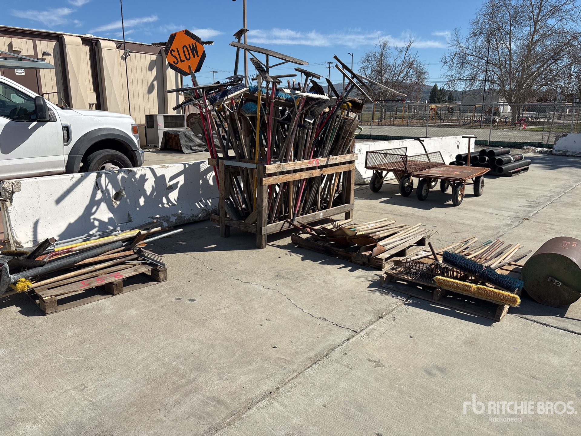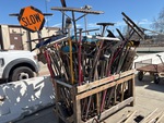 Rakes, Brooms, Shovels, Signs, In A Storage Rack